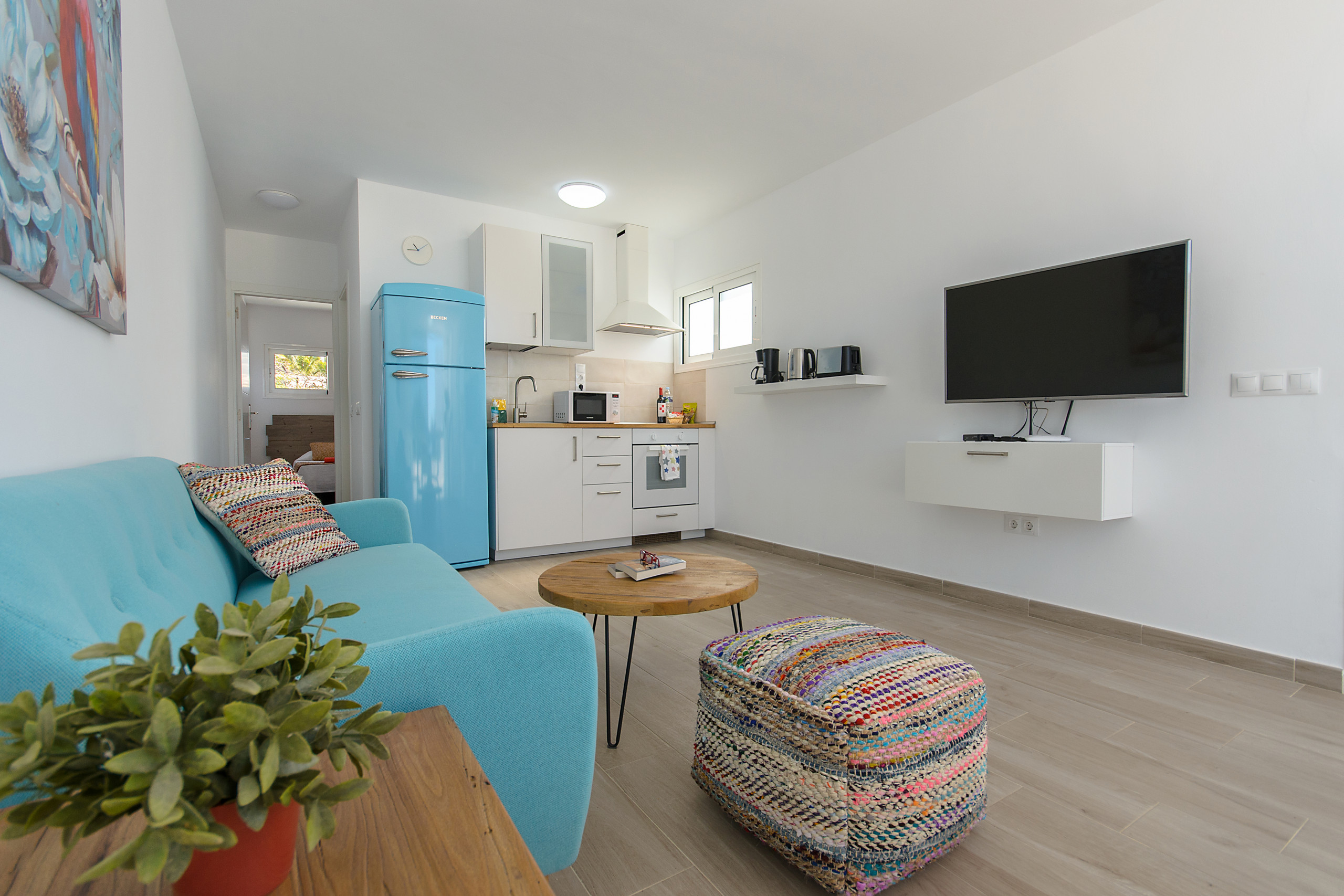 El bonito salón ofrece un cómodo sofá, aire acondicionado y bomba de calor, Smart TV con canales satélite y Internet gratis de alta velocidad con Fibra Óptica de 600MB. Además, cuenta con un coqueto e intimo espacio de comedor.