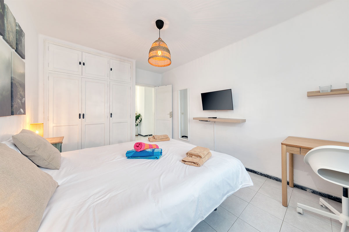 La vivienda dispone de dos dormitorios: uno con cama de matrimonio y otro con dos camas individuales, ambos con amplios armarios empotrados para guardar todas tus pertenencias.