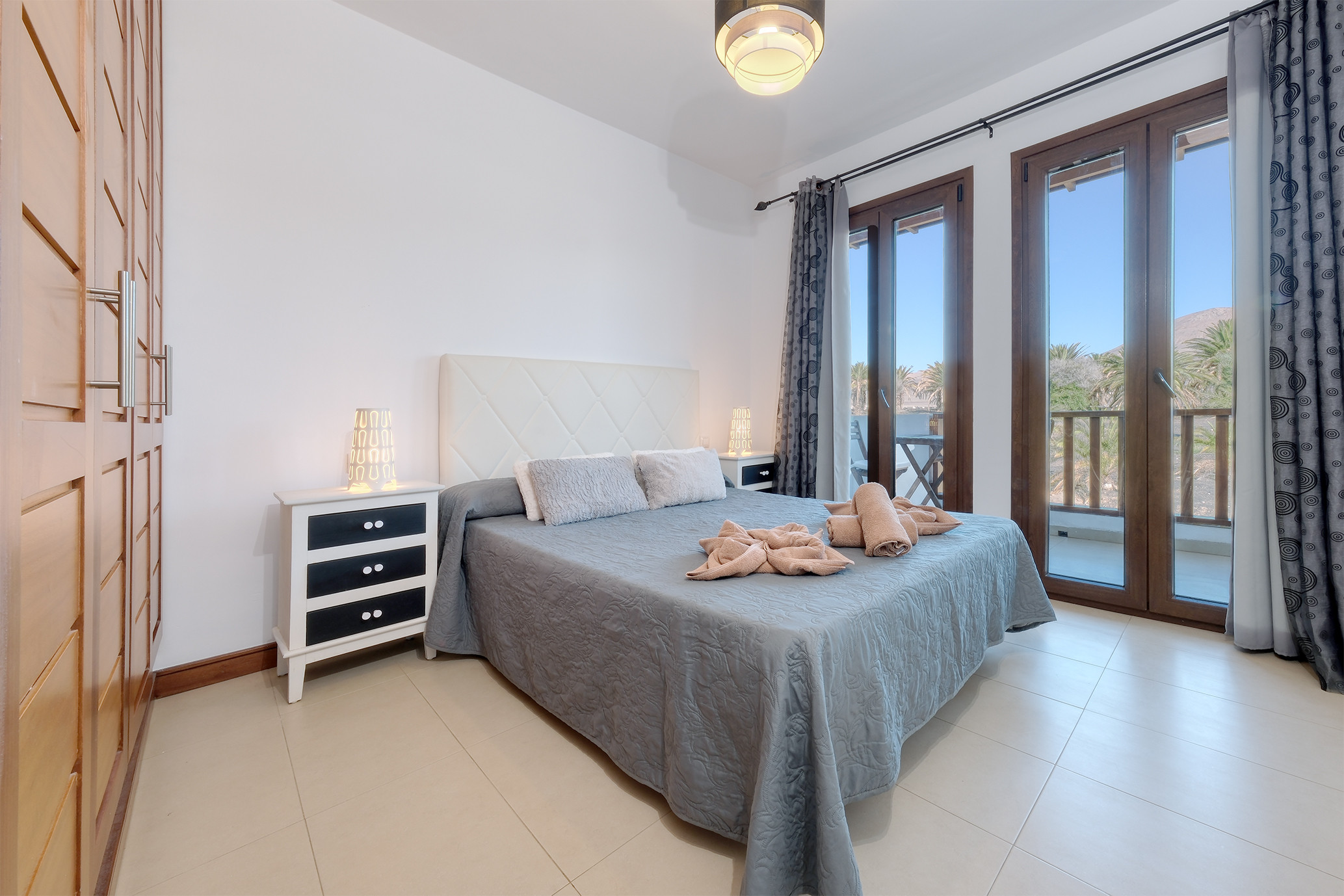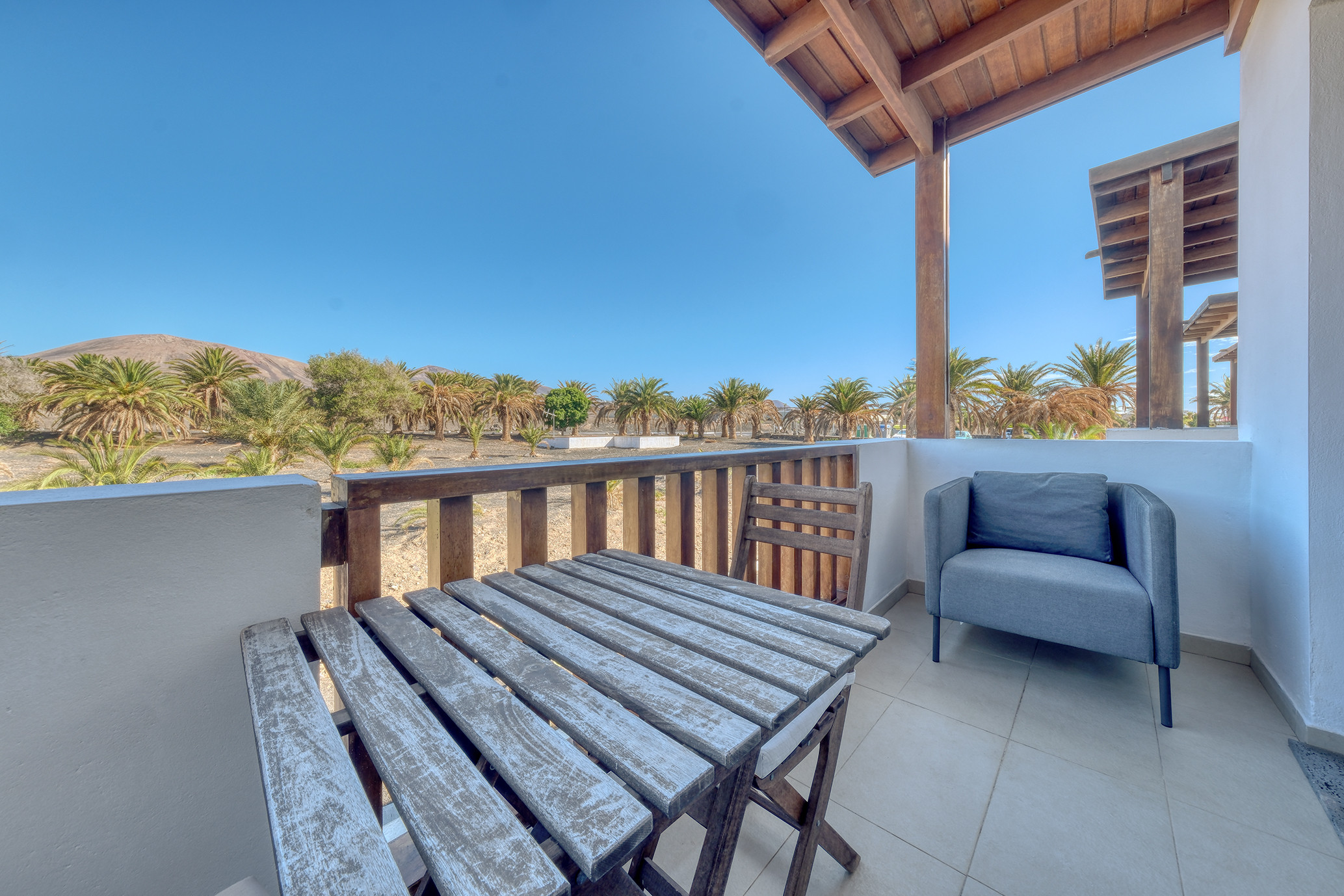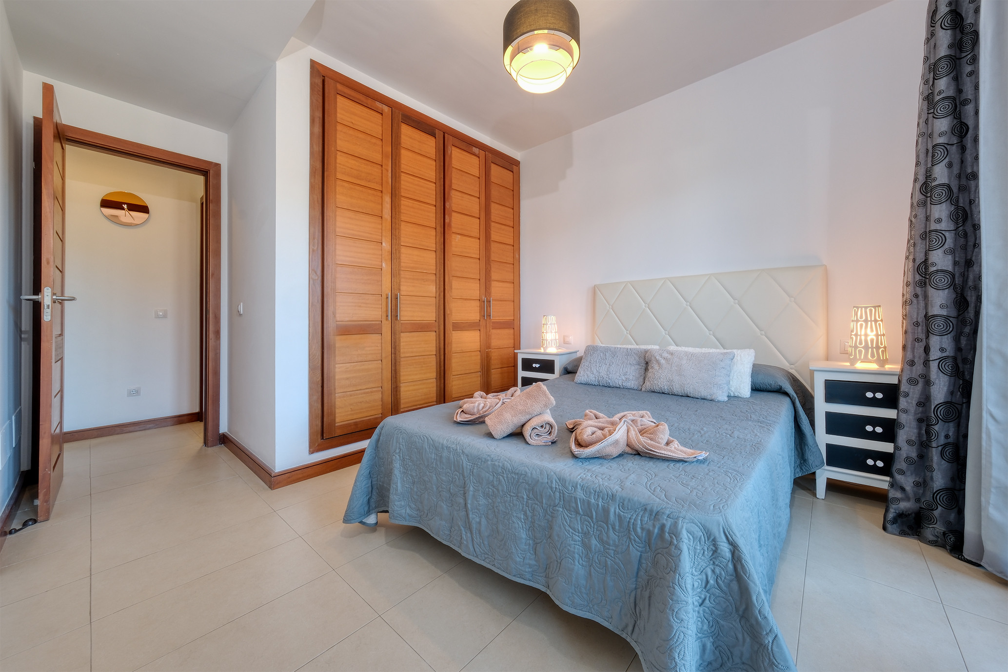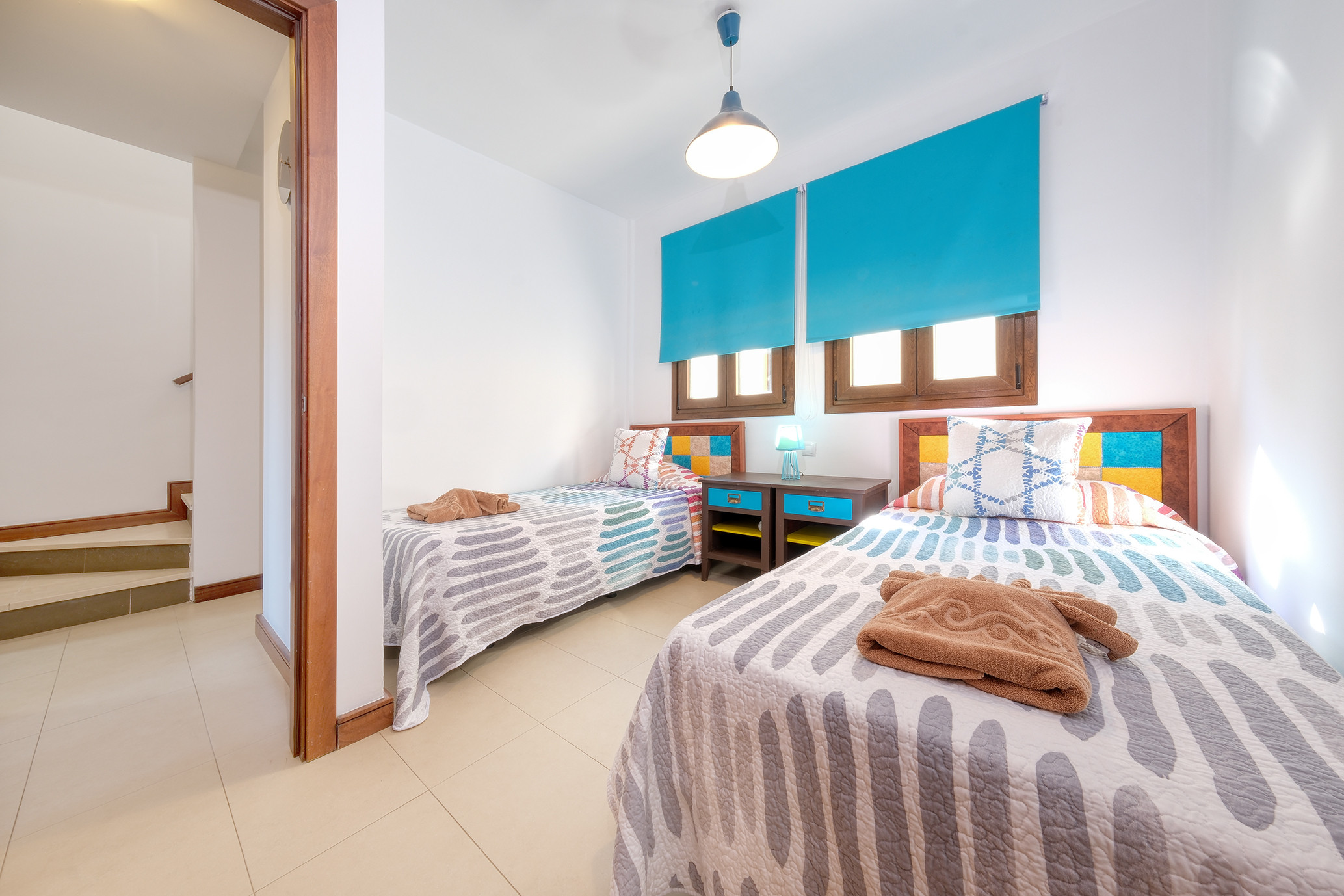 En la primera planta se ubican dos amplios dormitorios. El dormitorio principal dispone de una cama king-size, armarios espaciosos y un balcón privado con impresionantes vistas a los volcanes. El segundo dormitorio, con dos camas individuales y un gran armario, es ideal para familias o grupos de amigos. Ambos comparten un baño completo con bañera.