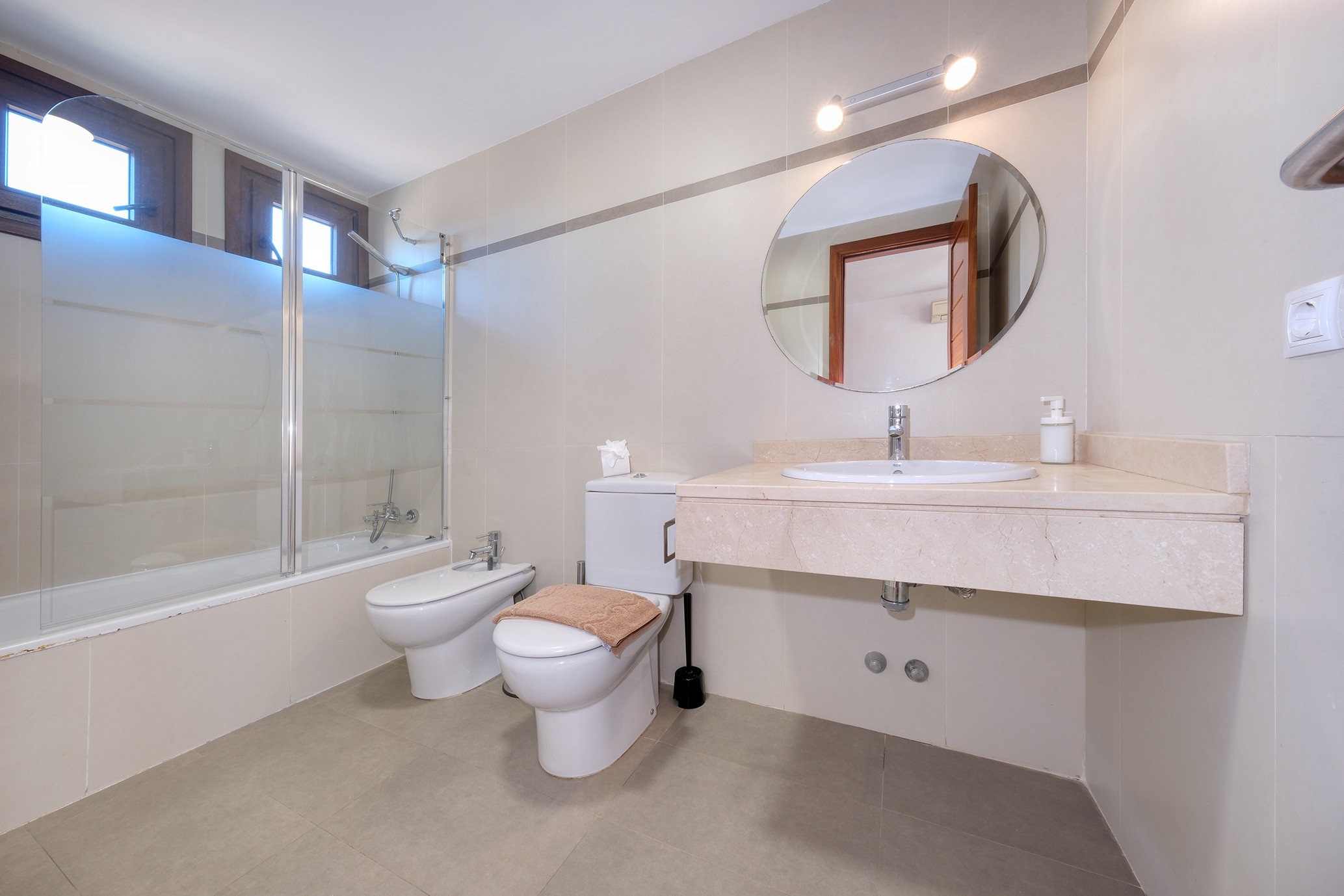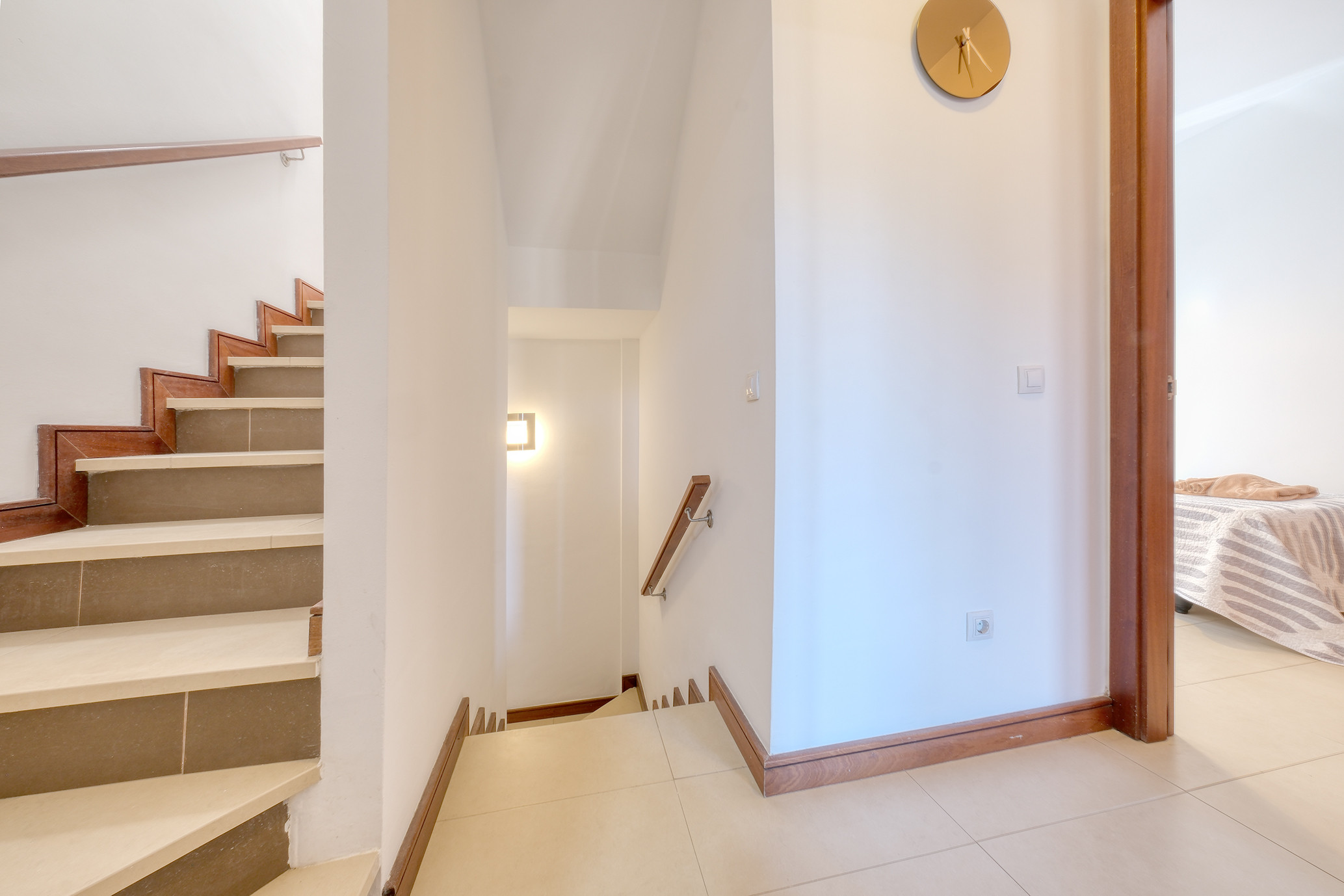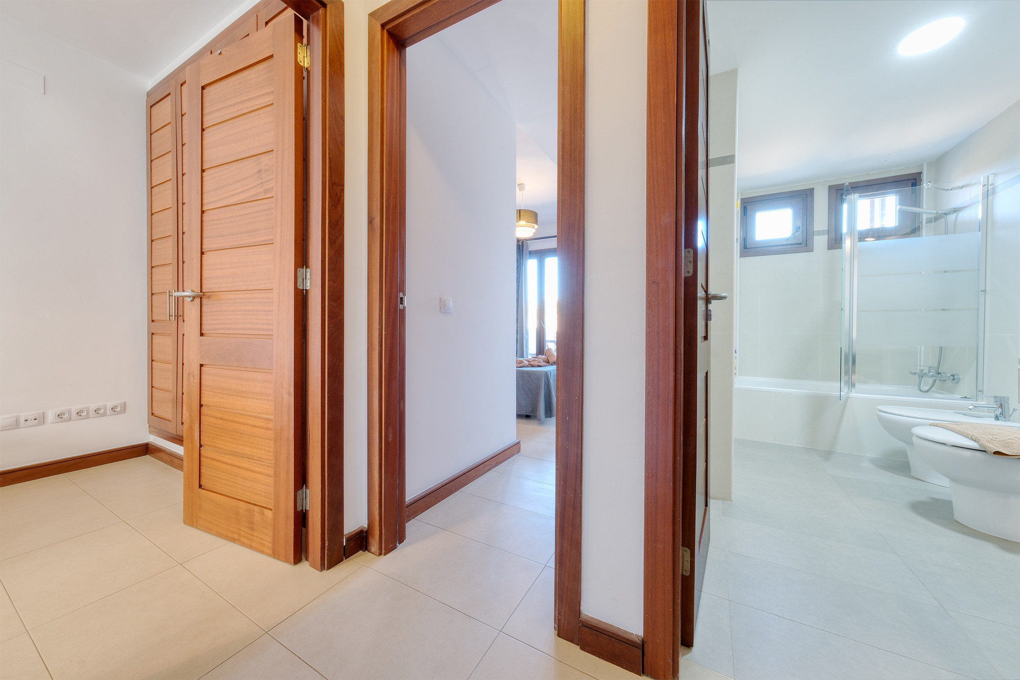 La planta superior alberga un tercer dormitorio muy amplio, con aire acondicionado y baño en suite con bañera, lo que lo convierte en un espacio ideal para mayor privacidad y confort.