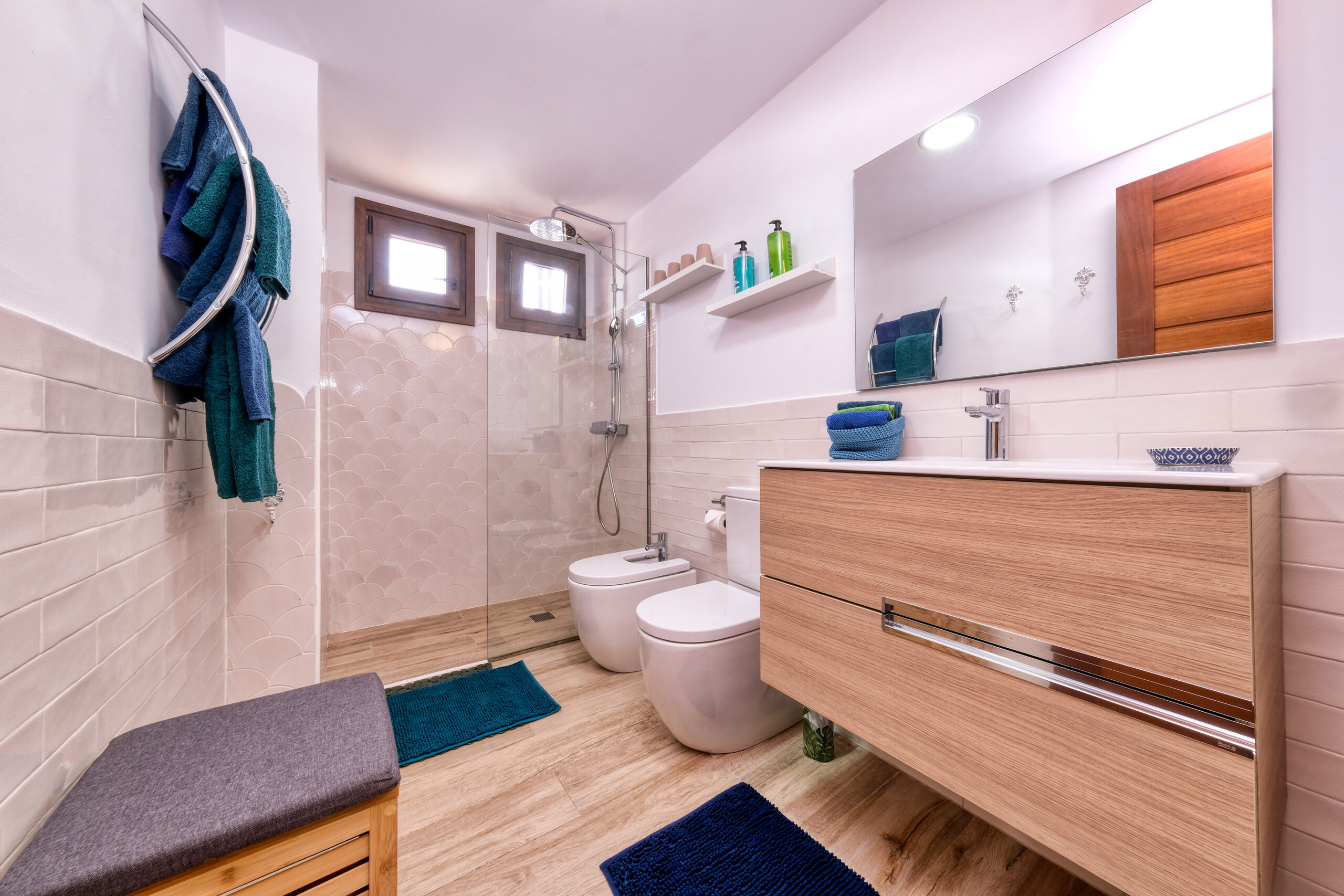 Cuenta con un baño equipado con plato ducha, secador y todas las comodidades, además de un aseo.
