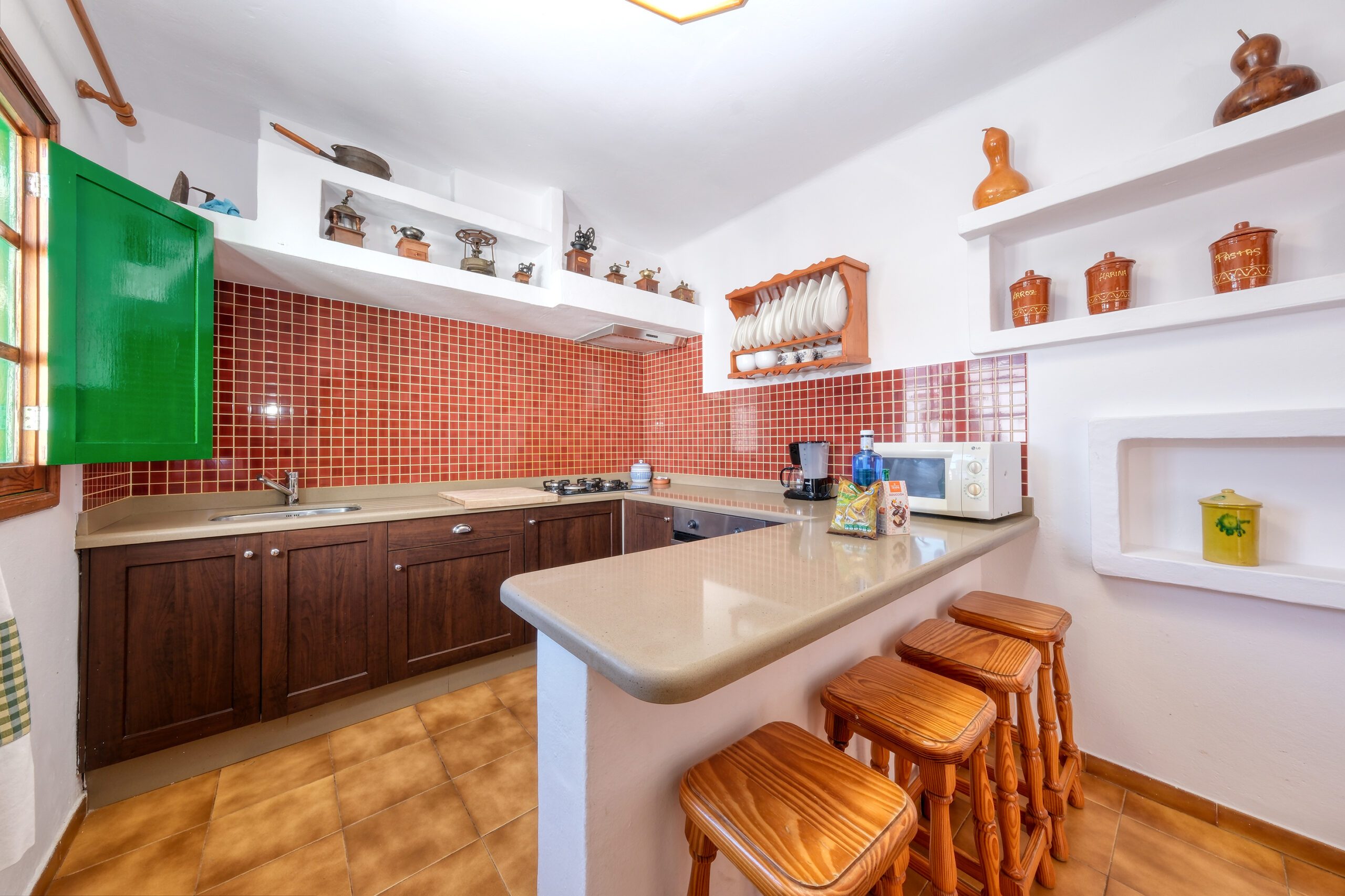 El salón-comedor cuenta con un sofá de mampostería, chimenea y televisor. Es importante señalar que la casa no dispone de canales en español. El espacio incluye además una mesa de comedor para seis comensales y un aparador. La cocina se une al comedor por un arco de cantos de color rojo y está totalmente equipada con horno, placa de 4 fuegos, nevera, congelador, tostadora, hervidor de agua y cafetera.