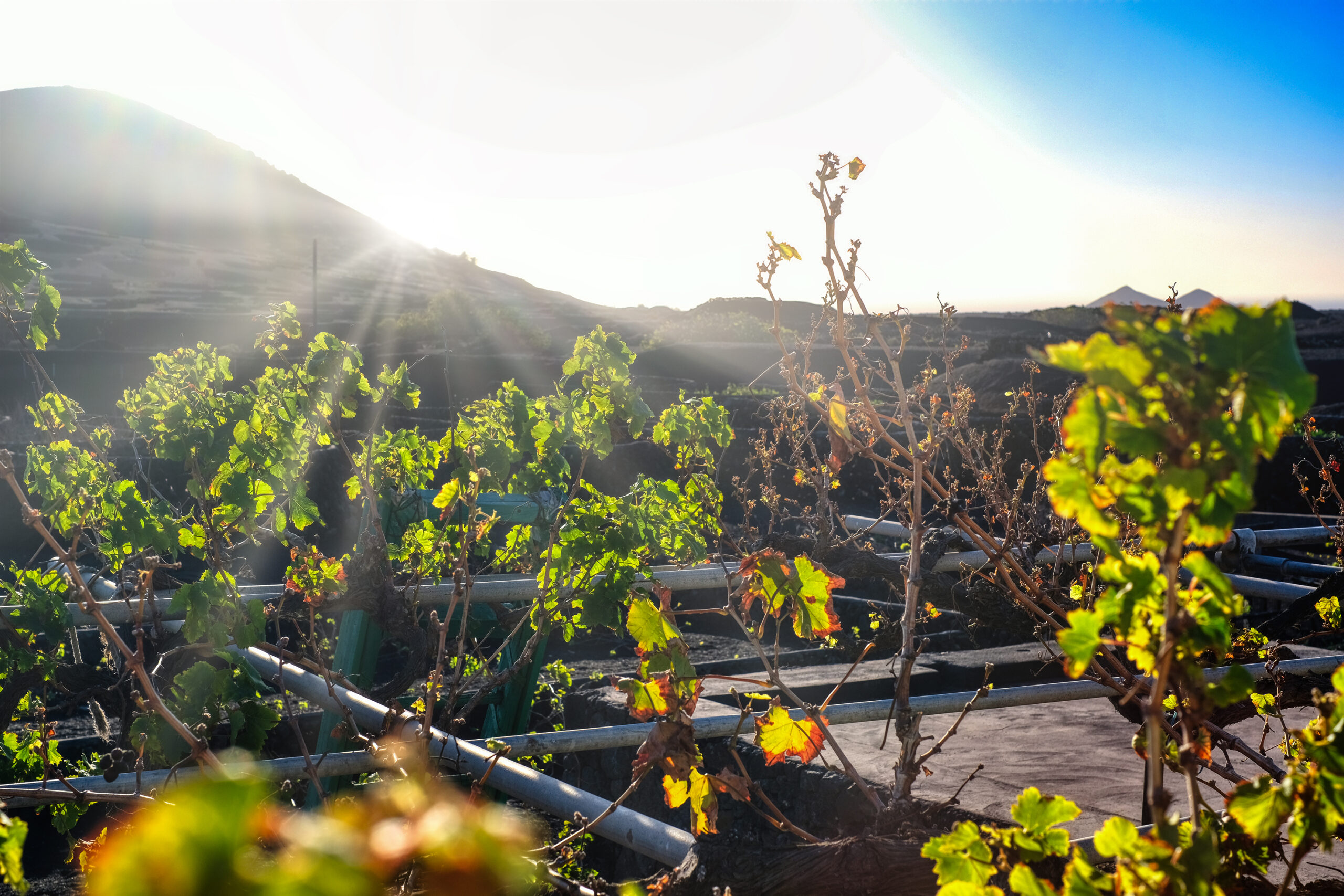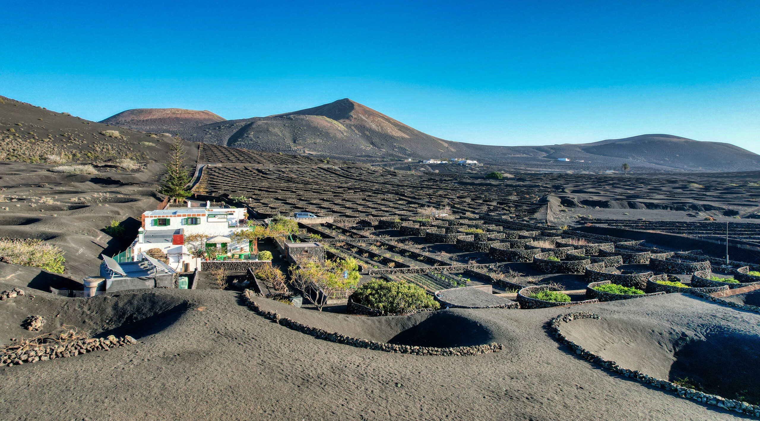 Ubicada en un hermoso valle entre las montañas de Diama y El Chupadero, a 450 metros de altitud, dentro del emblemático Paisaje Protegido de La Geria, rodeado de viñedos cultivados sobre cenizas volcánicas, la finca de 50.000 m2 limita al oeste con el Parque Nacional de Timanfaya y ofrece vistas al mar y a los volcanes, en un paraje natural privilegiado.