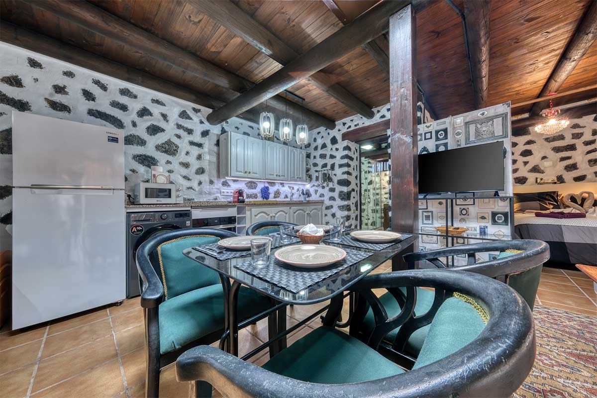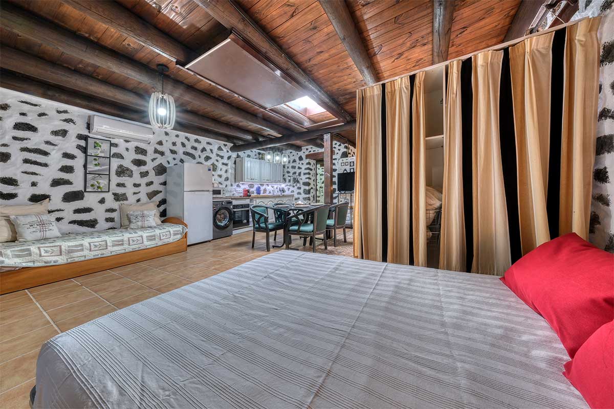 El Apartamento 2 (Planta Baja) es un amplio estudio con capacidad para hasta 6 personas. Dispone de dos camas de matrimonio y una cama individual extraíble, así como una cocina americana totalmente equipada con horno, microondas, cafetera, utensilios de cocina y una mesa de comedor donde disfrutar de desayunos familiares o cenas especiales.