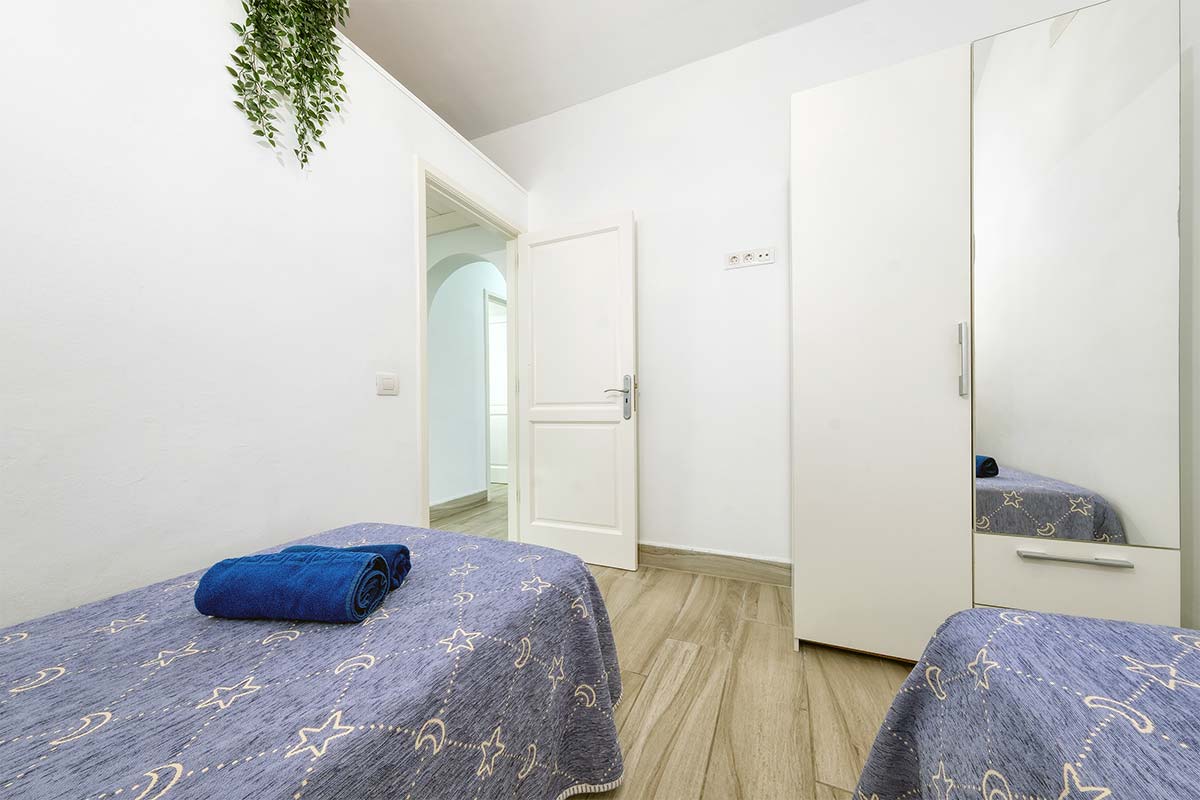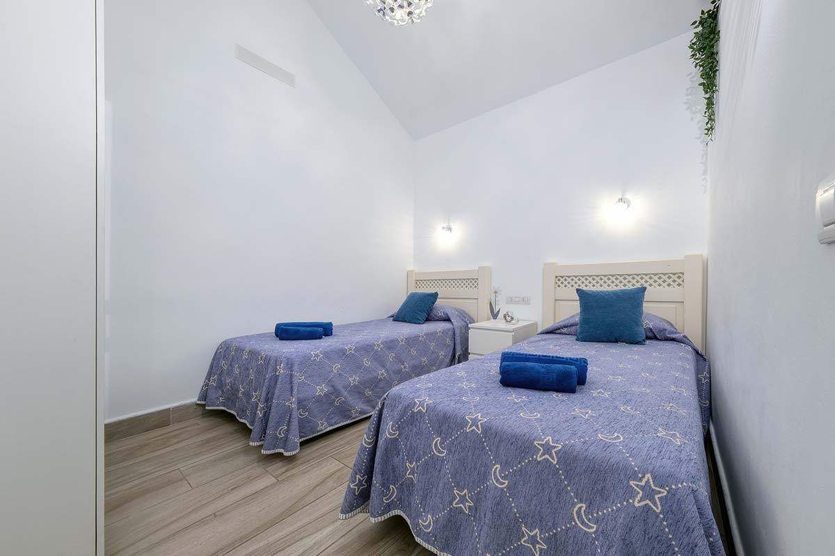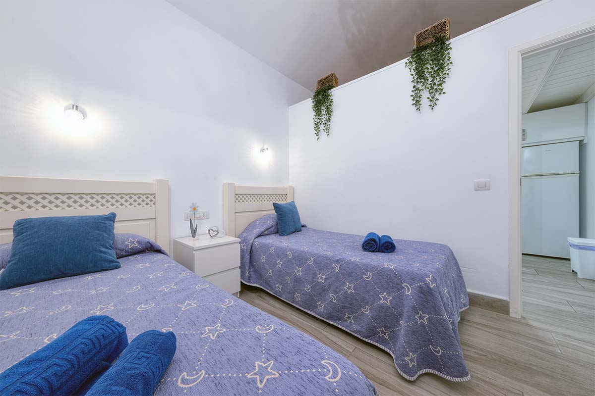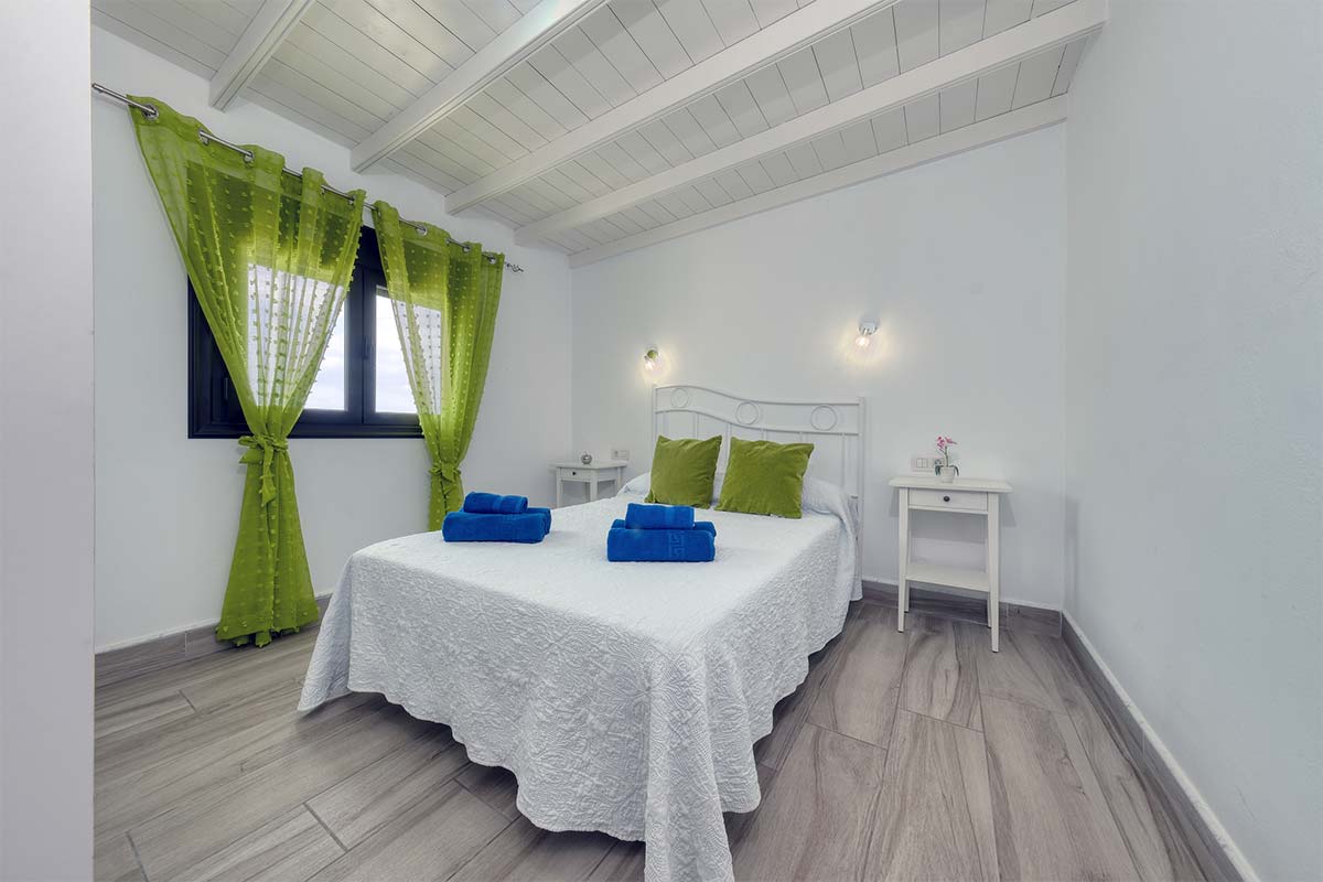 El dormitorio principal dispone de una cama doble, perfecta para relajarse tras un día explorando la isla, mientras que el segundo dormitorio ofrece dos camas individuales, ideal para familias o amigos que viajan juntos.