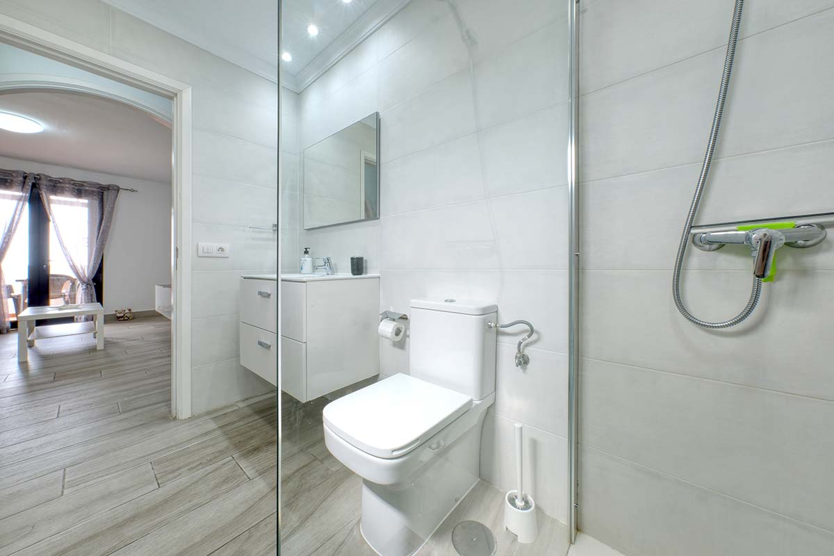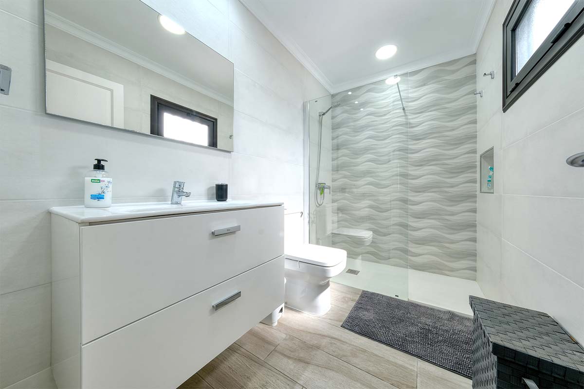 El baño destaca por su estilo moderno y funcional. Dispone de una ducha espaciosa, espejo con iluminación, secador de pelo y suficiente espacio de almacenaje para artículos de aseo. Su diseño limpio y minimalista aporta frescura y armonía a la vivienda.