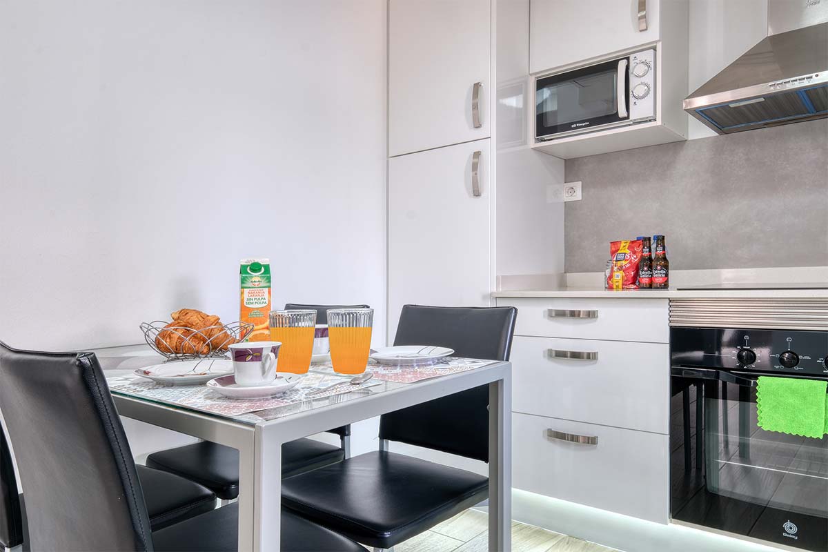 La cocina independiente, equipada con vitrocerámica, nevera, congelador, microondas, cafetera, tostadora, hervidor de agua, vajilla y utensilios de cocina, ofrece todo lo necesario para cocinar como en casa. Junto a ella, un comedor con mesa amplia y sillas cómodas crea el entorno perfecto para compartir comidas y buenos momentos.