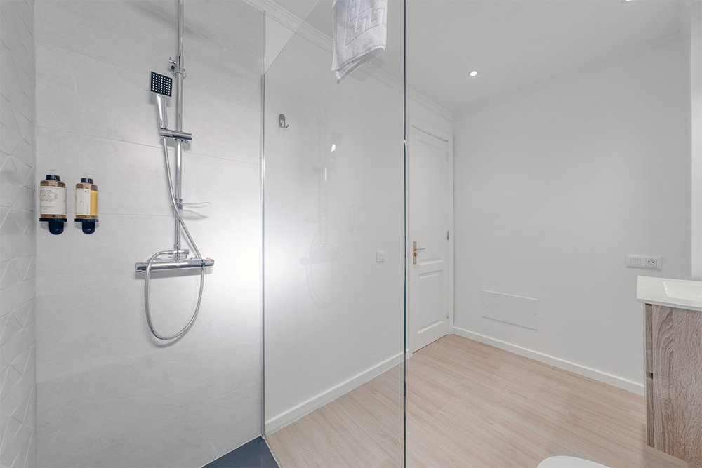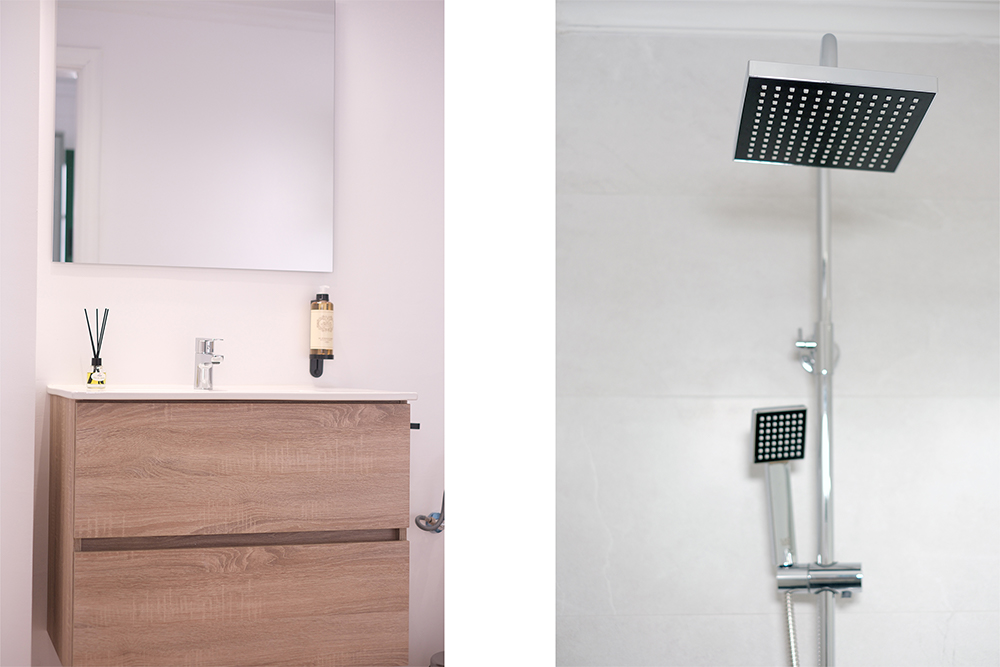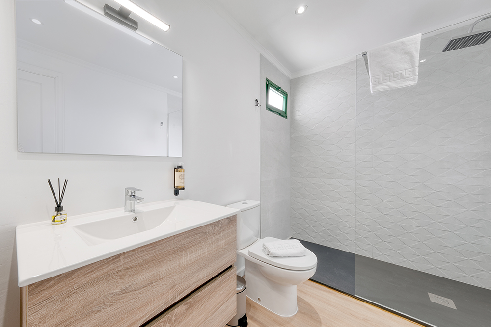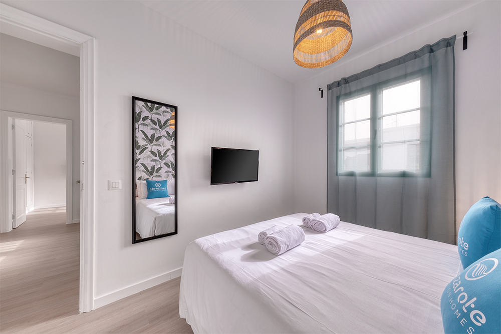 La casa cuenta con dos elegantes dormitorios con camas de matrimonio de ensueño y un tercer dormitorio con dos camas individuales ideales para niños o amigos. Cada espacio ha sido cuidadosamente diseñado para combinar confort, estilo y luminosidad, creando un ambiente cálido y sofisticado.