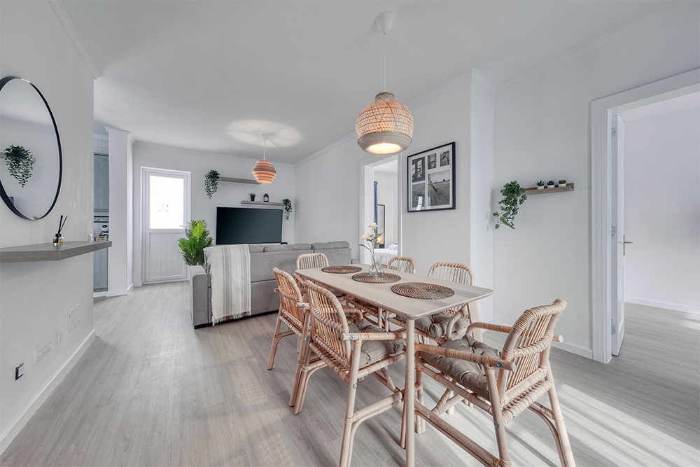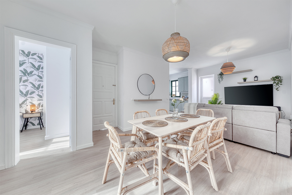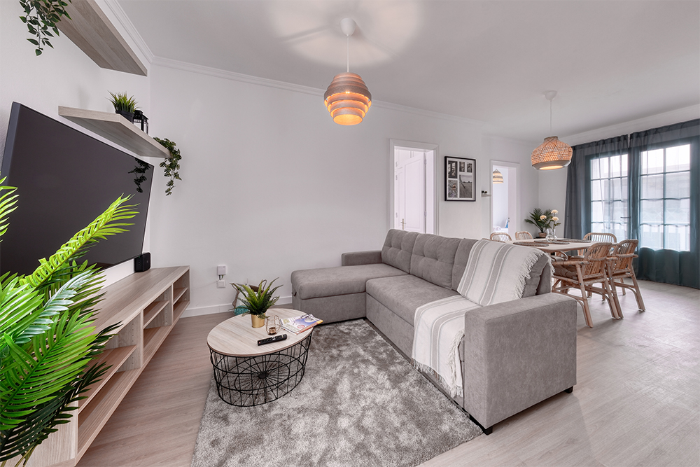 Relájate en un salón amplio y luminoso con sofá esquinero y 4 televisores con TV satélite en varios idiomas, perfecto para descansar después de un día de sol y playa.