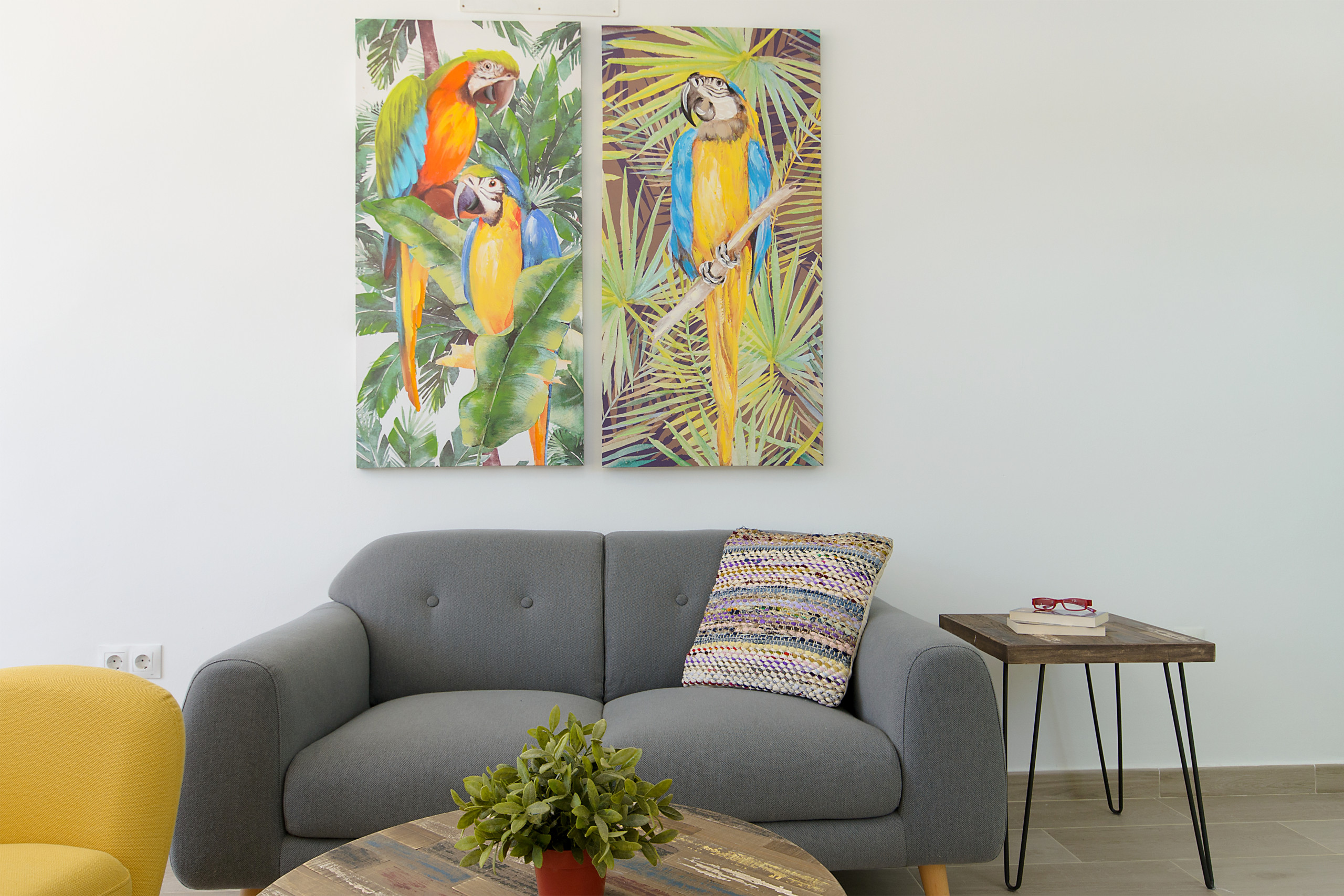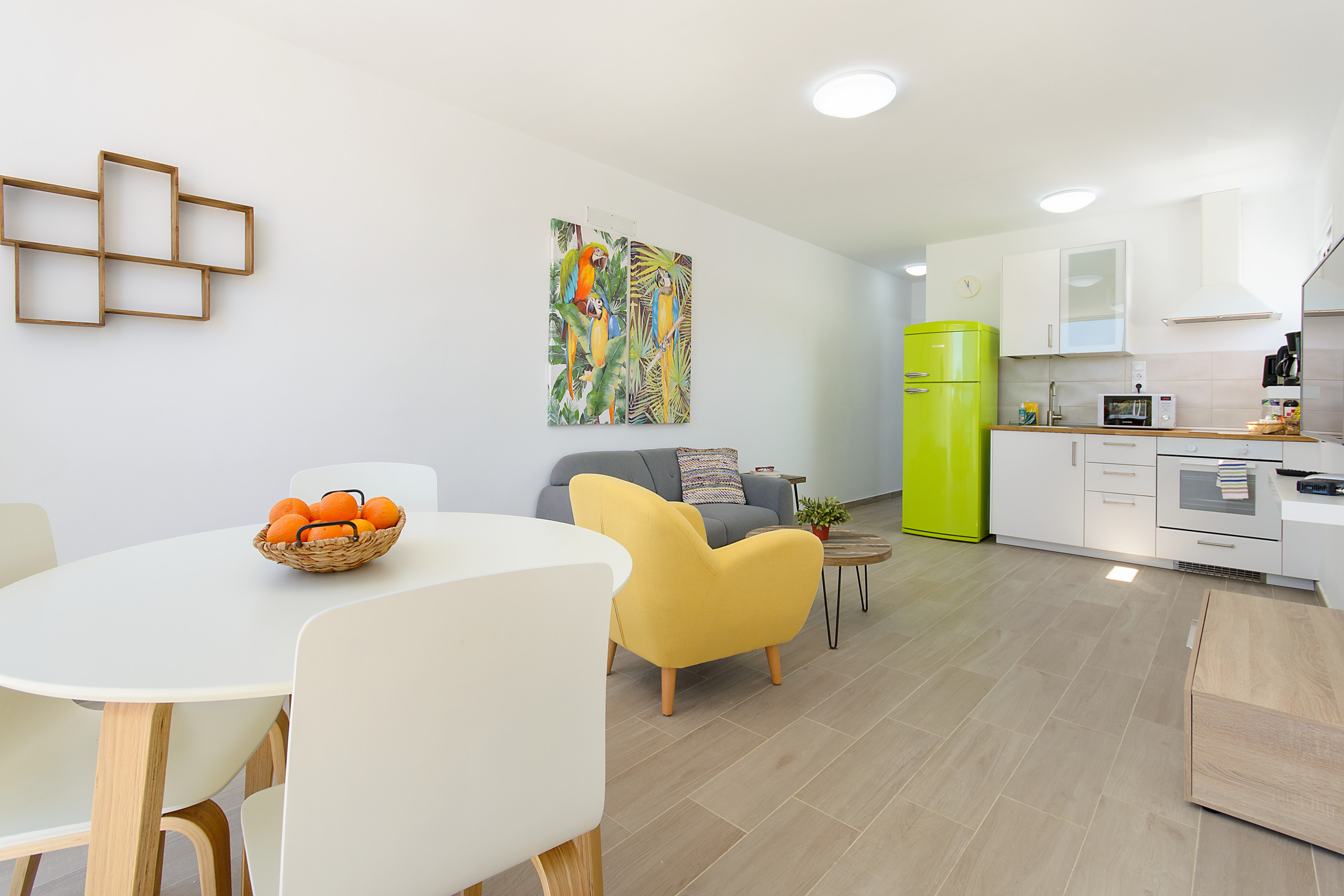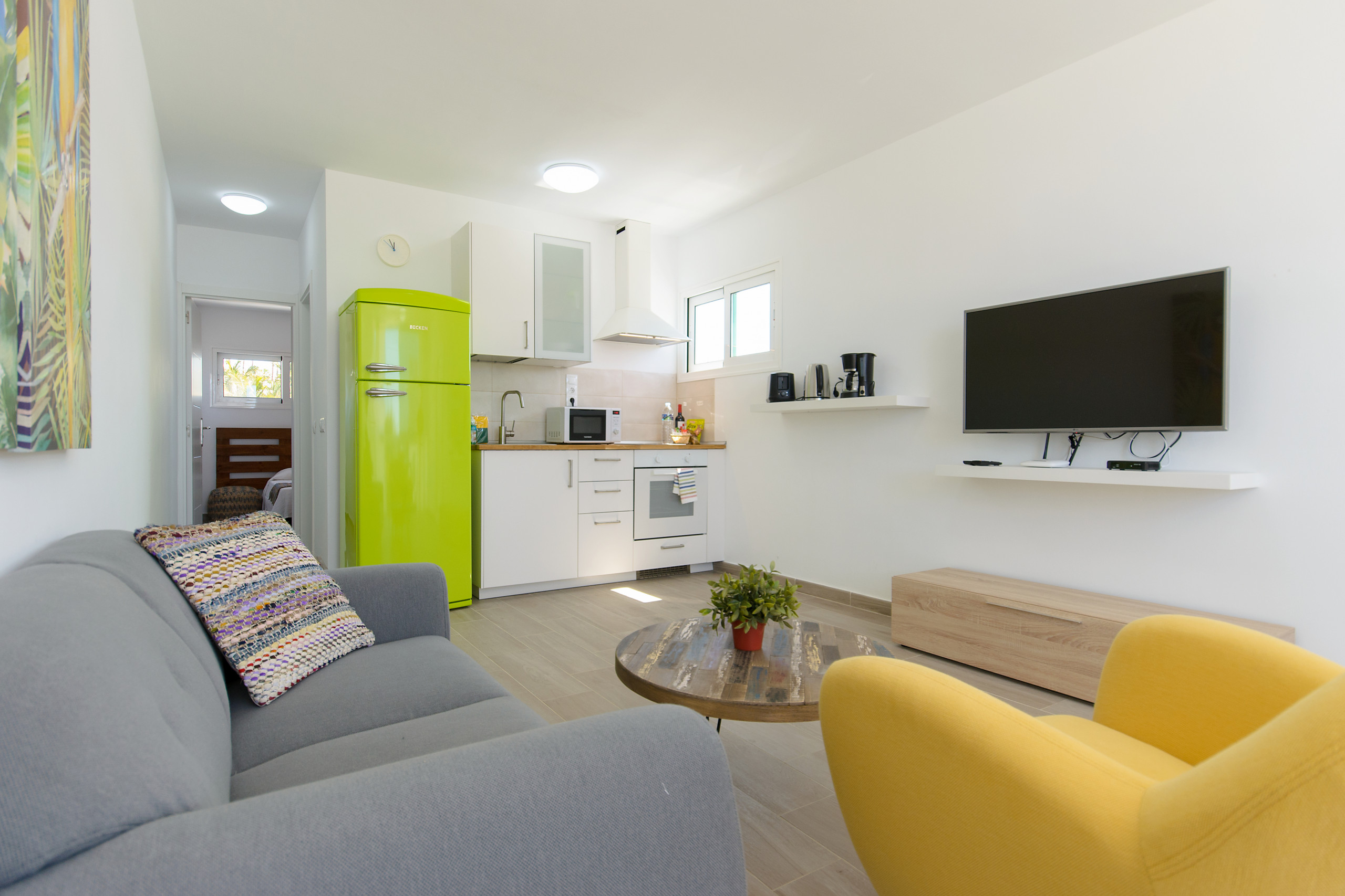 El bonito salón ofrece un cómodo sofá, aire acondicionado y bomba de calor, Smart TV con canales satélite y Internet gratis de alta velocidad con Fibra Óptica de 600MB. Además, cuenta con un coqueto e intimo espacio de comedor.