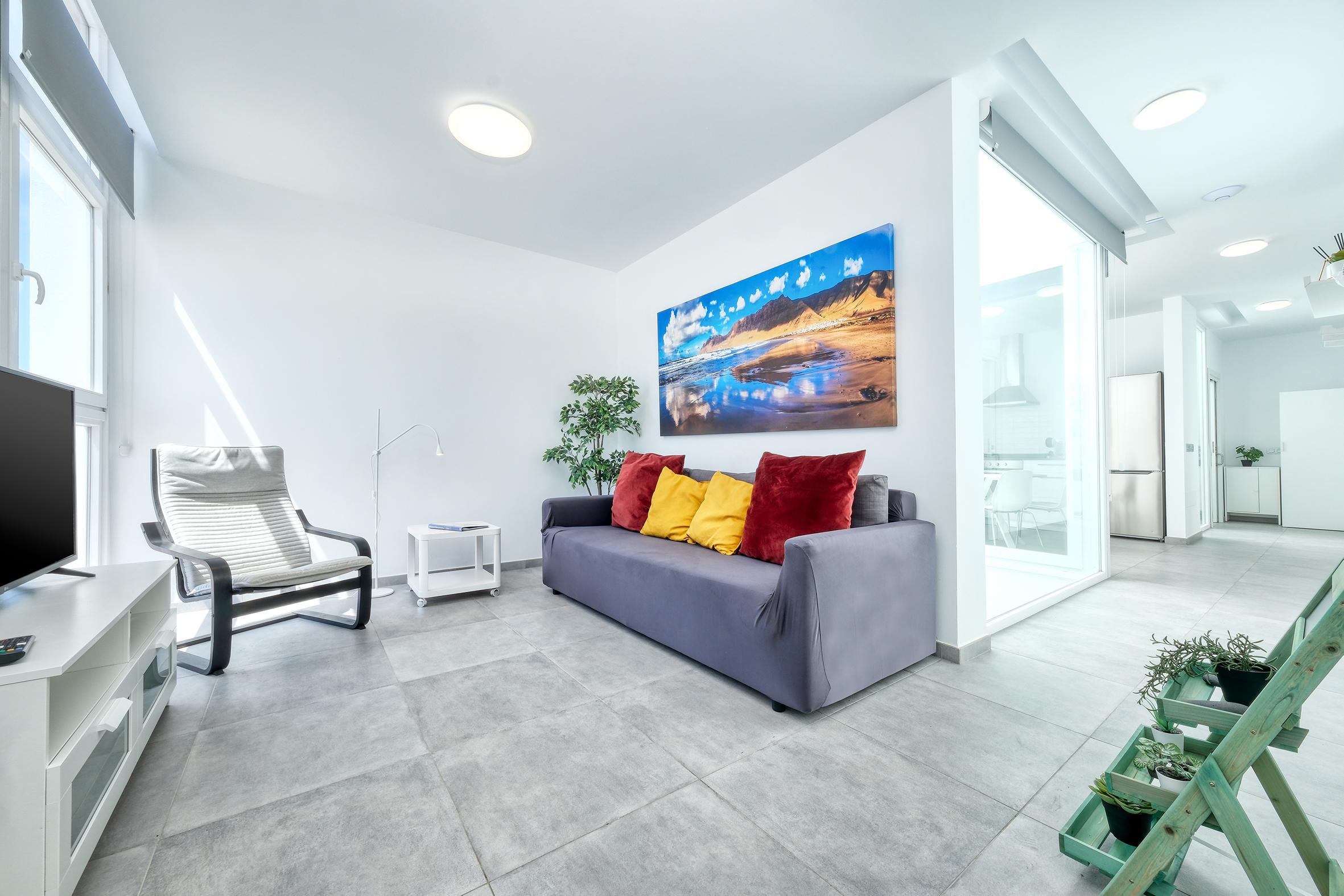 Sala de estar luminosa con un gran sofá cama y Smart TV