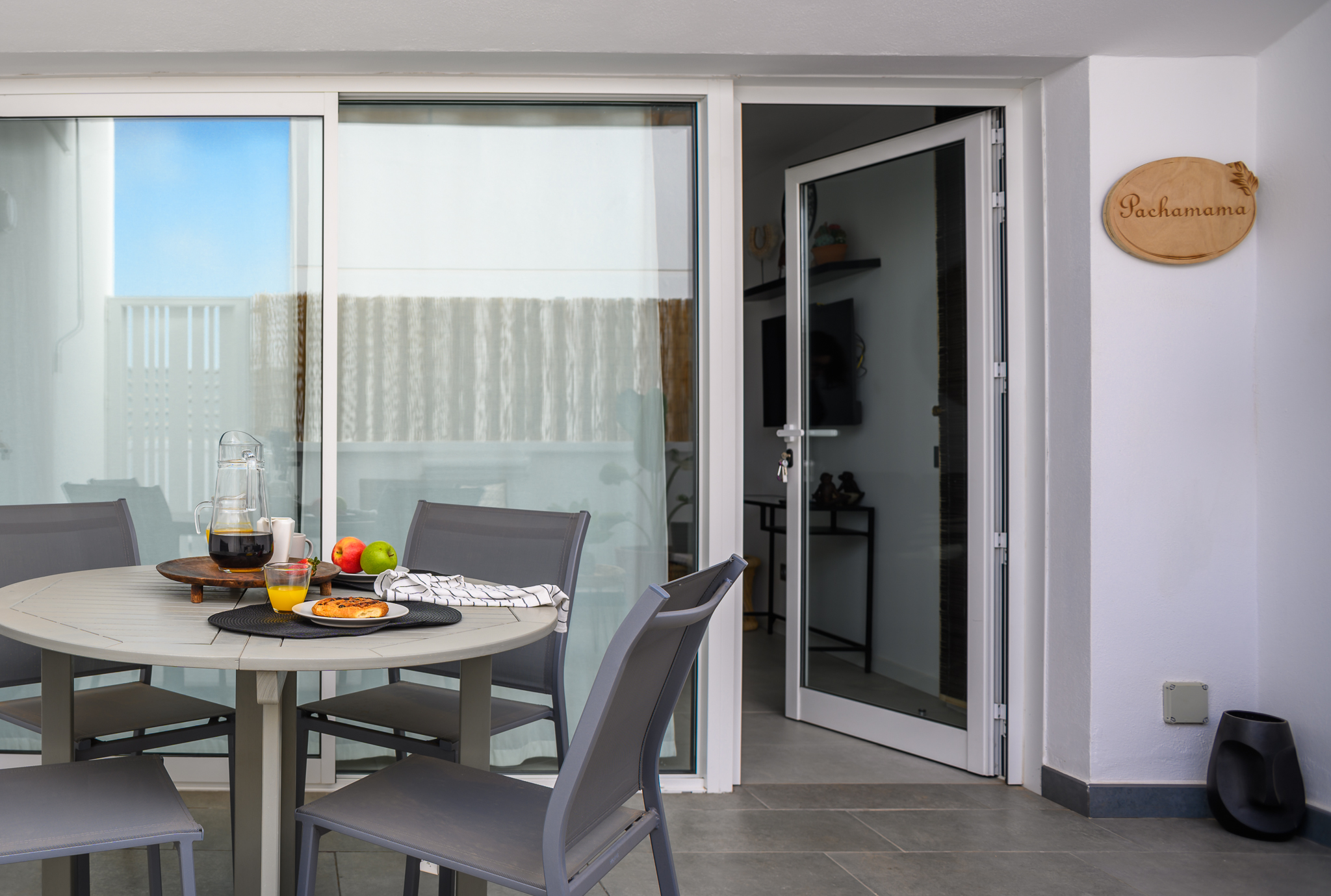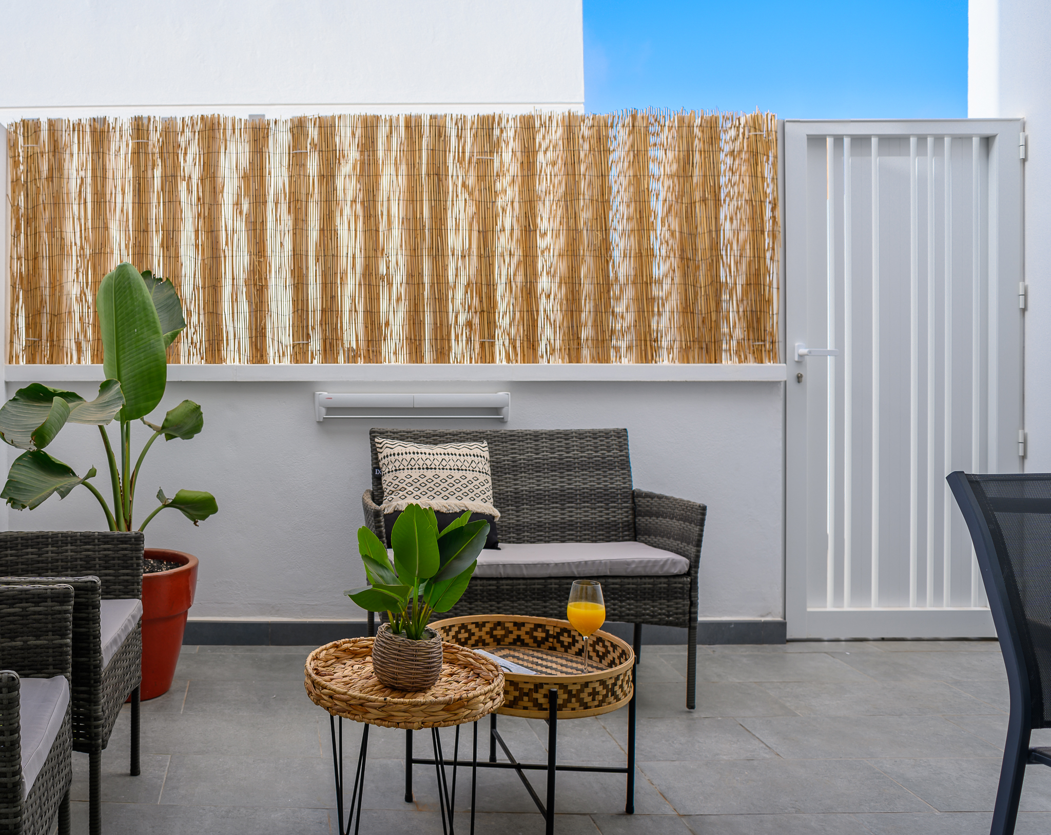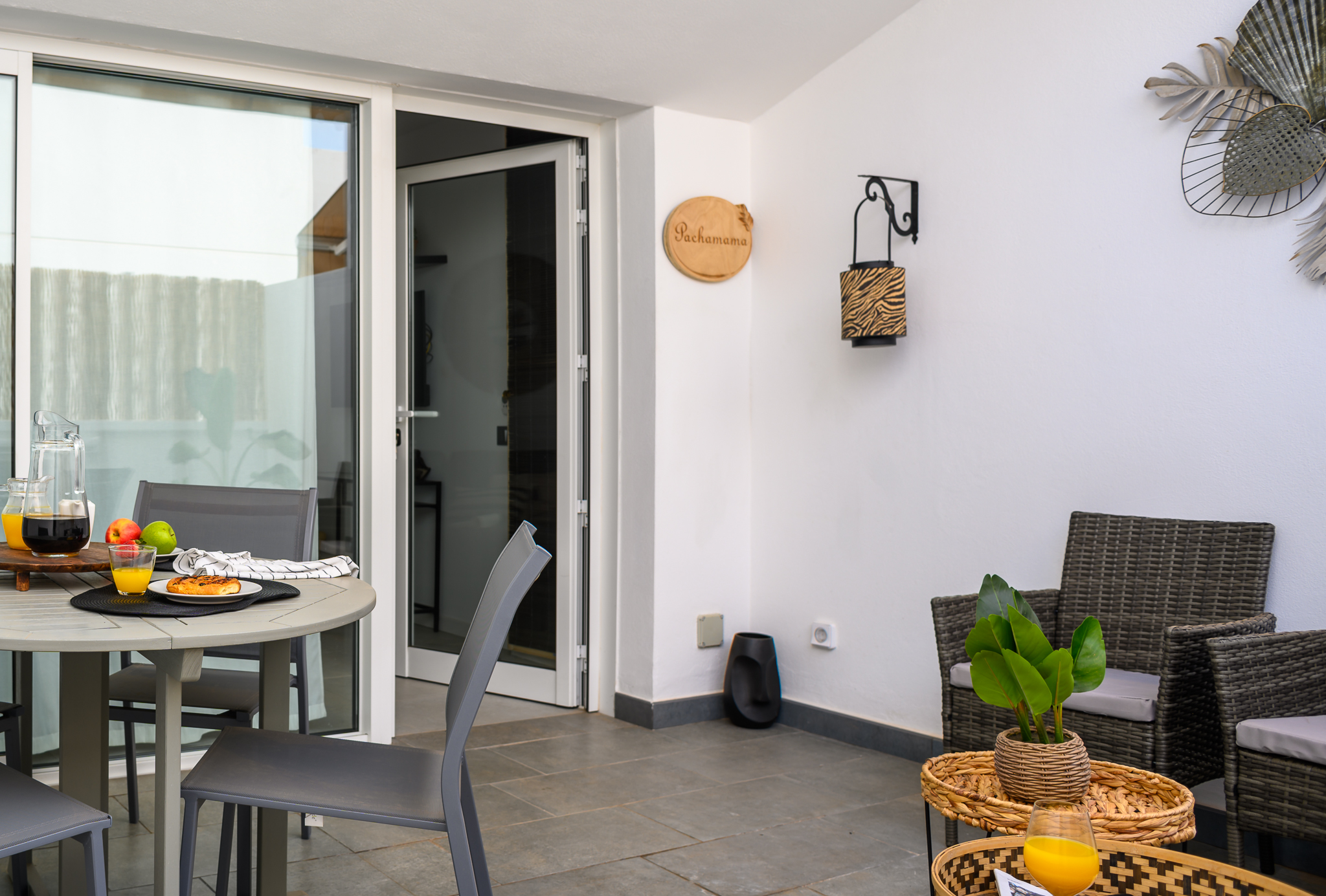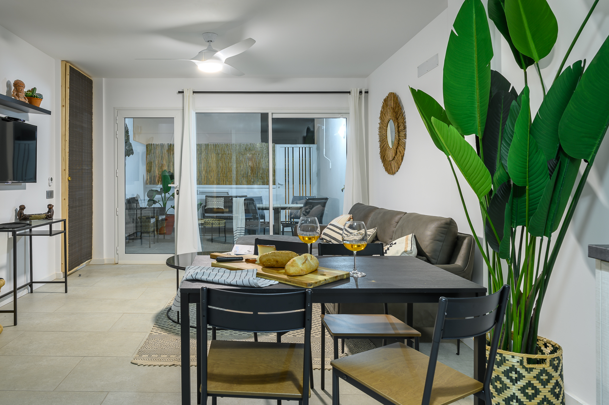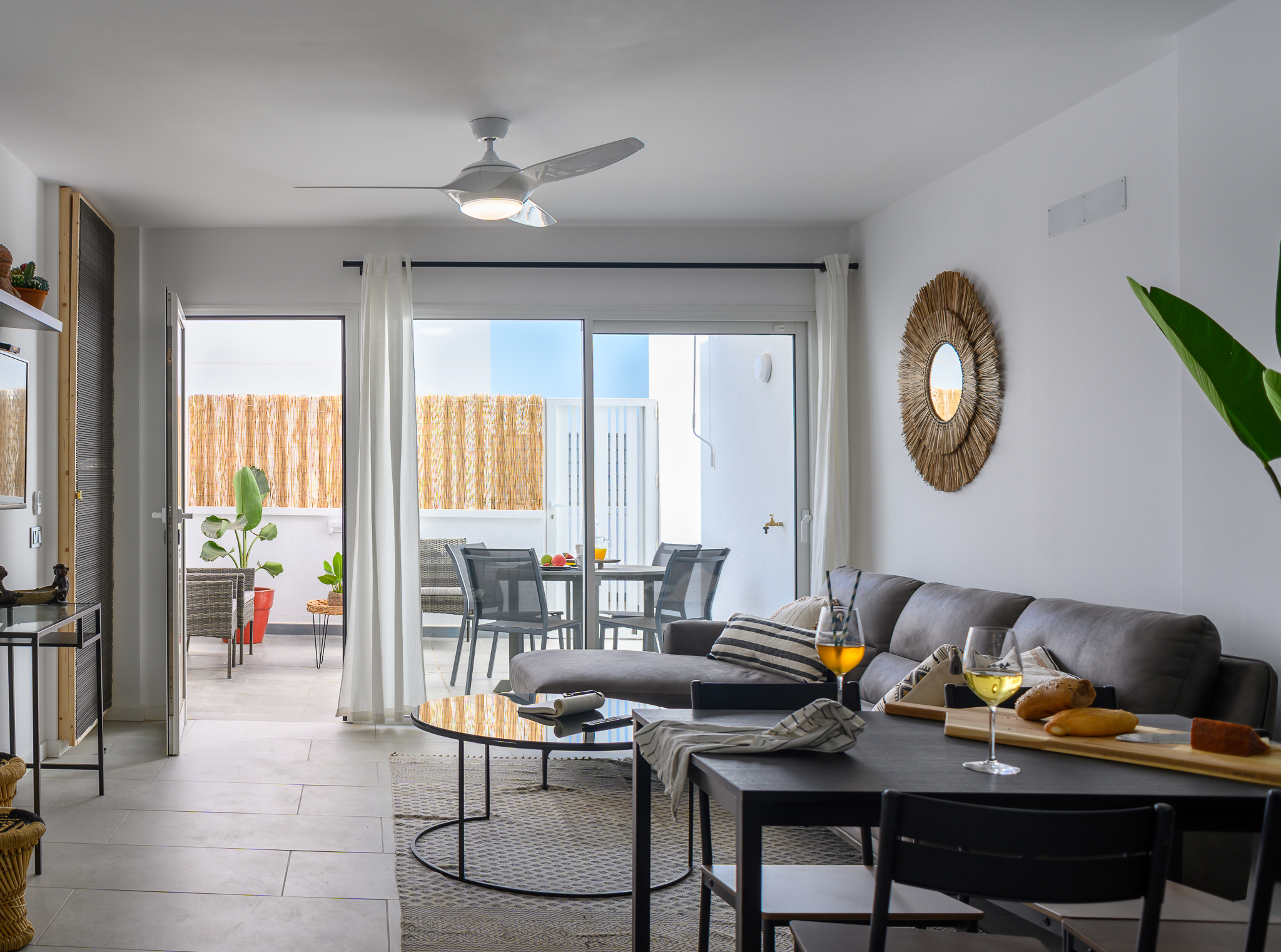 La planta baja cuenta con una acogedora terraza al aire libre equipada con sofá, sillas y mesa, perfecta para disfrutar de desayunos al sol o cenas al fresco. En el interior, encontrarás un amplio salón con sofá chaise longue, Smart TV de 42 pulgadas con acceso canales internacionales por satélite, ventilador de techo y una cómoda zona de comedor.