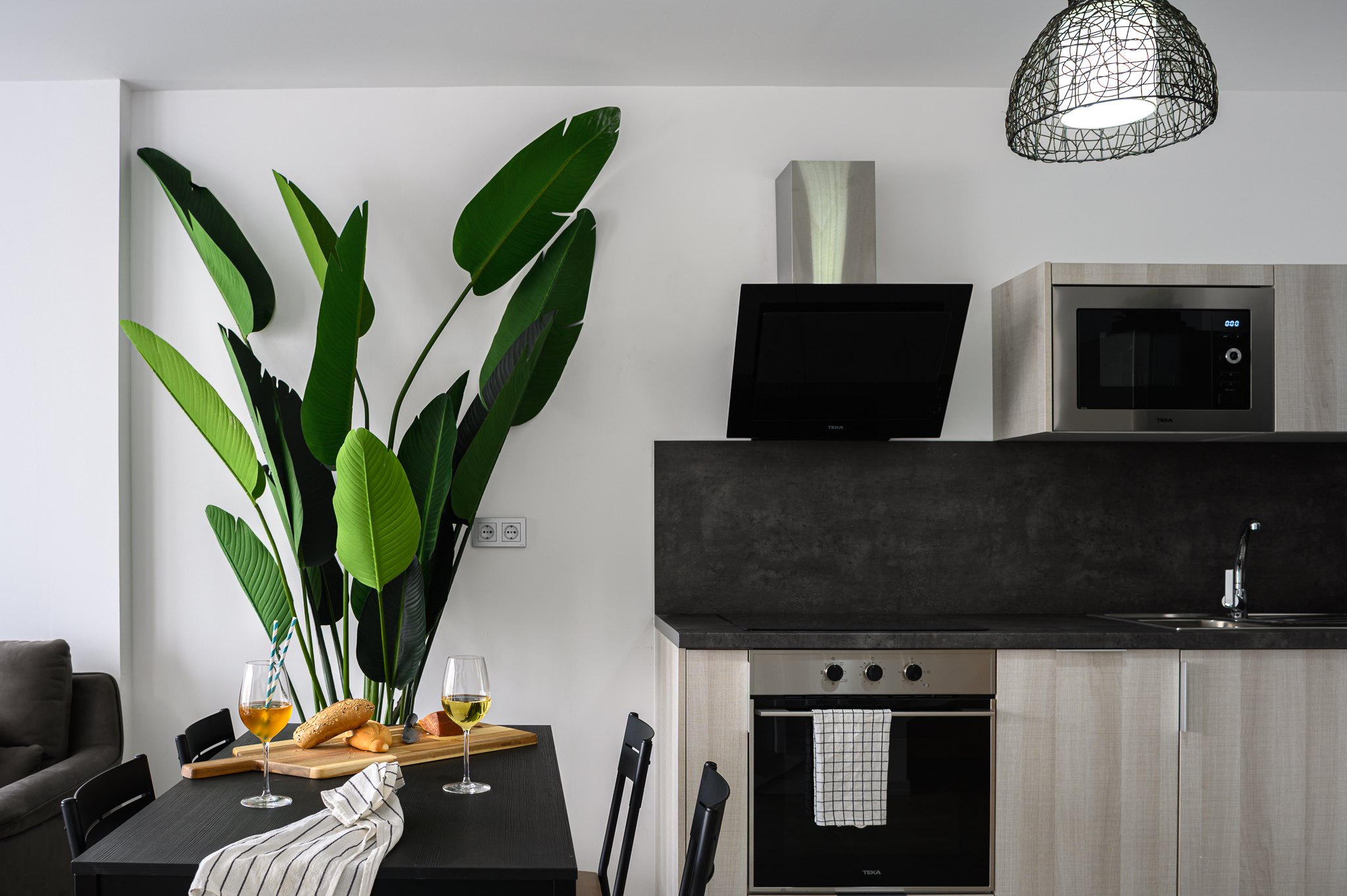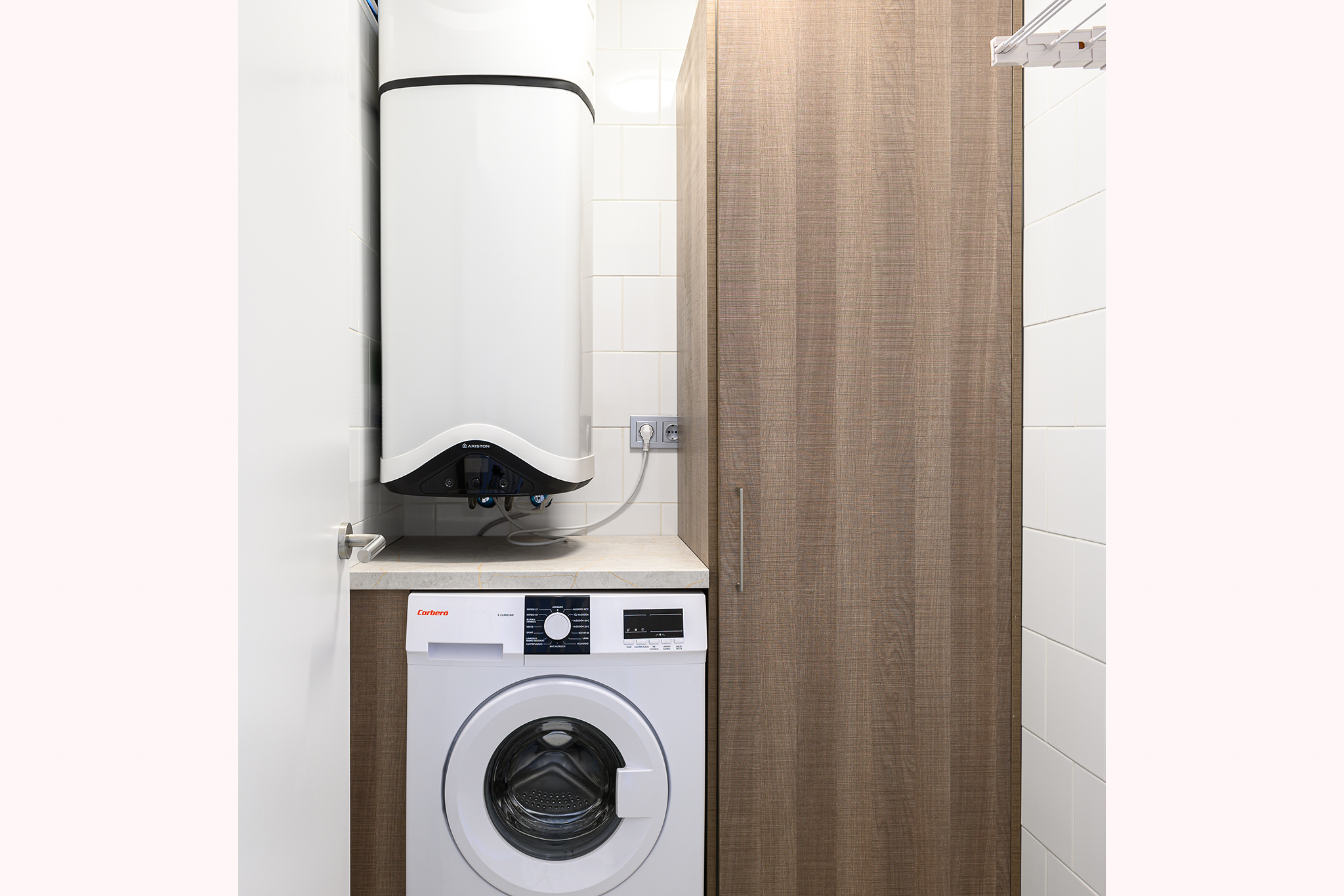 La cocina está completamente equipada con todo lo necesario: fogones, horno, lavavajillas, microondas, hervidor, tostadora, exprimidor, cafetera y un completo juego de menaje. También dispone de una pequeña estancia con lavadora, plancha y tabla, un aseo de cortesía y una habitación con cama de matrimonio, amplio armario y baño completo con plato de ducha y secador de pelo.