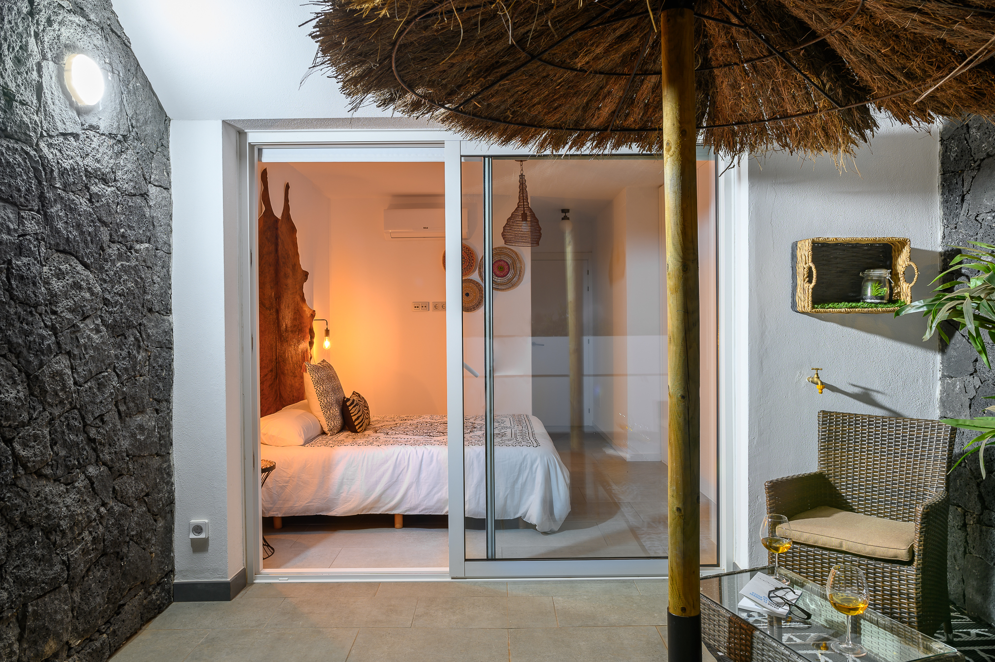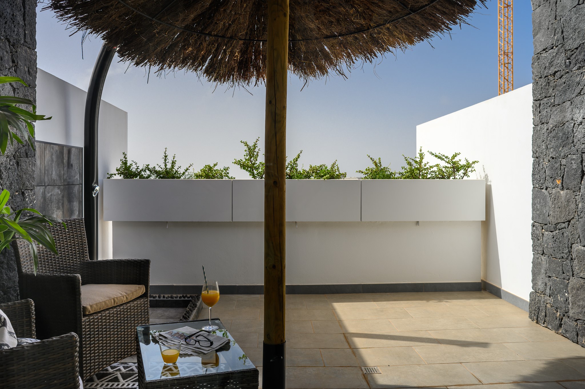 En la planta alta, se encuentran dos habitaciones más: una con dos camas individuales, armario amplio y baño privado con ducha; y la principal, con cama de matrimonio, baño en suite, aire acondicionado, caja fuerte y acceso directo a una espectacular terraza-solárium. Este espacio exterior está diseñado para el descanso total, equipado con ducha al aire libre, hamacas y cómodos sillones, ideal para tomar el sol o relajarse bajo las estrellas.