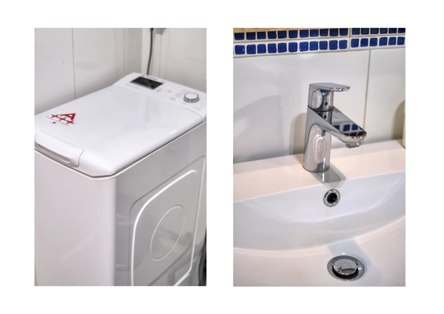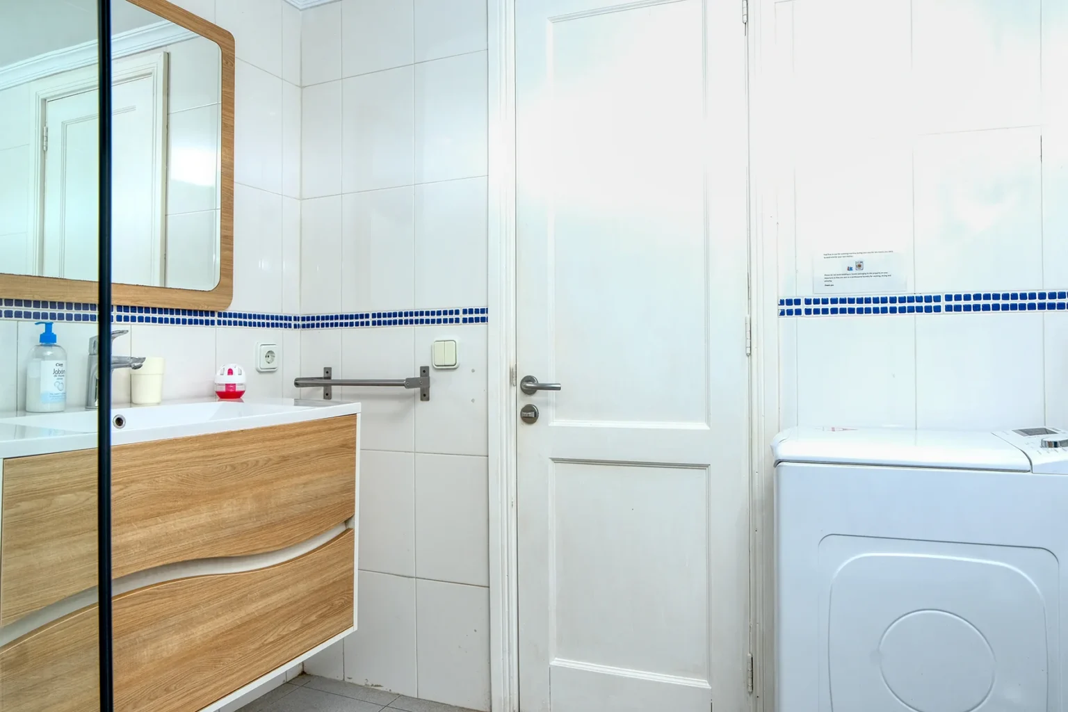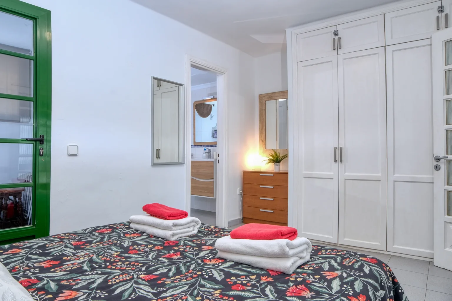 El dormitorio principal está equipado con una amplia cama doble y un armario empotrado con caja fuerte de gran tamaño para mayor seguridad. Junto al dormitorio se encuentra una estancia adicional destinada a lavandería y almacenamiento, donde se ubican la lavadora, la tabla de planchar y los productos de limpieza.