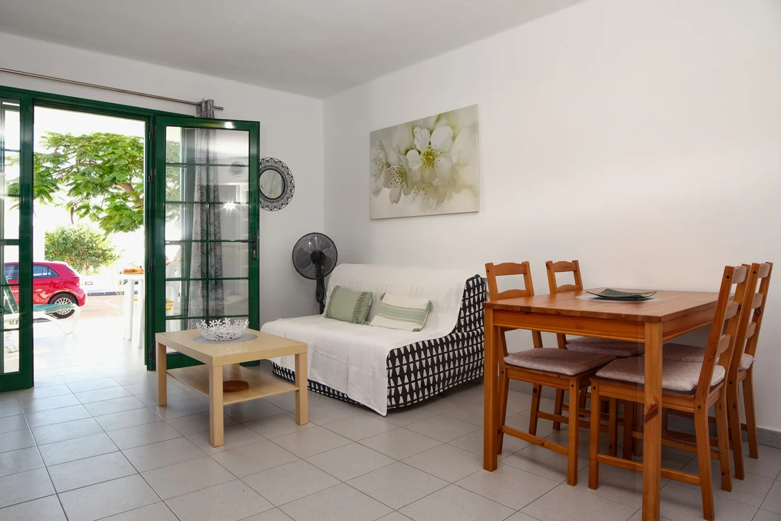 El interior ofrece un espacio luminoso y de concepto abierto que combina la zona de estar con una cocina totalmente equipada. La cocina dispone de nevera, horno, dos fogones, microondas, hervidor de agua y tostadora, además de vajilla y cubertería. En el salón hay un cómodo sofá cama, adecuado para alojar a un huésped adicional.