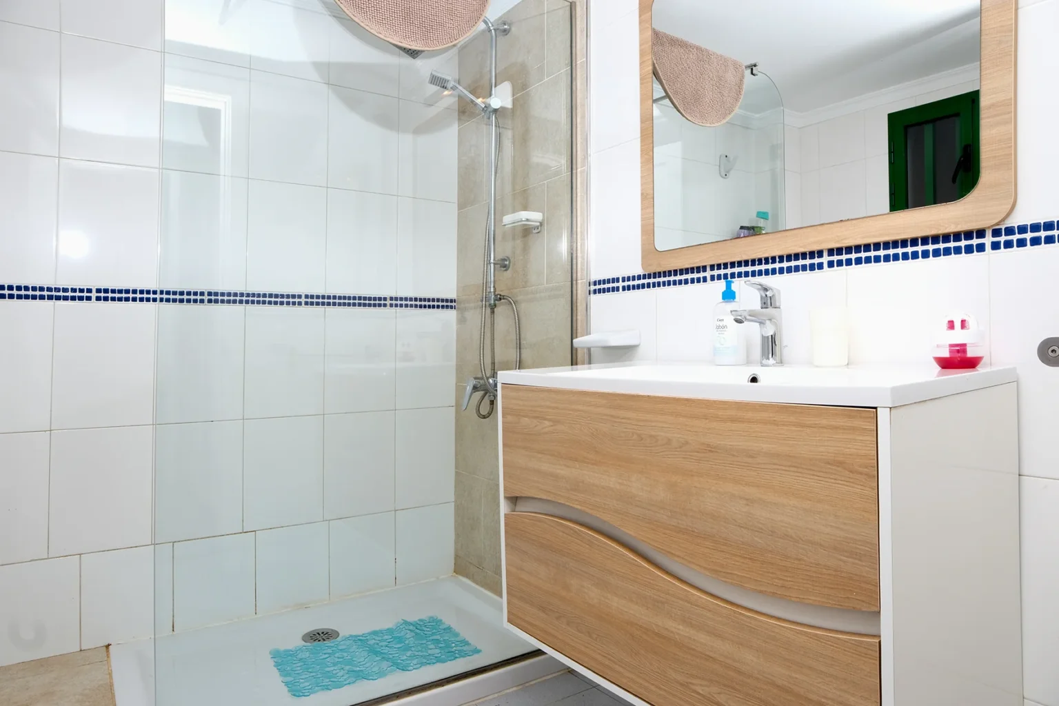 El baño dispone de una moderna ducha a ras de suelo, lavabo e inodoro, ofreciendo funcionalidad y confort.