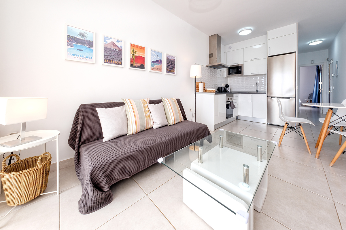 Apartamento nuevo en un complejo moderno y lujoso en Costa Teguise. Consta de un dormitorio con cama doble y sofá-cama en la sala de estar. Baño con ducha, lavadora y secador de pelo. Cocina totalmente equipada con placa, microondas, tostadora, cafetera de cápsulas, hervidor de agua y nevera. Wifi con fibra, ideal para teletrabajar. Televisor inteligente con Netflix. Lavadora, tabla de planchar y plancha.