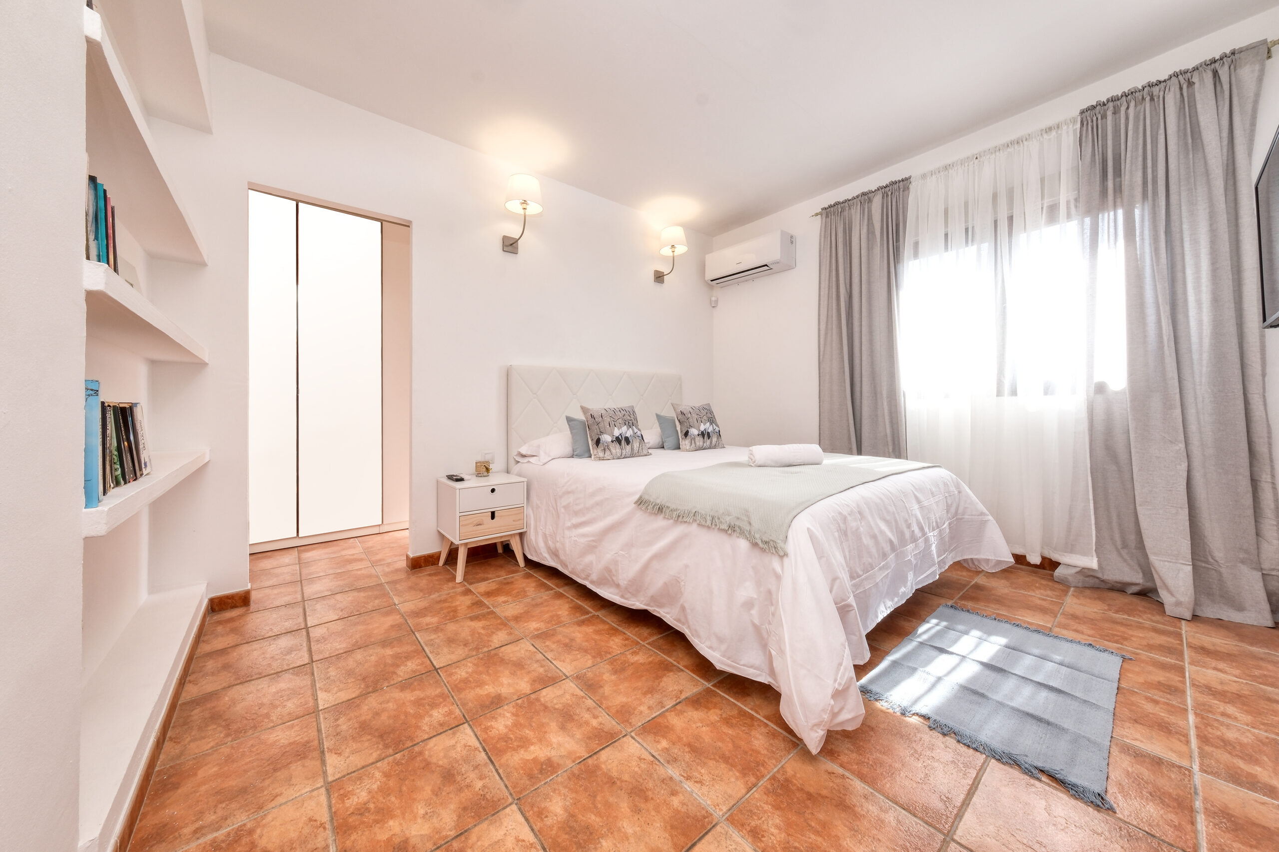 El dormitorio principal dispone de cama de matrimonio (medidas 150x200cm), cabina armario, baño con ducha en-suite y aire acondicionado ( con sistema de monedas).