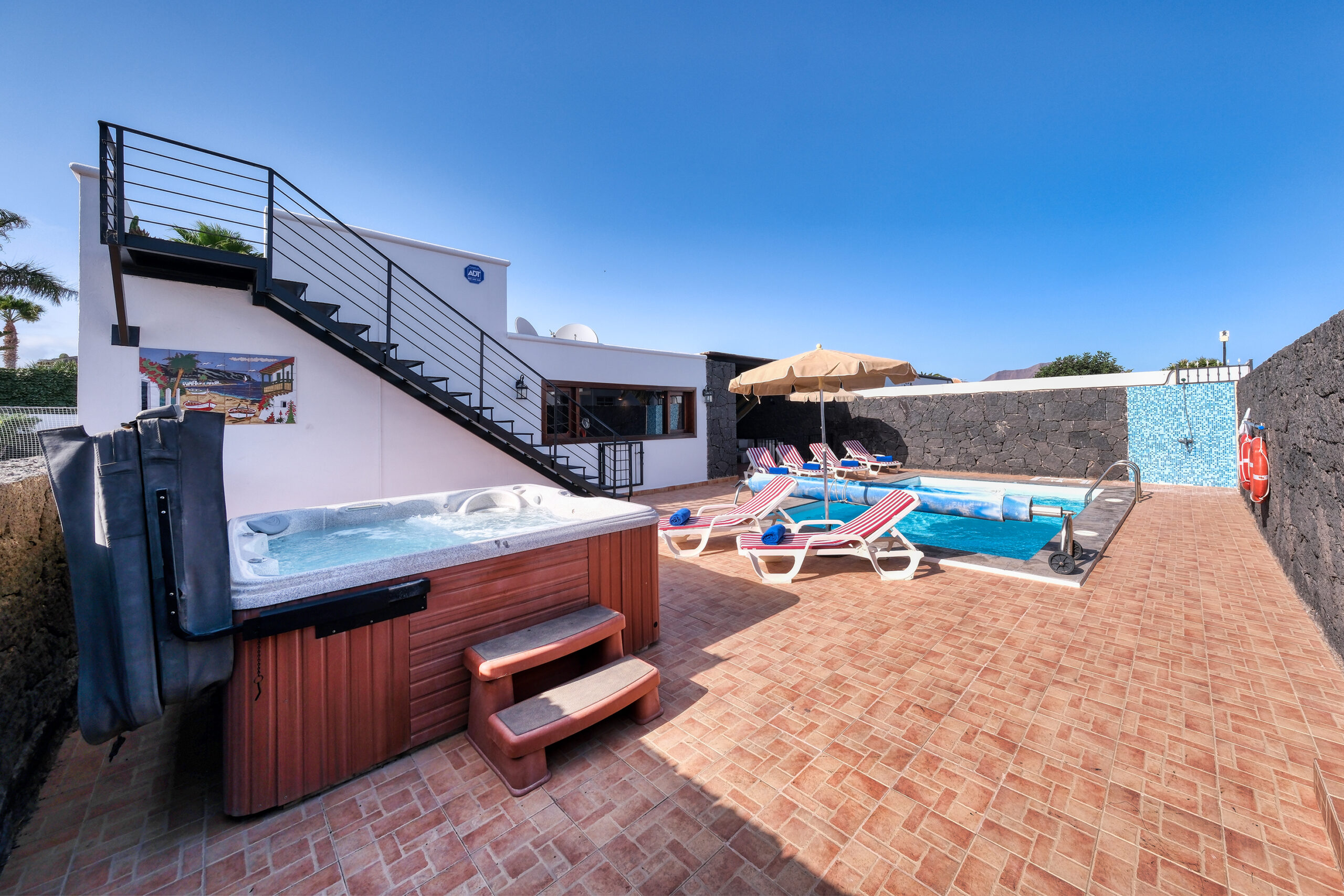 La piscina y el jacuzzi gozan de privacidad y ausencia de viento. La terraza delantera tiene también hamacas, una ducha exterior y una parte semi-cubierta con sofás y mesita para relajarse, leer o tomar algo en compañía.