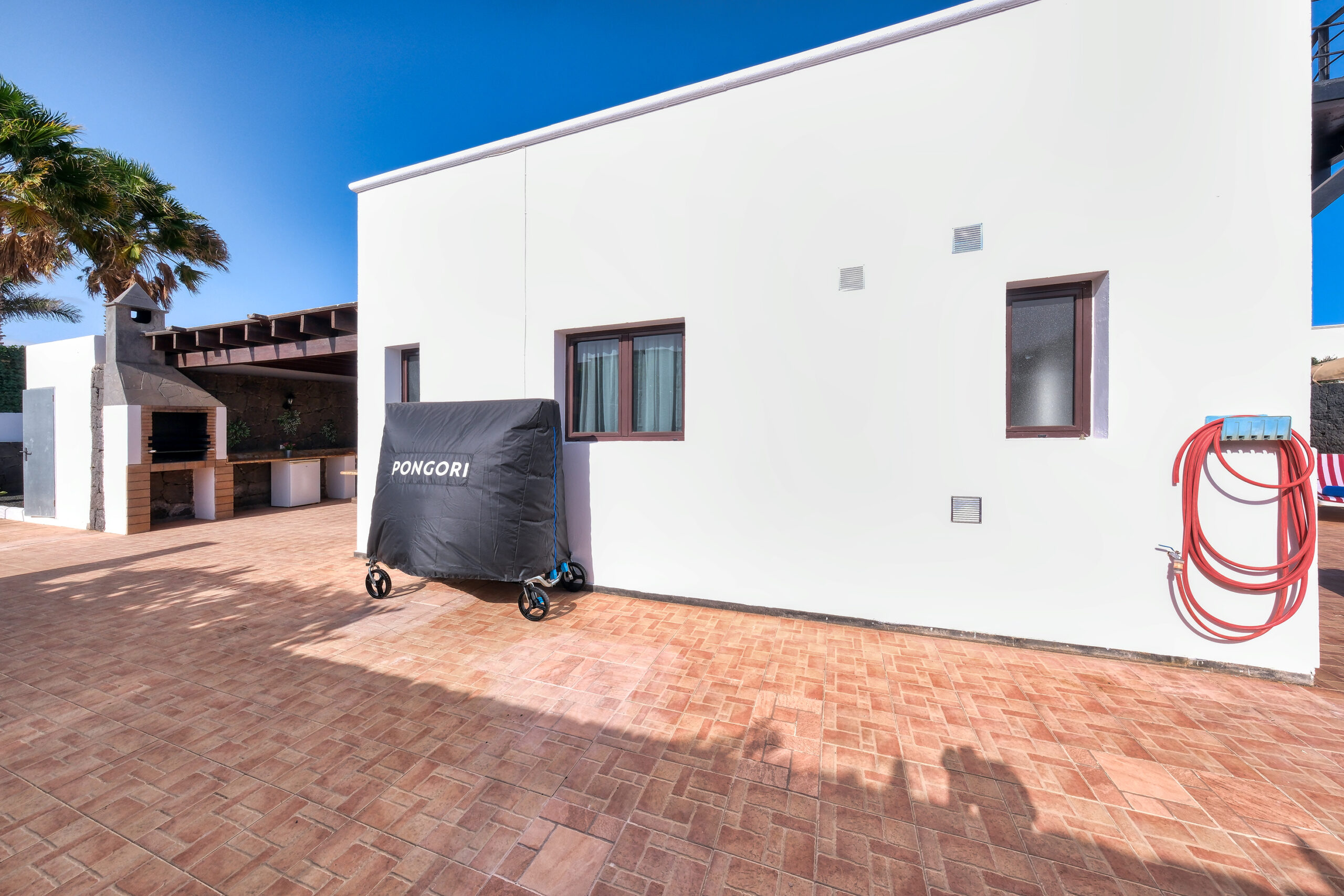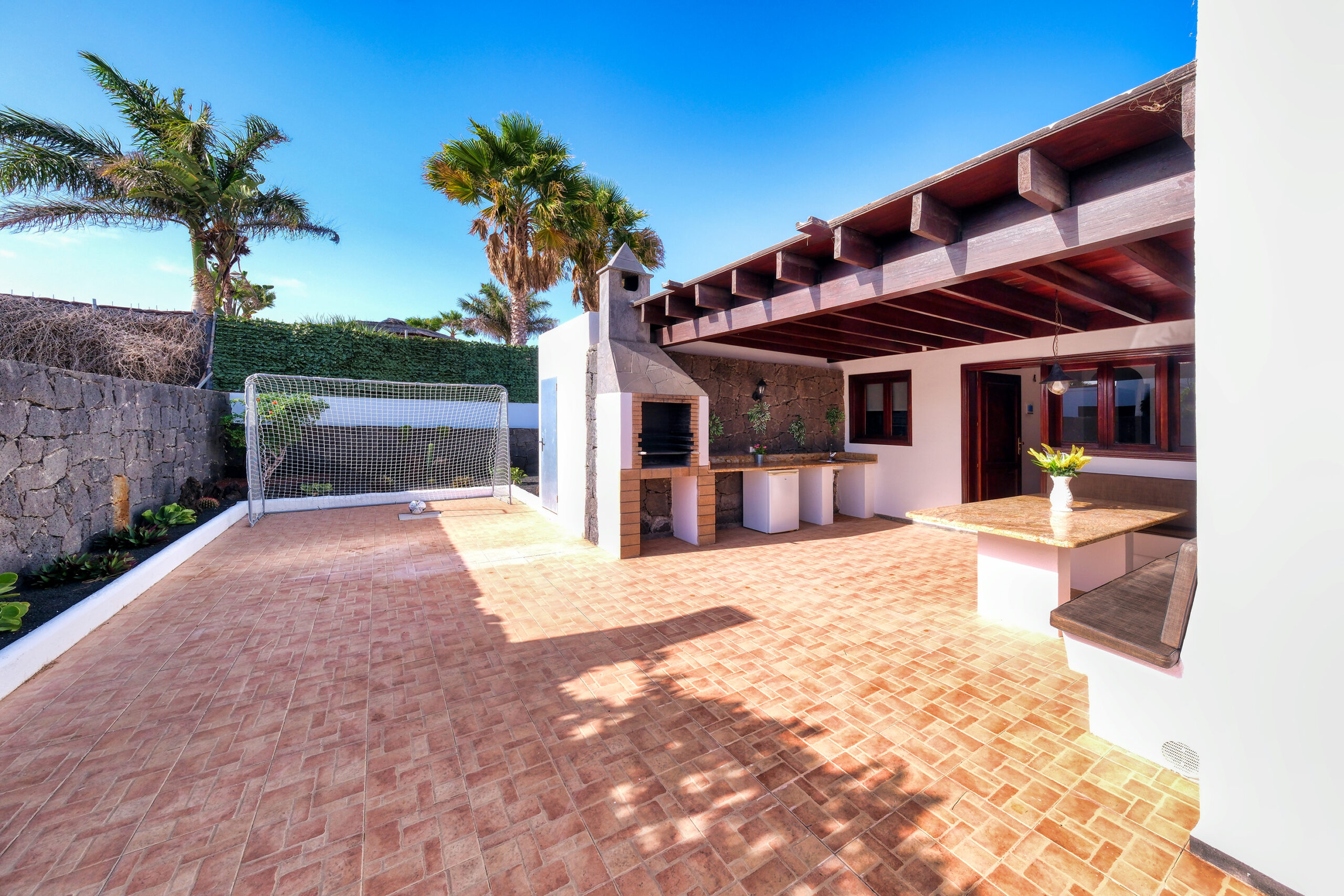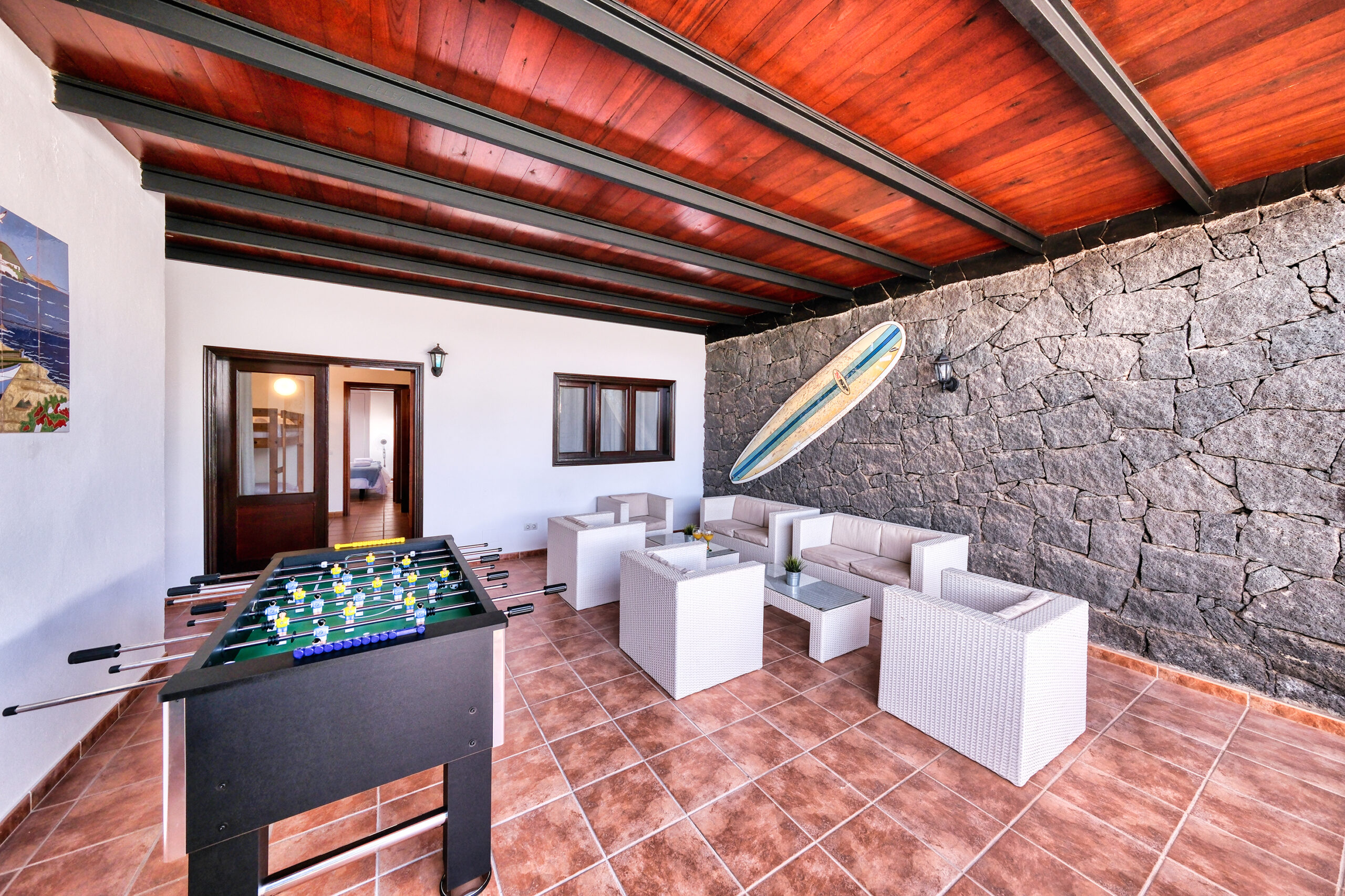 Tiene una espaciosa zona exterior para disfrutar del día al aire libre con juegos para entretenerse en los días en familia o entre amigos como futbolín, portería y mesa de ping-pong.