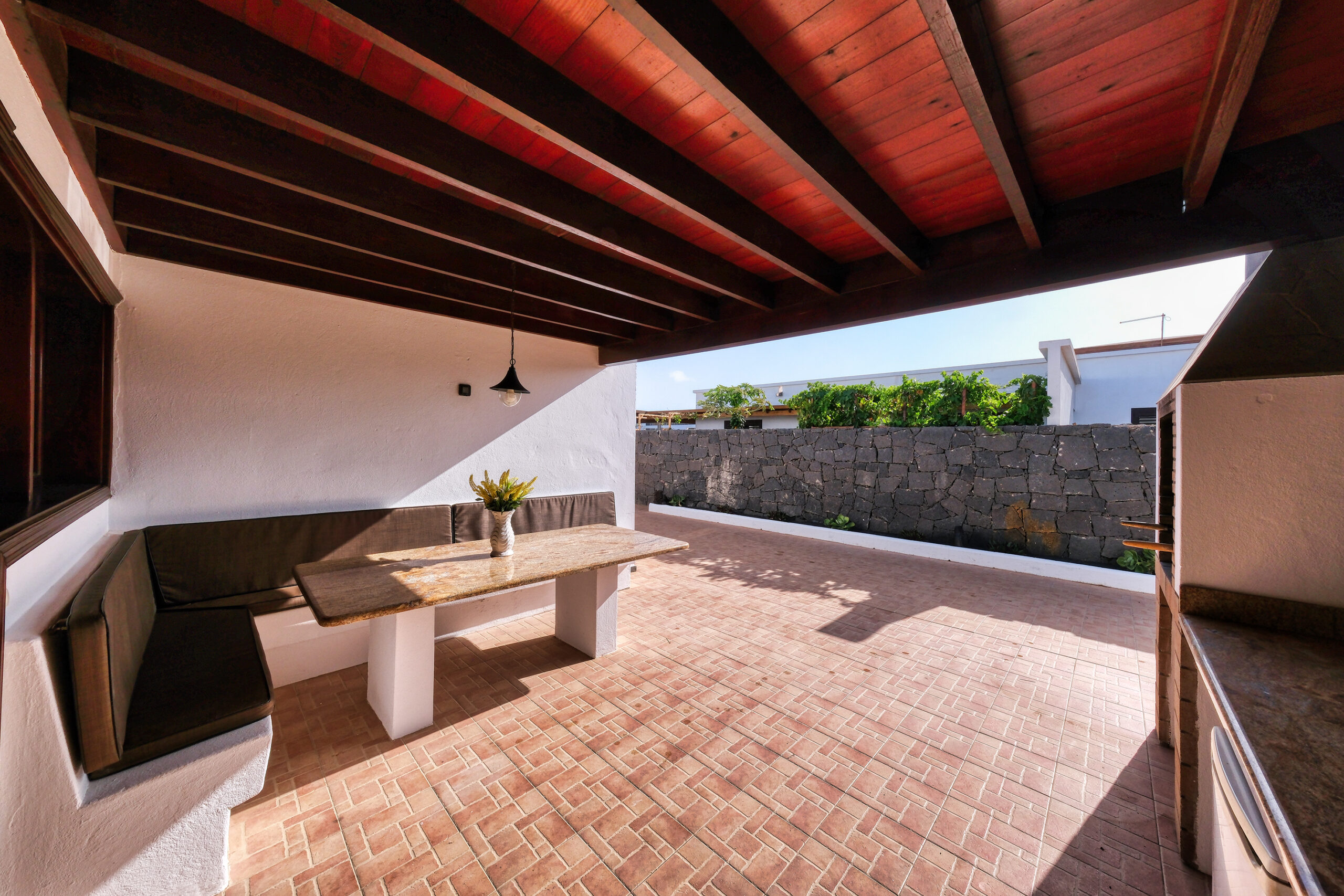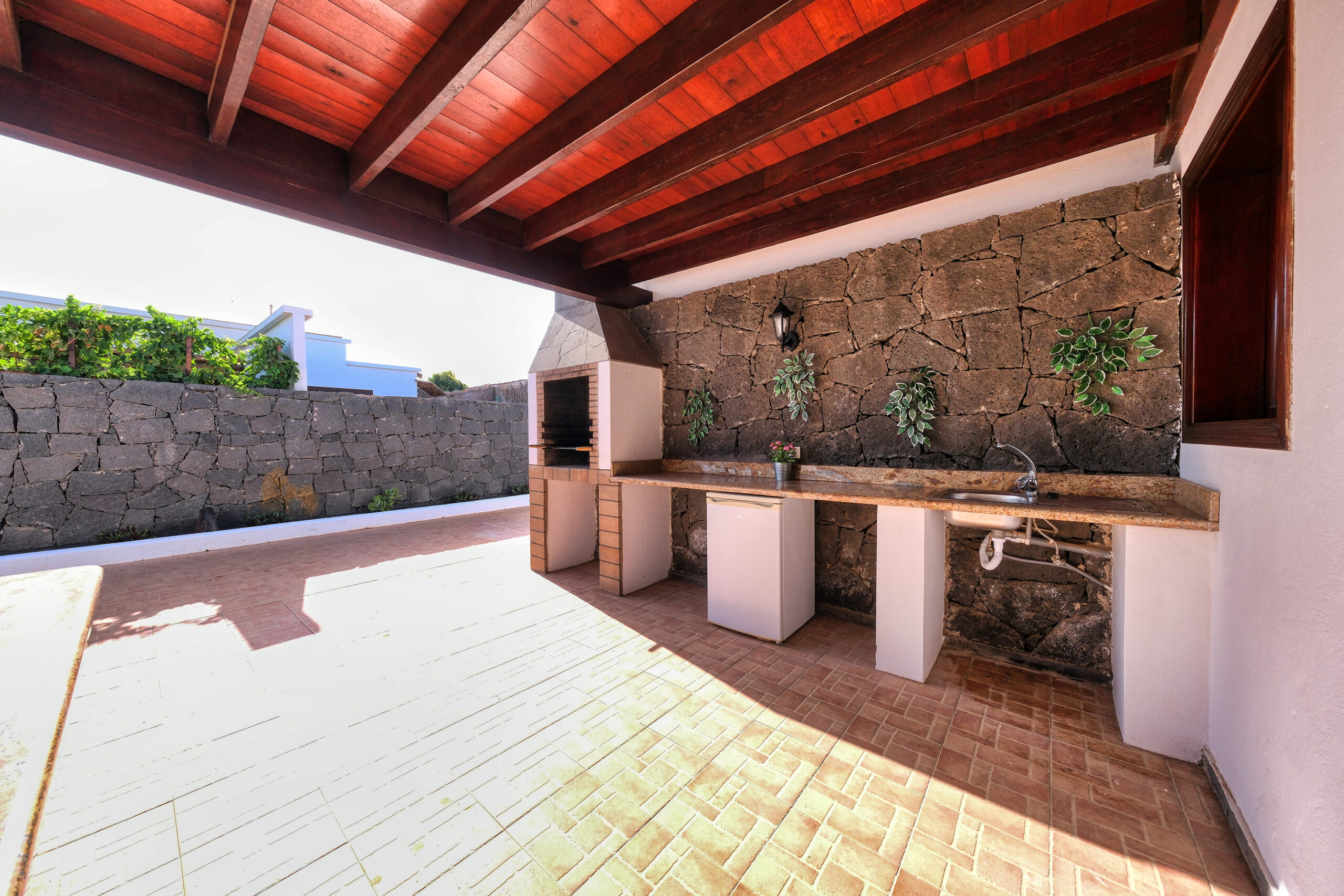 La zona exterior lateral dispone de barbacoa con mesa exterior, sillas, plano cocina y pequeña nevera para comer o cenar al aire libre.