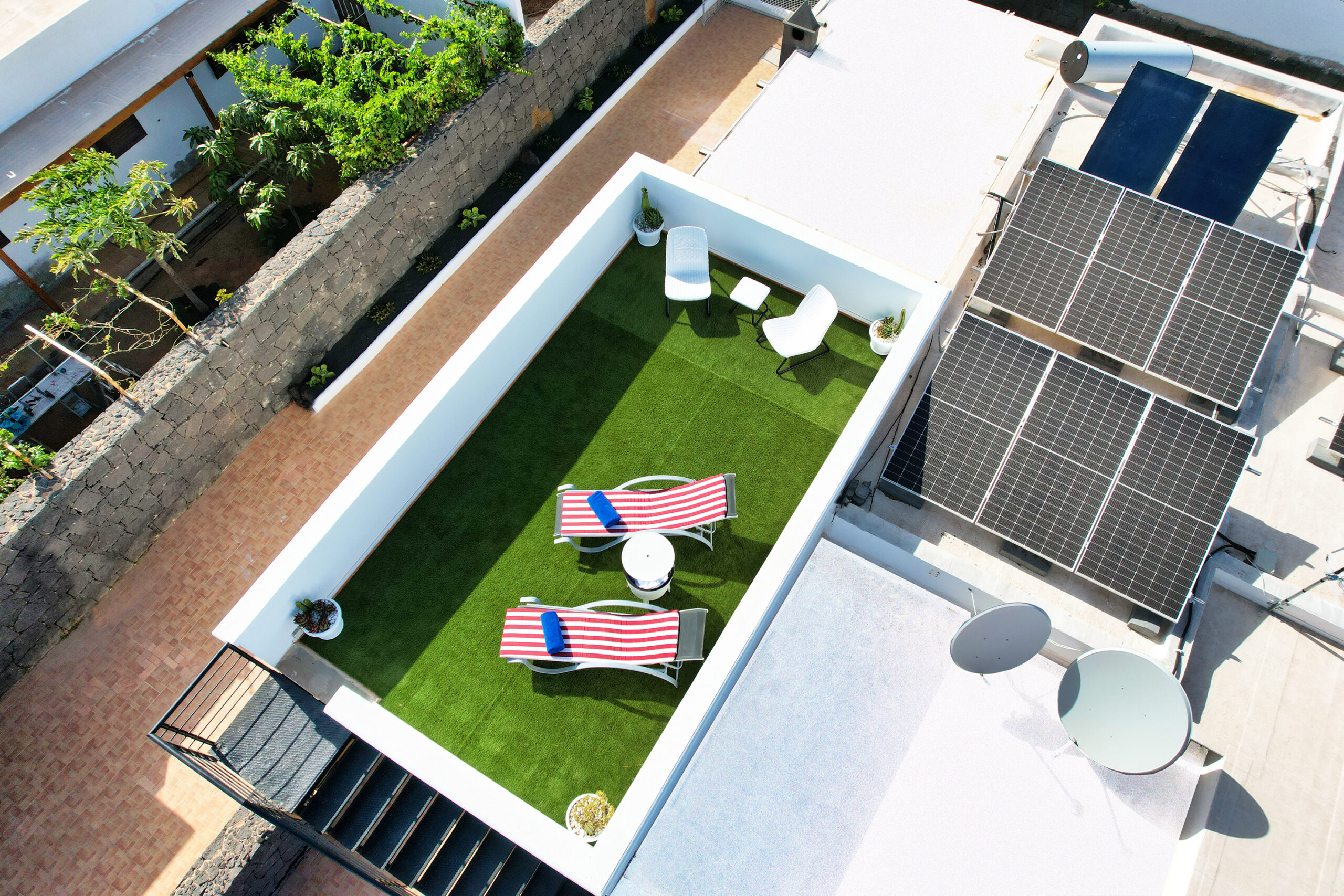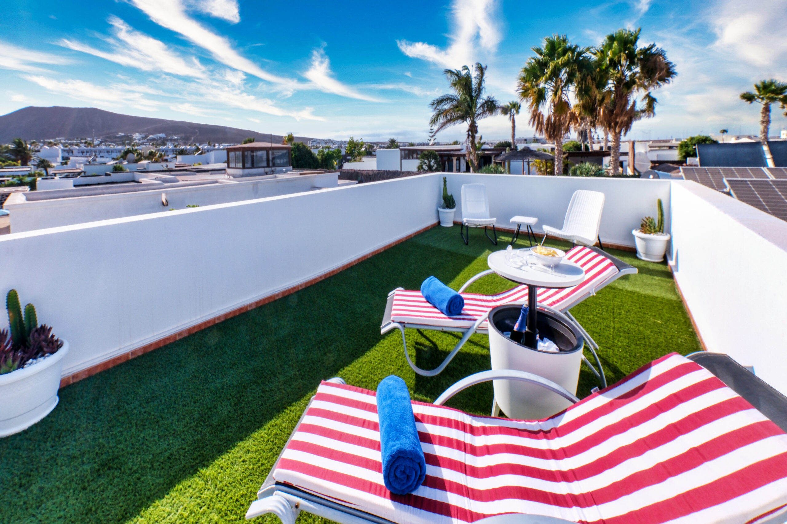 Además podrán disfrutar de una espectacular zona solarium en la parte alta de la vivienda con mesa, sillas, hamacas y mesa-cubitera para relajarse tomando el sol y bebiendo algo fresco.