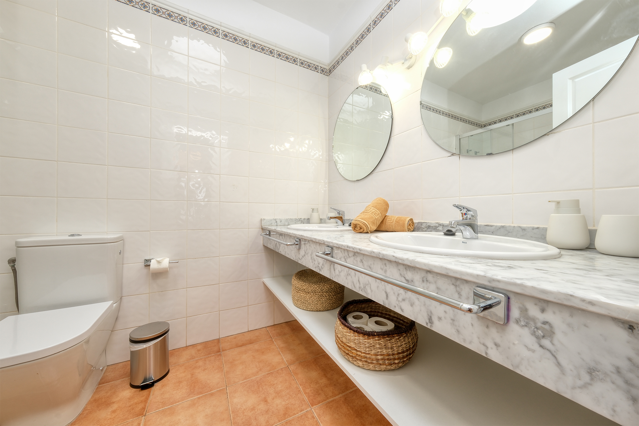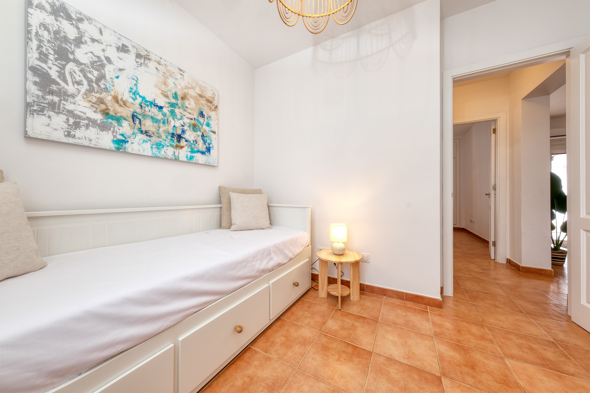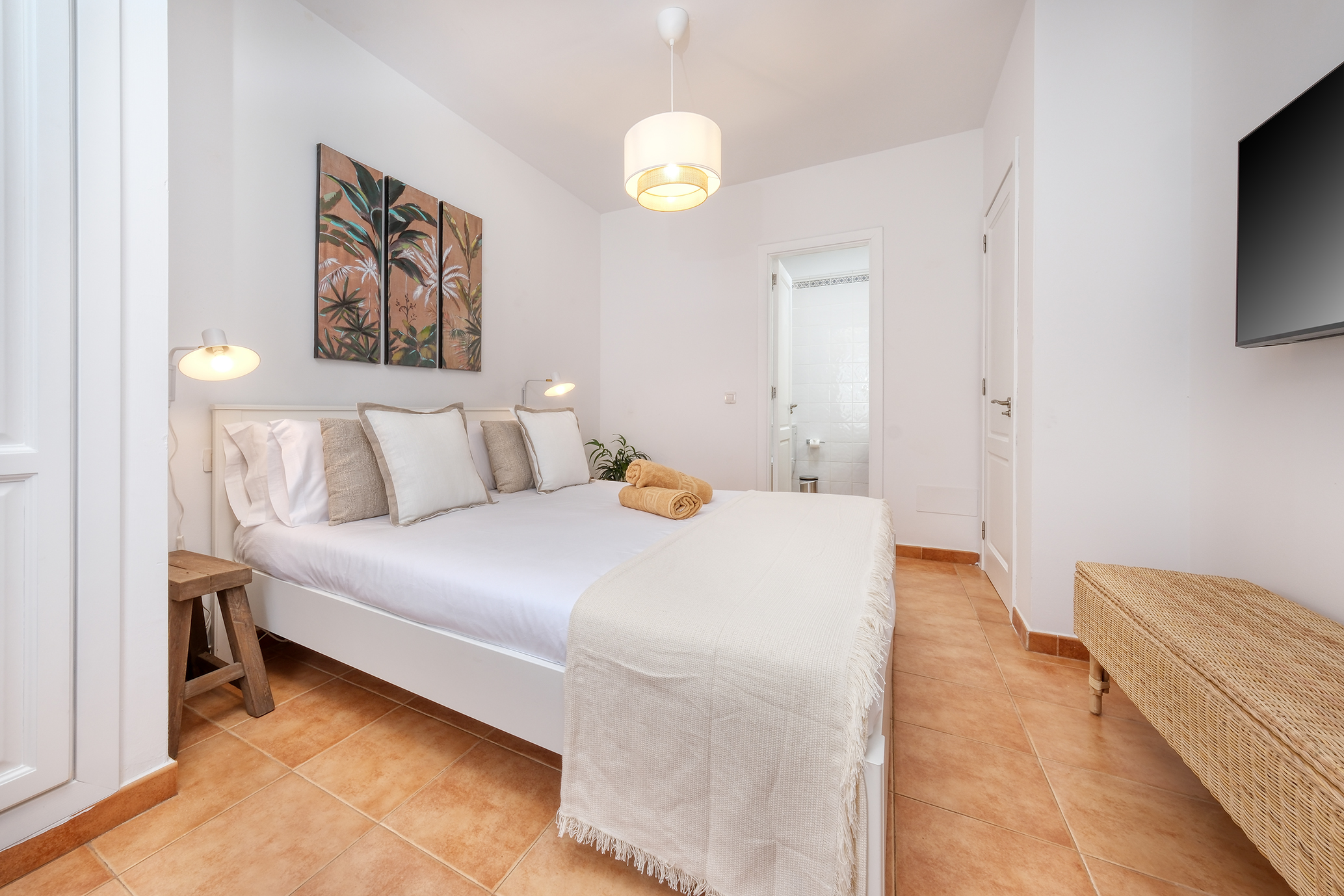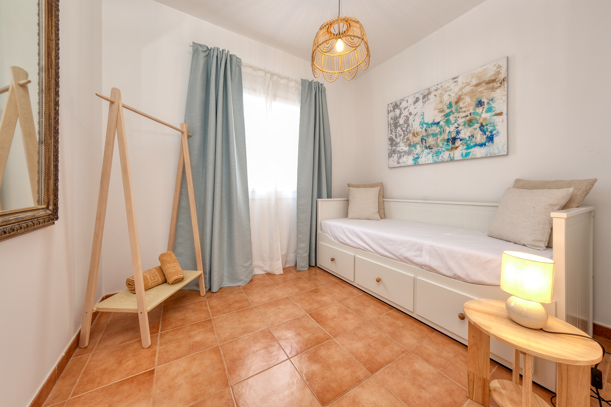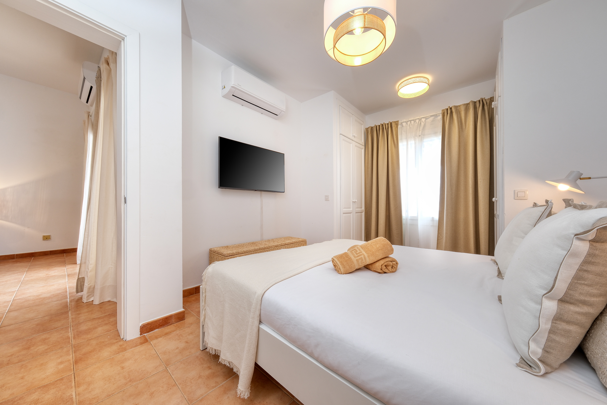 En la planta alta encontrará tres dormitorios ( todos con aire acondicionado). El dormitorio principal con cama de matrimonio (150cm) y armario de gran tamaño, otro dormitorio con dos camas individuales y tocador con espejo y el tercer dormitorio con sofá cama de 140cm, Smart TV QLED de 43" y mesa de trabajo.