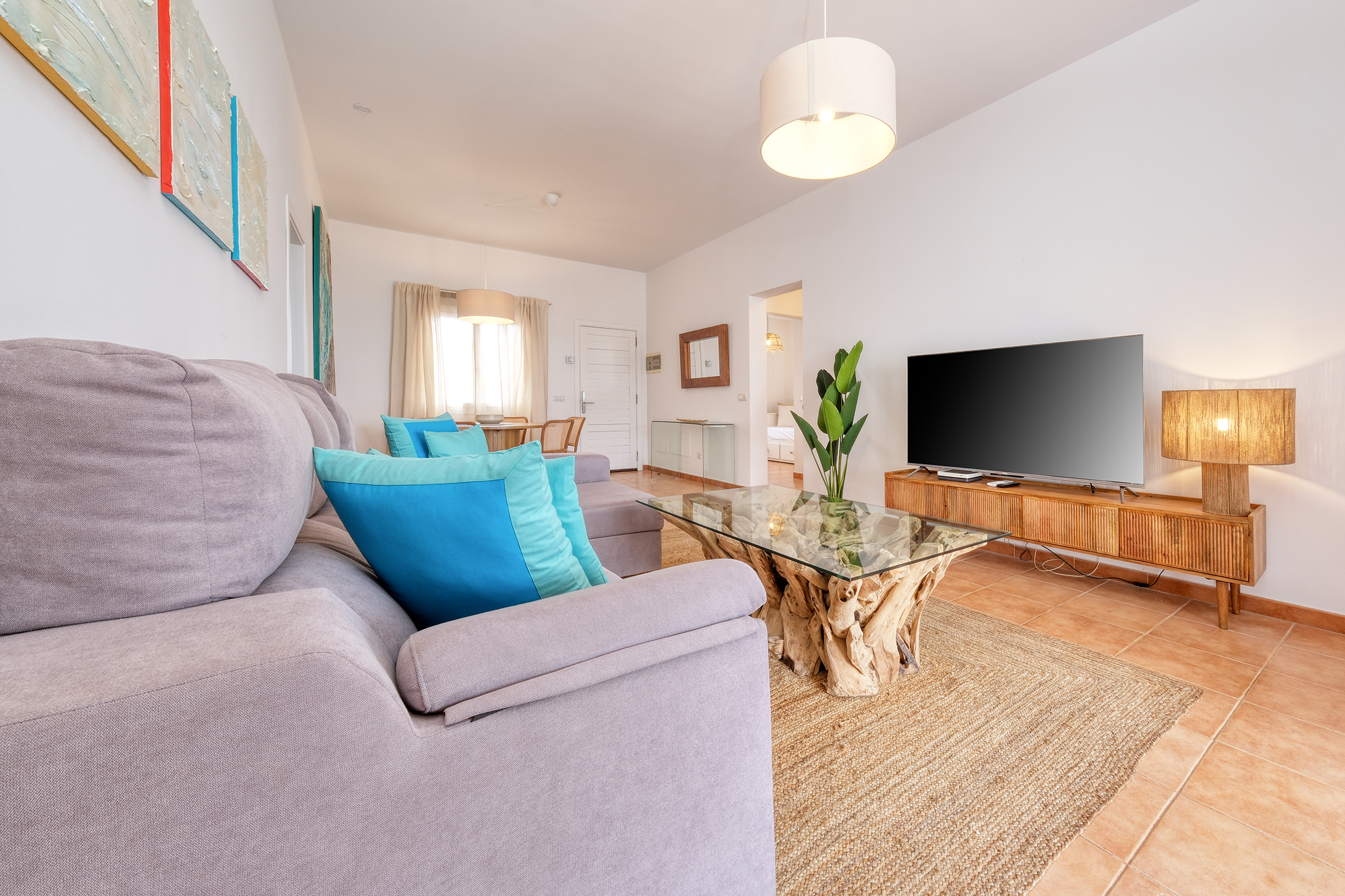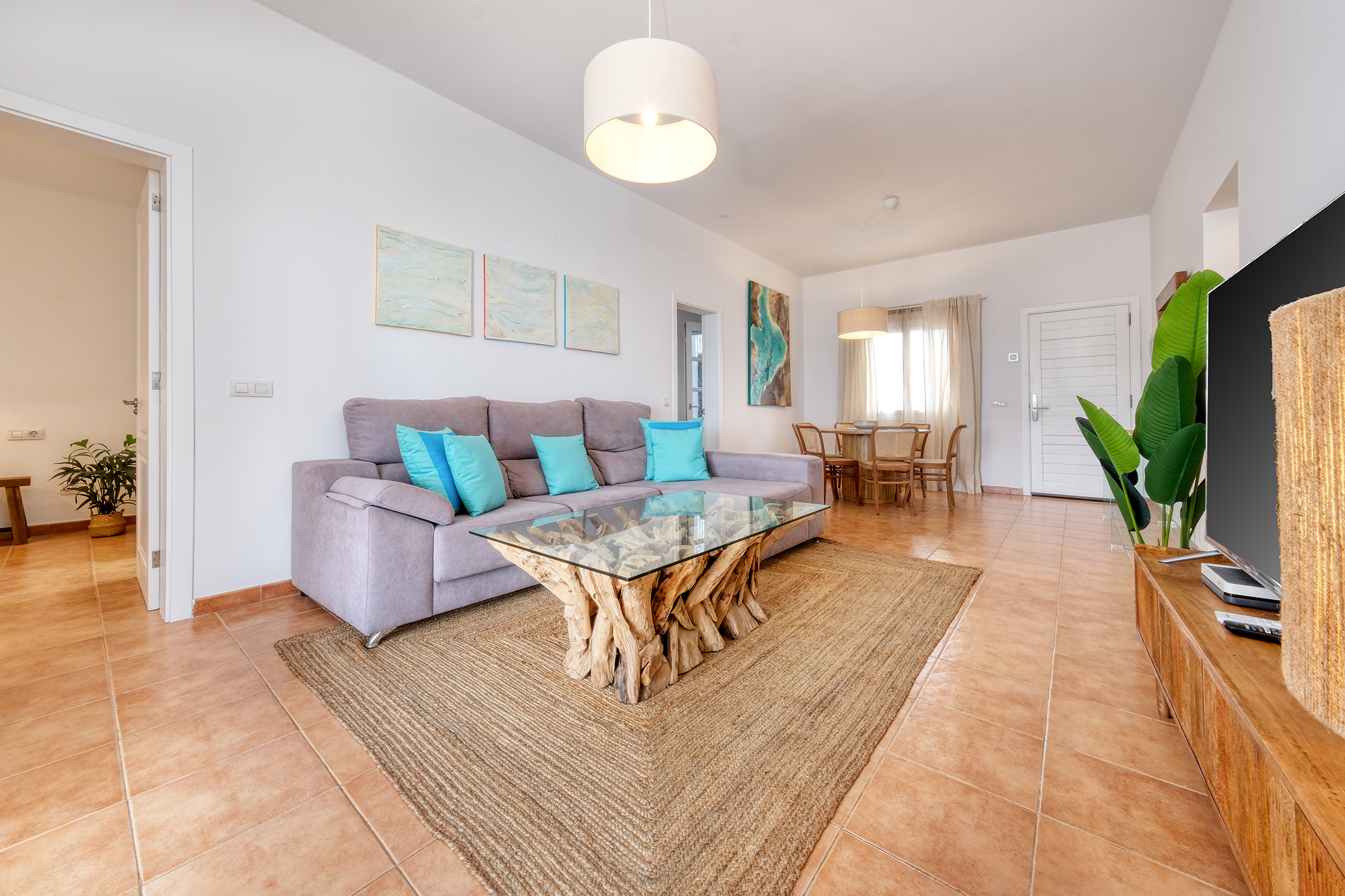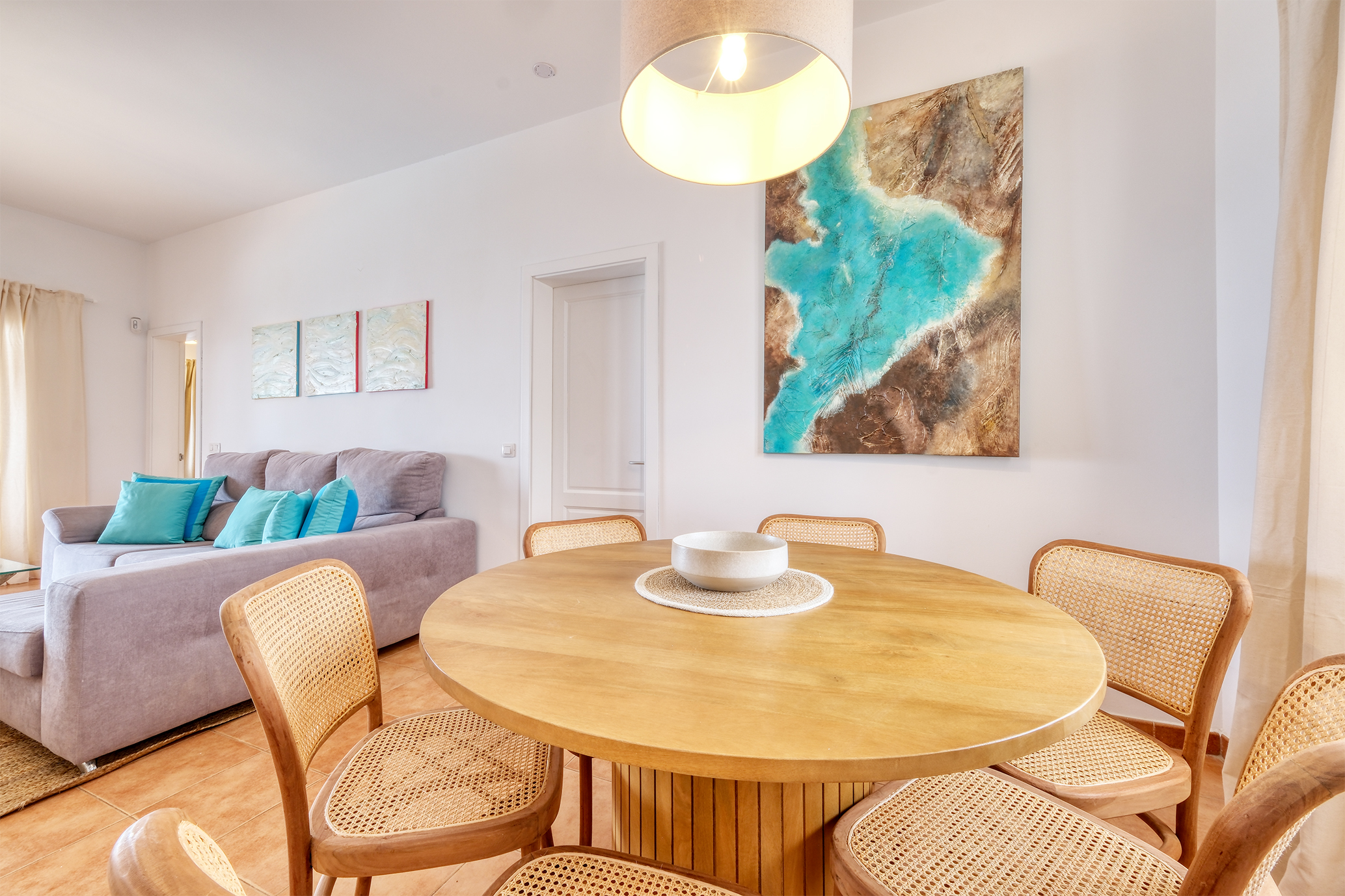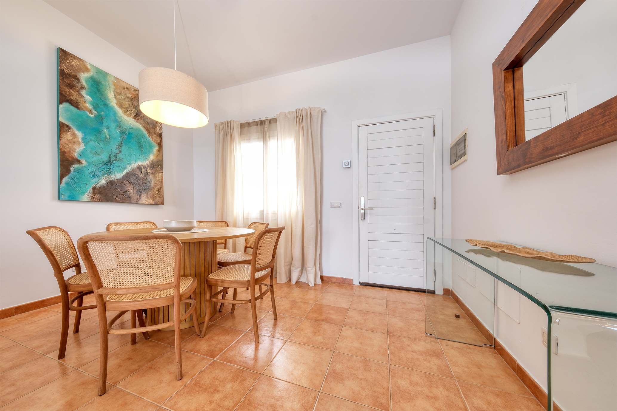 El salón, dotado de aire acondicionado, dispone de un amplio sofá, mesa de comedor extensible para 6 personas, y smart TV QLED de 55” con canales internacionales.