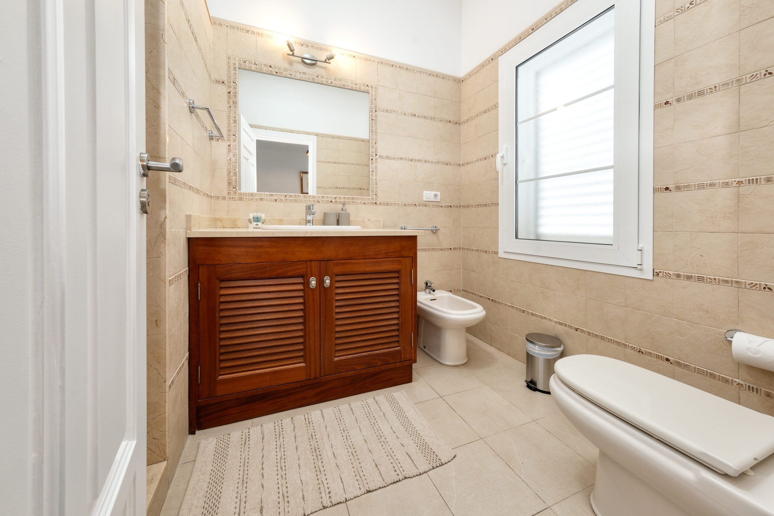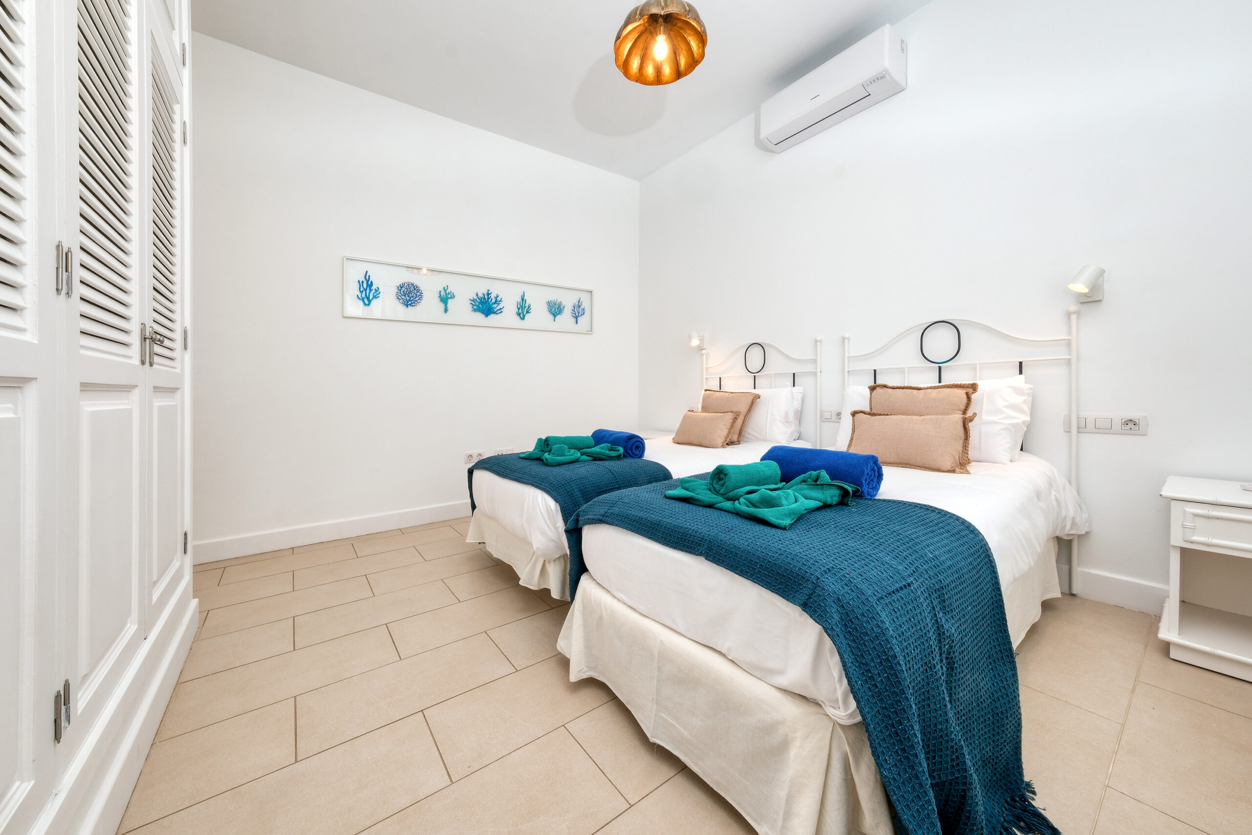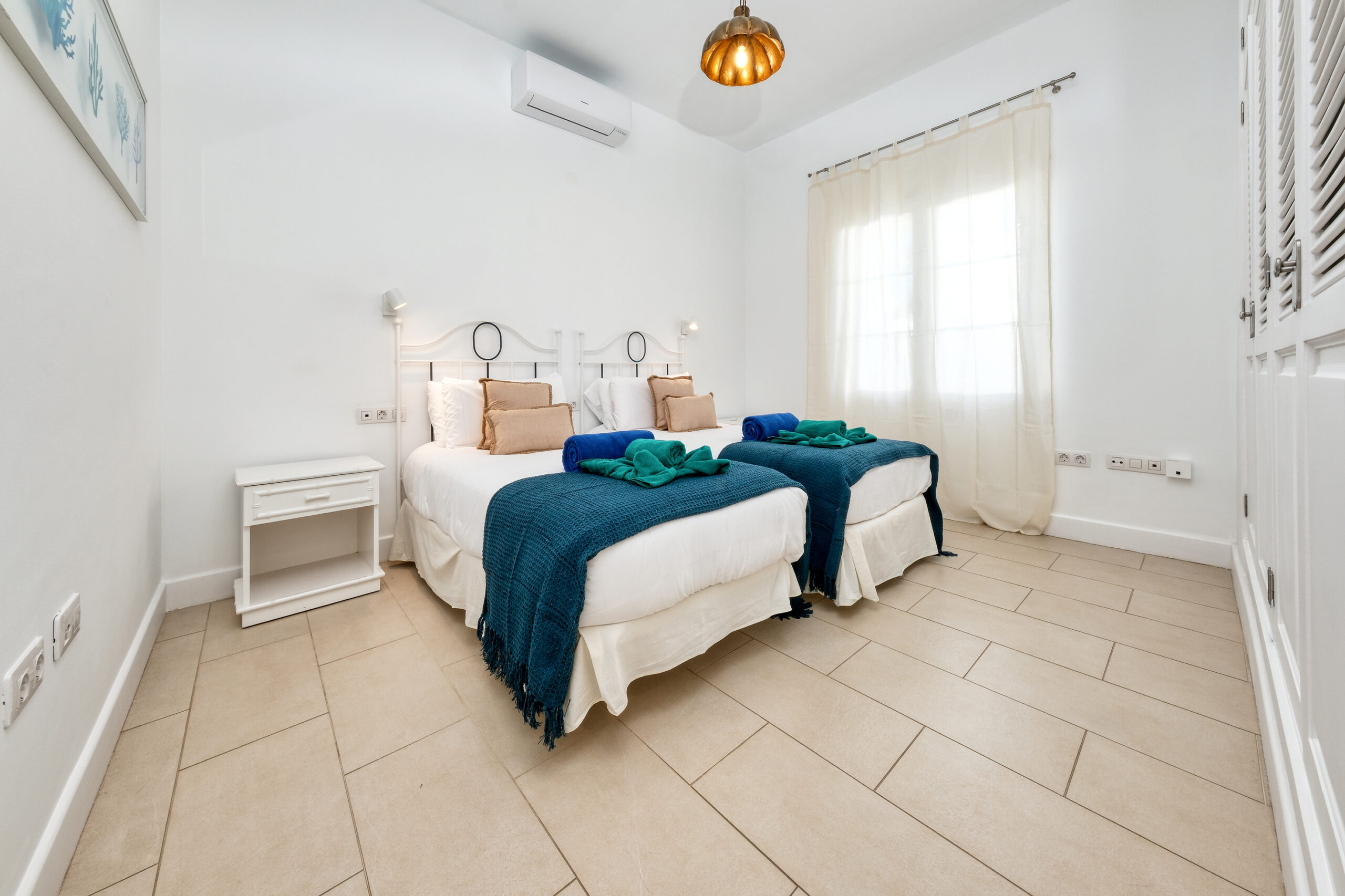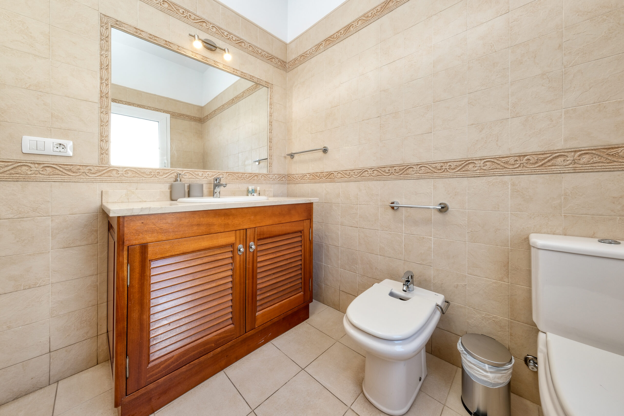 El primer dormitorio cuenta con dos camas individuales, aire acondicionado, televisor, armario empotrado y baño en suite con ducha y bidet. El segundo dormitorio tiene una cama extra grande(180x190), aire acondicionado, televisor, amplio armario con caja fuerte y baño en suite con bañera. El tercer dormitorio dispone también de una cama extra grande(180x200), aire acondicionado, Smart TV y baño en suite con ducha. En total, la villa cuenta con tres baños completos y un aseo adicional, todos equipados con secador de pelo.