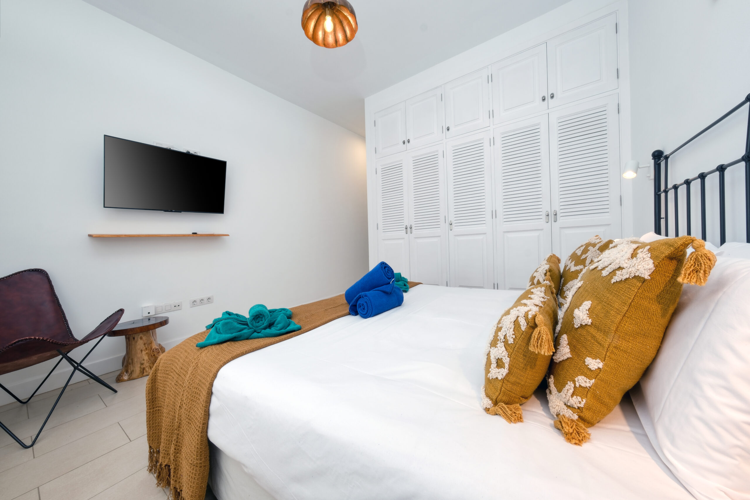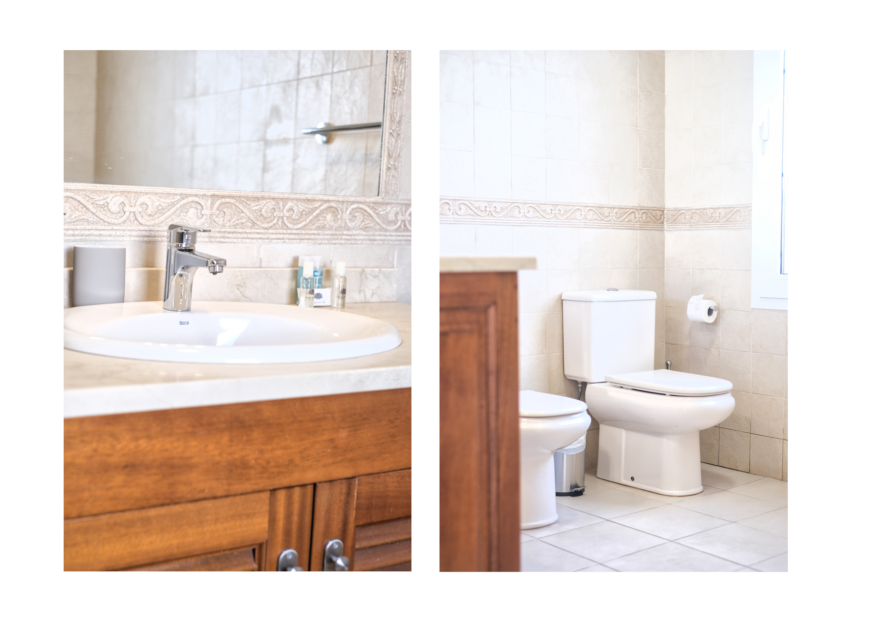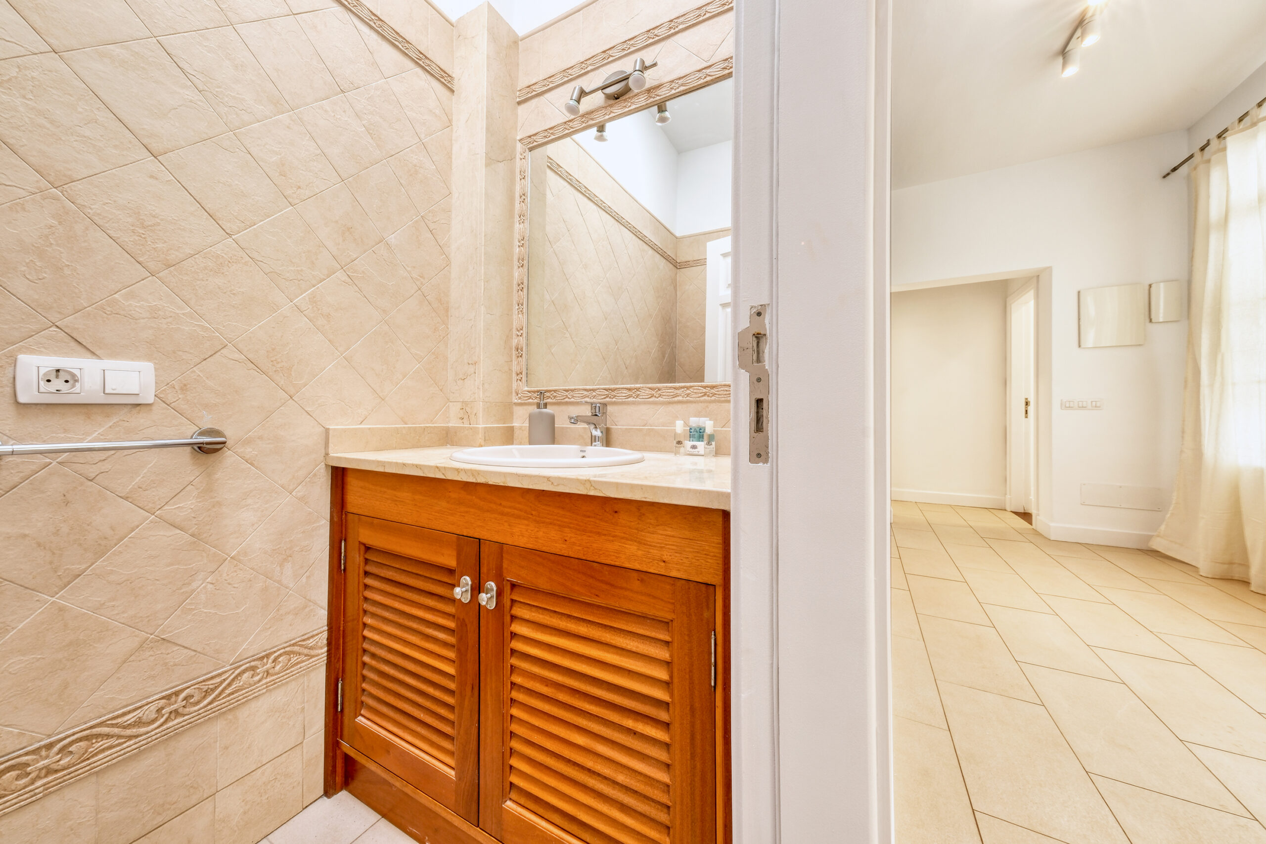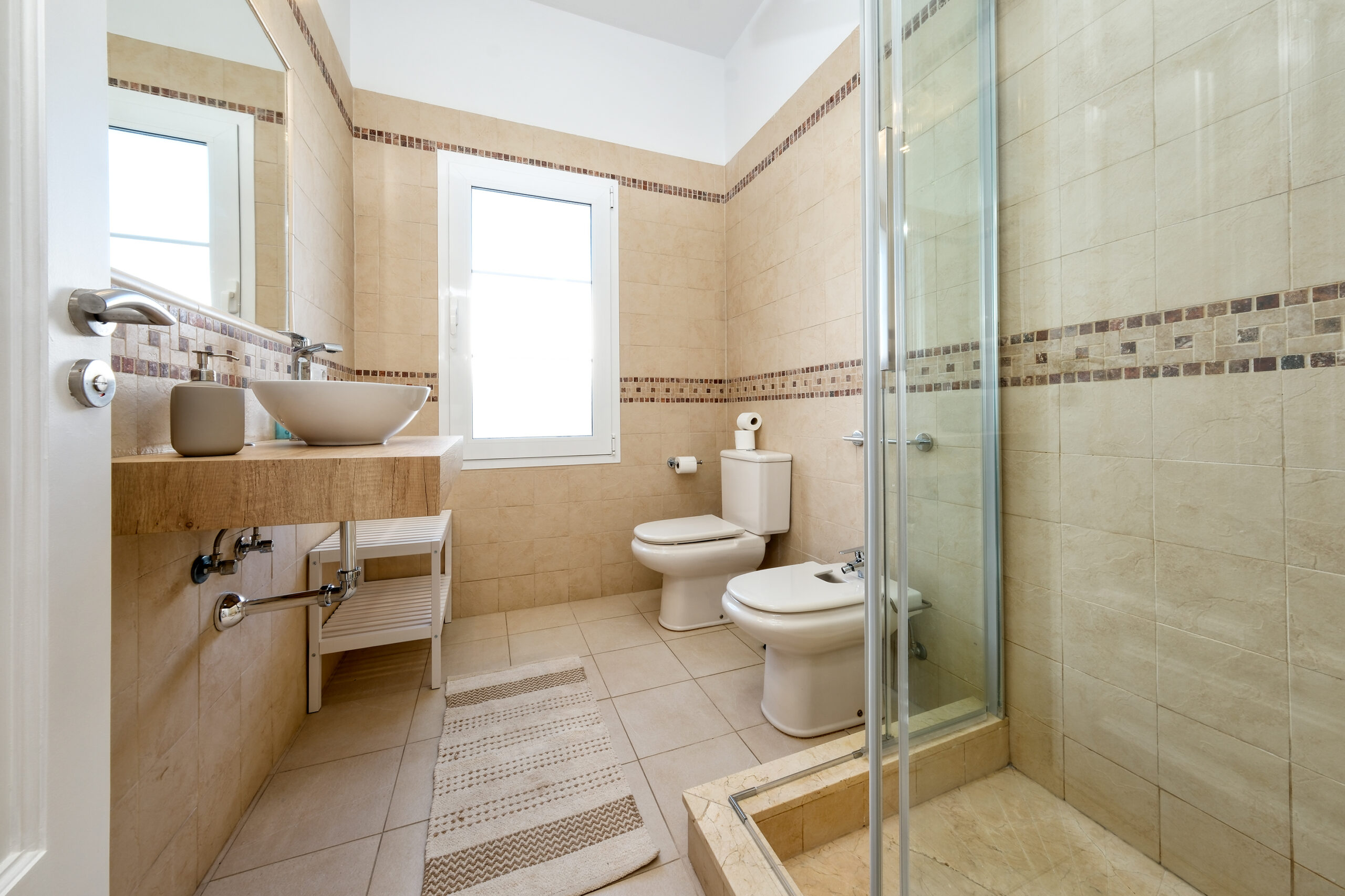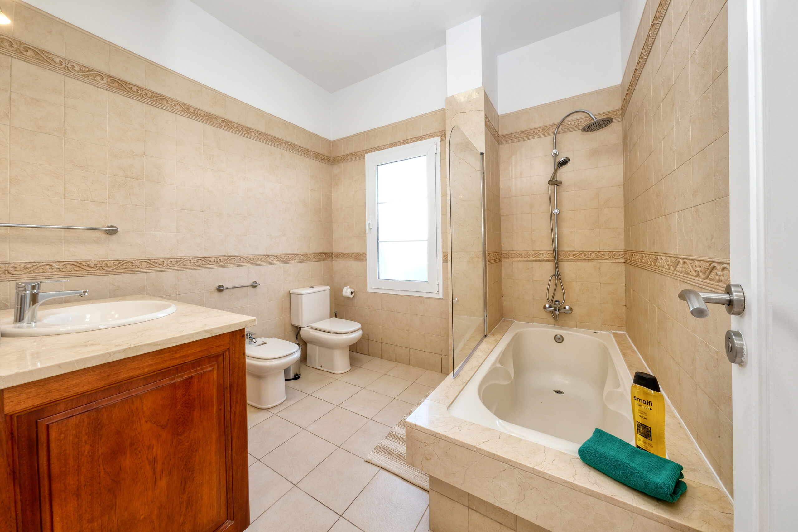 El primer dormitorio cuenta con dos camas individuales, aire acondicionado, televisor, armario empotrado y baño en suite con ducha y bidet. El segundo dormitorio tiene una cama extra grande(180x190), aire acondicionado, televisor, amplio armario con caja fuerte y baño en suite con bañera. El tercer dormitorio dispone también de una cama extra grande(180x200), aire acondicionado, Smart TV y baño en suite con ducha. En total, la villa cuenta con tres baños completos y un aseo adicional, todos equipados con secador de pelo.