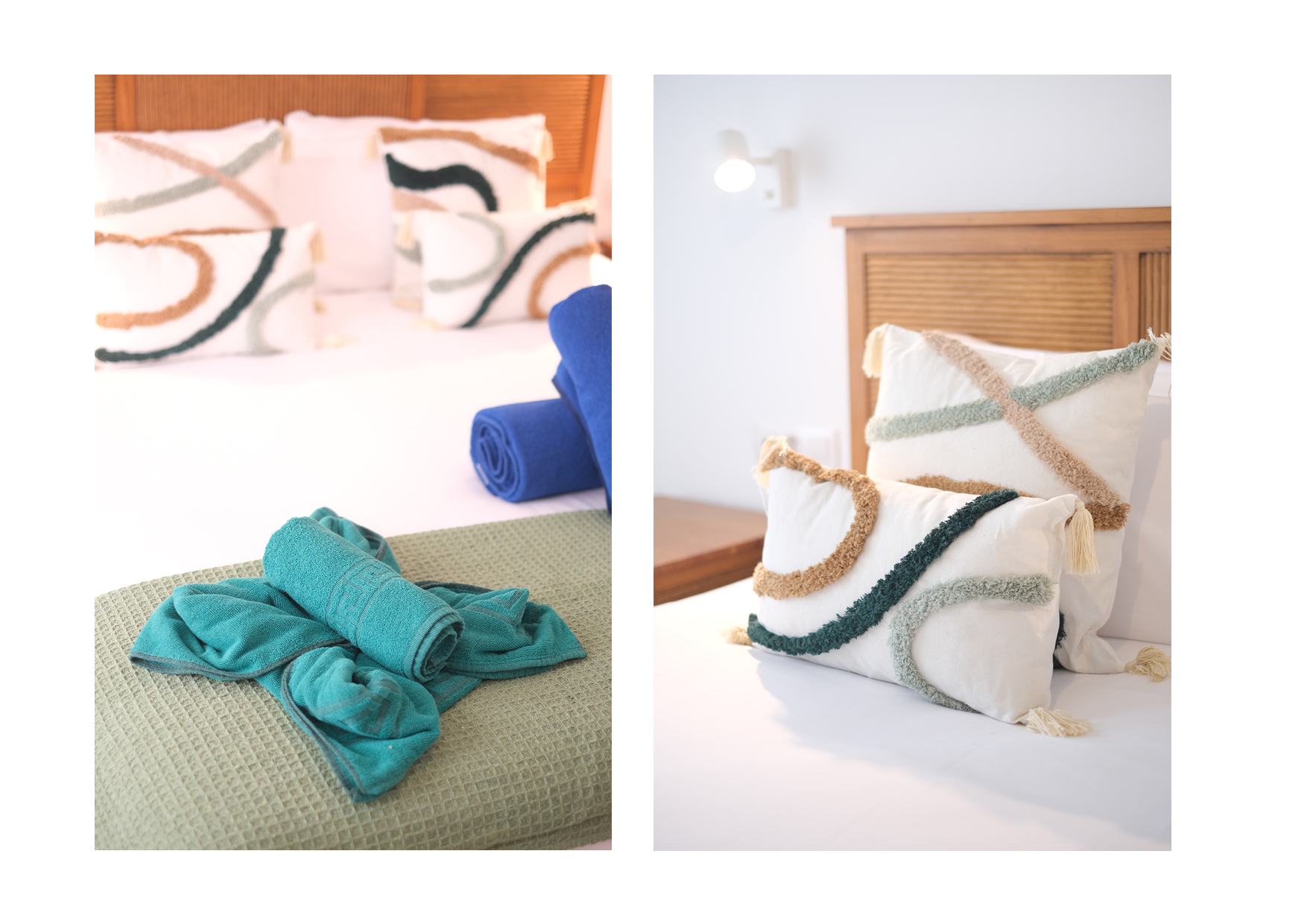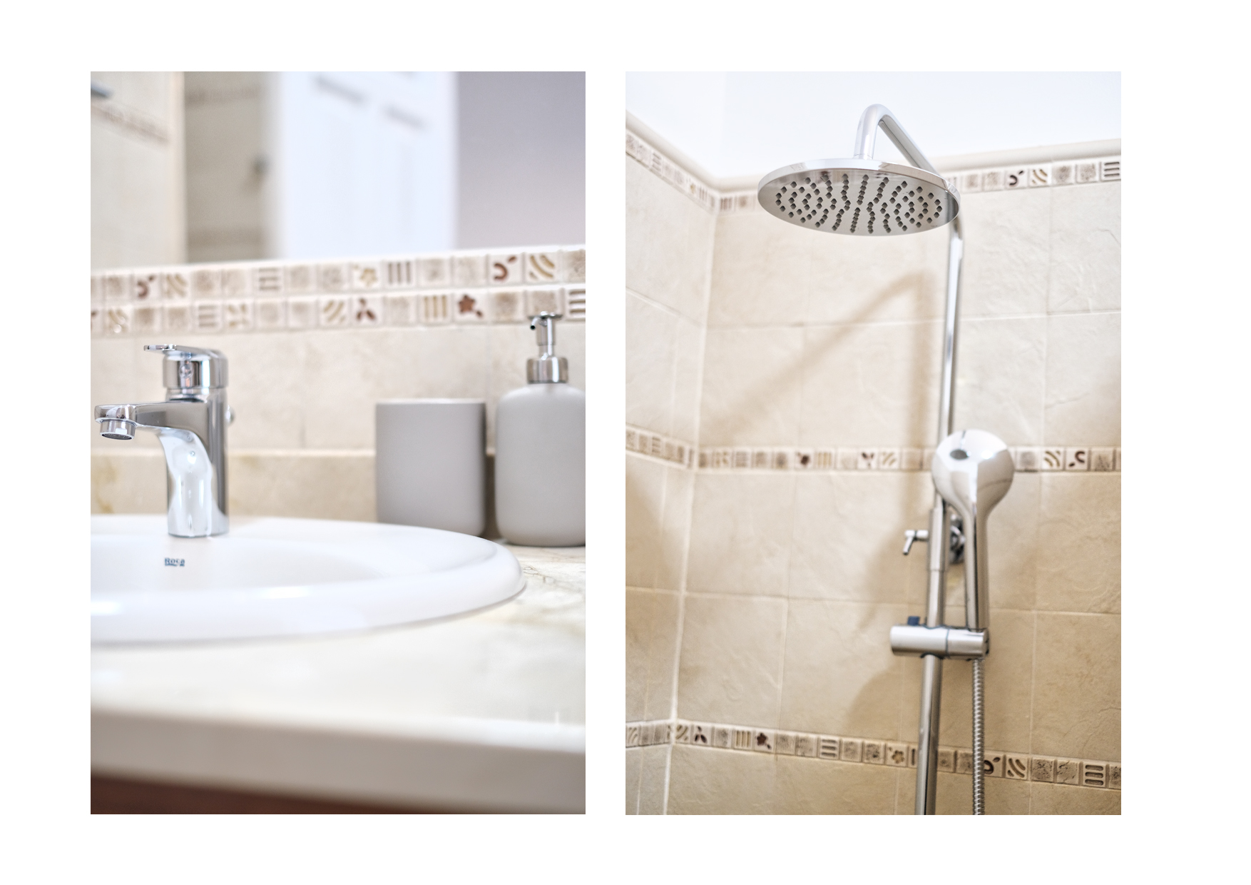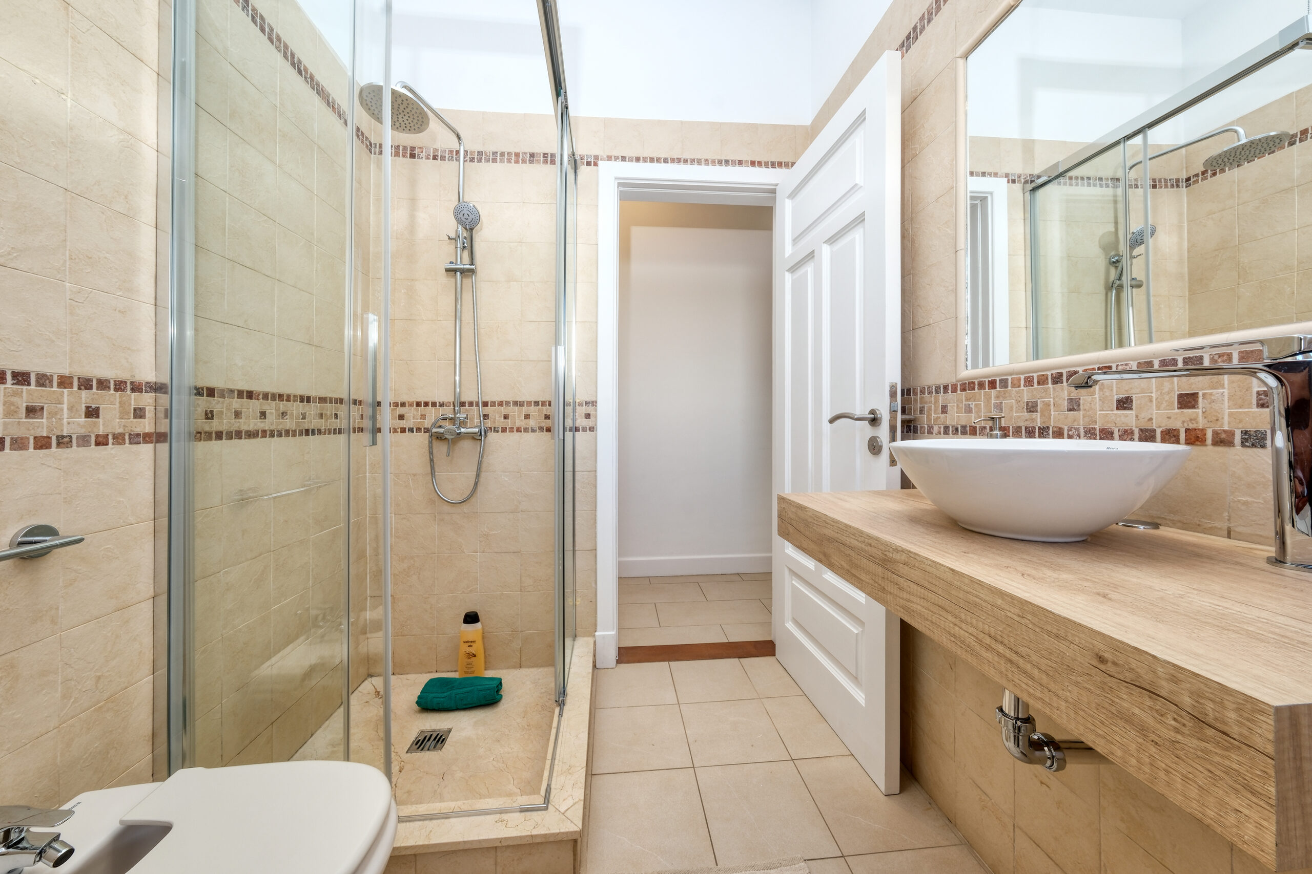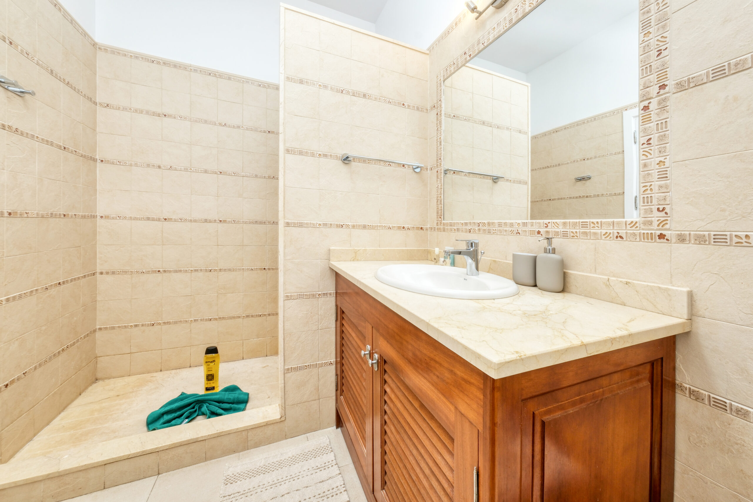 El primer dormitorio cuenta con dos camas individuales, aire acondicionado, televisor, armario empotrado y baño en suite con ducha y bidet. El segundo dormitorio tiene una cama extra grande(180x190), aire acondicionado, televisor, amplio armario con caja fuerte y baño en suite con bañera. El tercer dormitorio dispone también de una cama extra grande(180x200), aire acondicionado, Smart TV y baño en suite con ducha. En total, la villa cuenta con tres baños completos y un aseo adicional, todos equipados con secador de pelo.