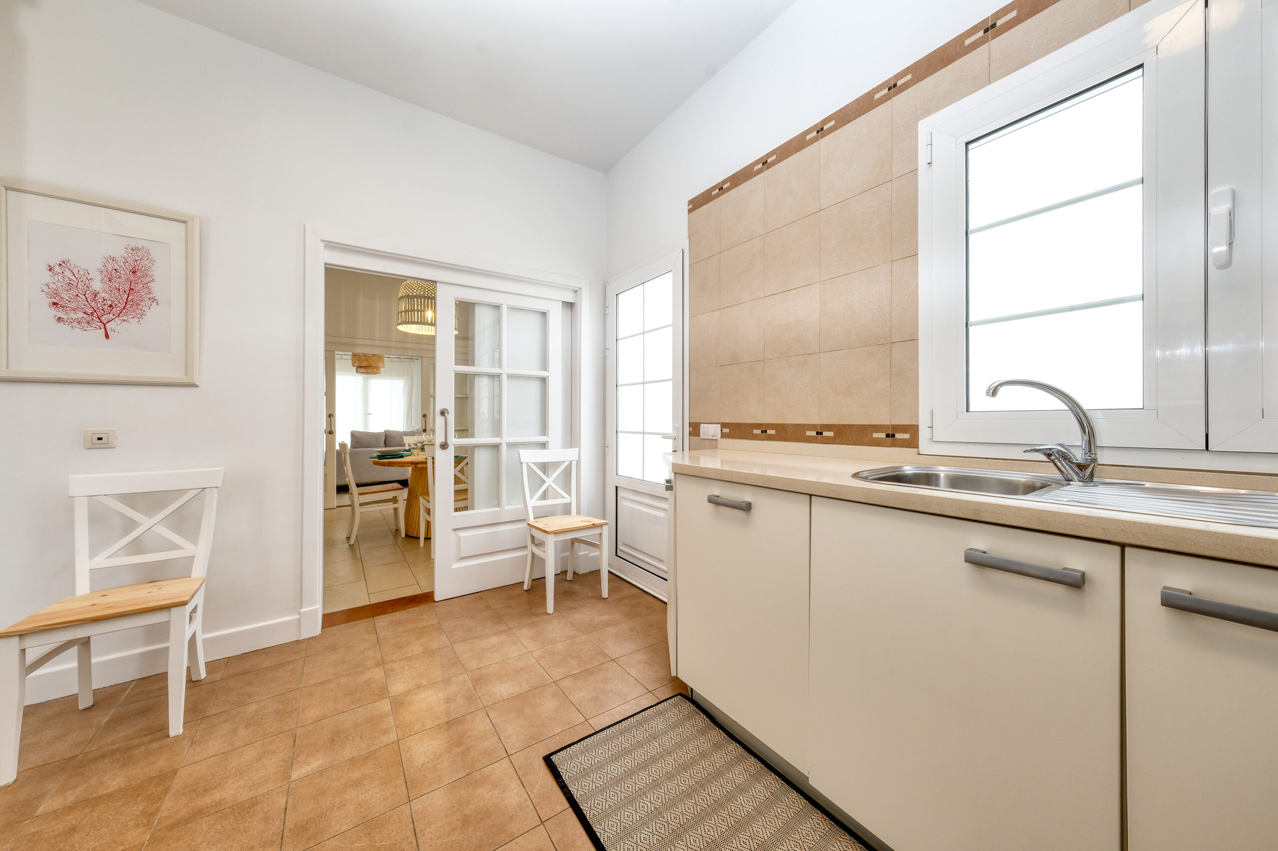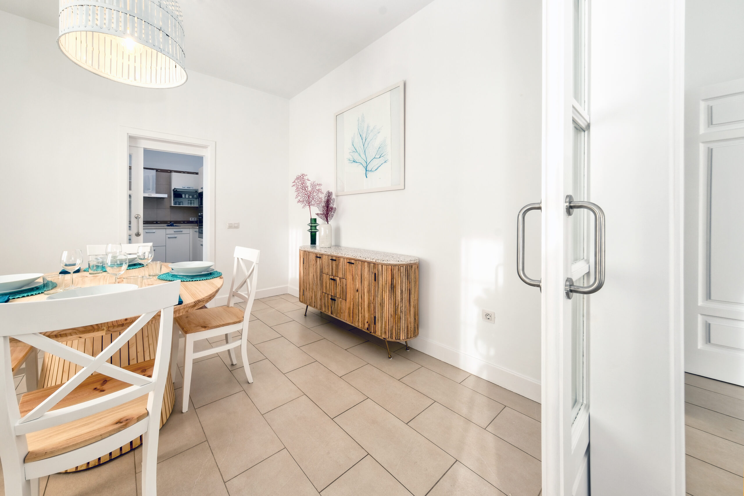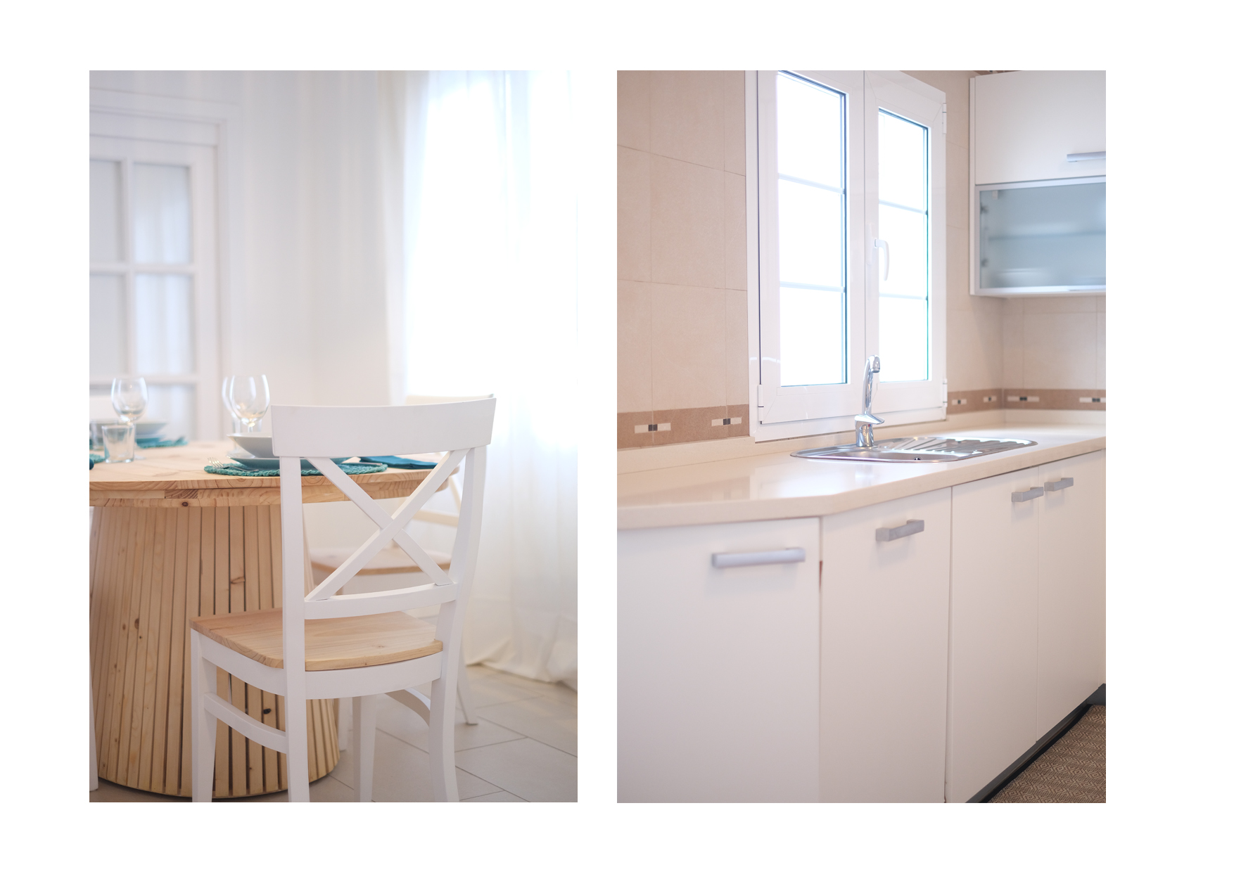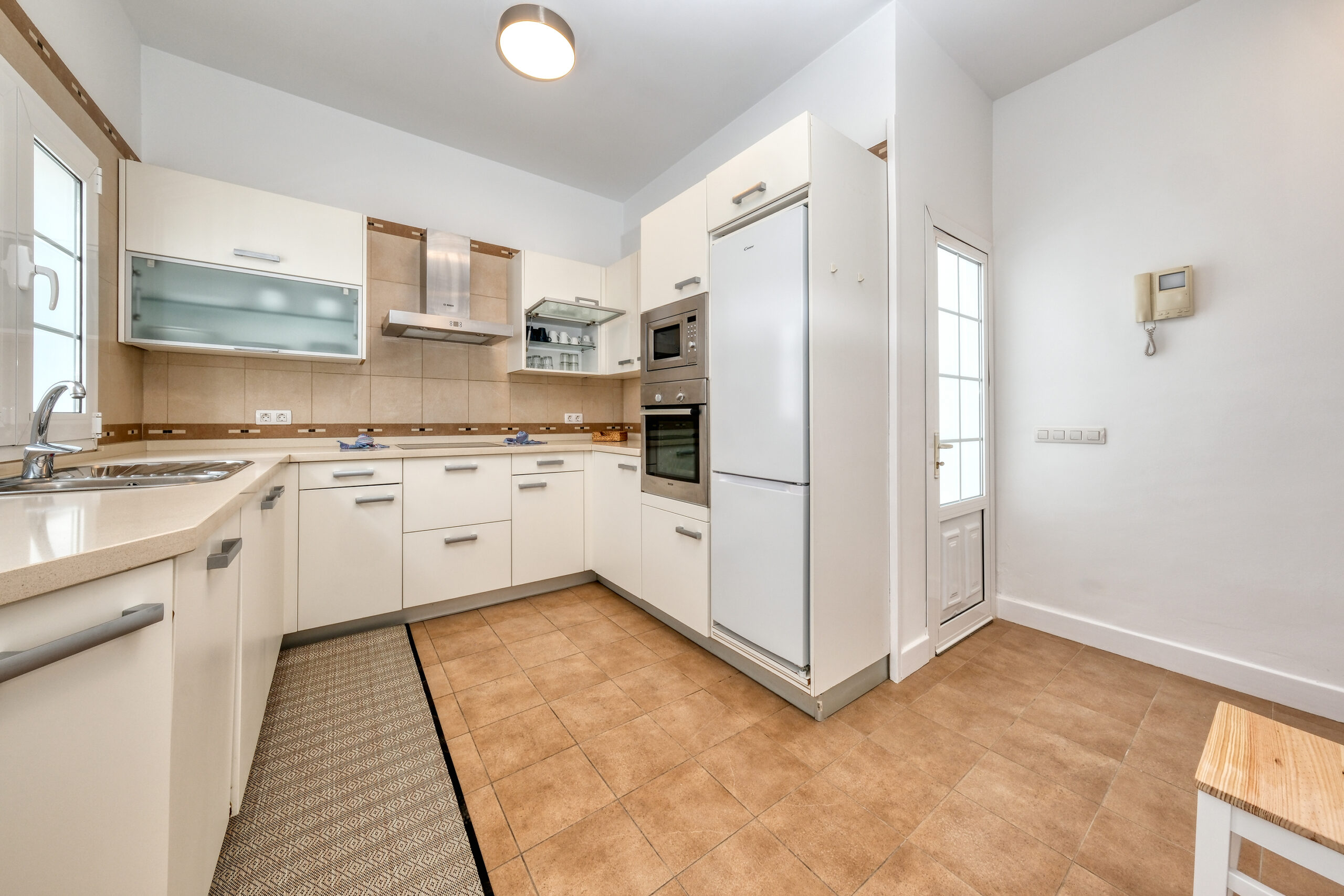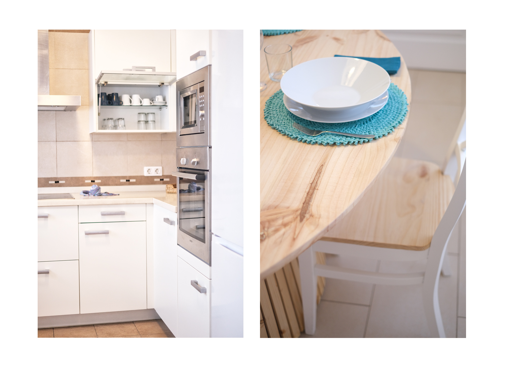 La cocina es amplia y está totalmente equipada, con vitrocerámica de cuatro fuegos, horno, microondas, nevera, tostadora, cafetera, hervidor de agua y menaje completo para seis personas. Un comedor independiente separa la cocina del salón, creando un espacio perfecto para disfrutar de comidas en familia o con amigos.
