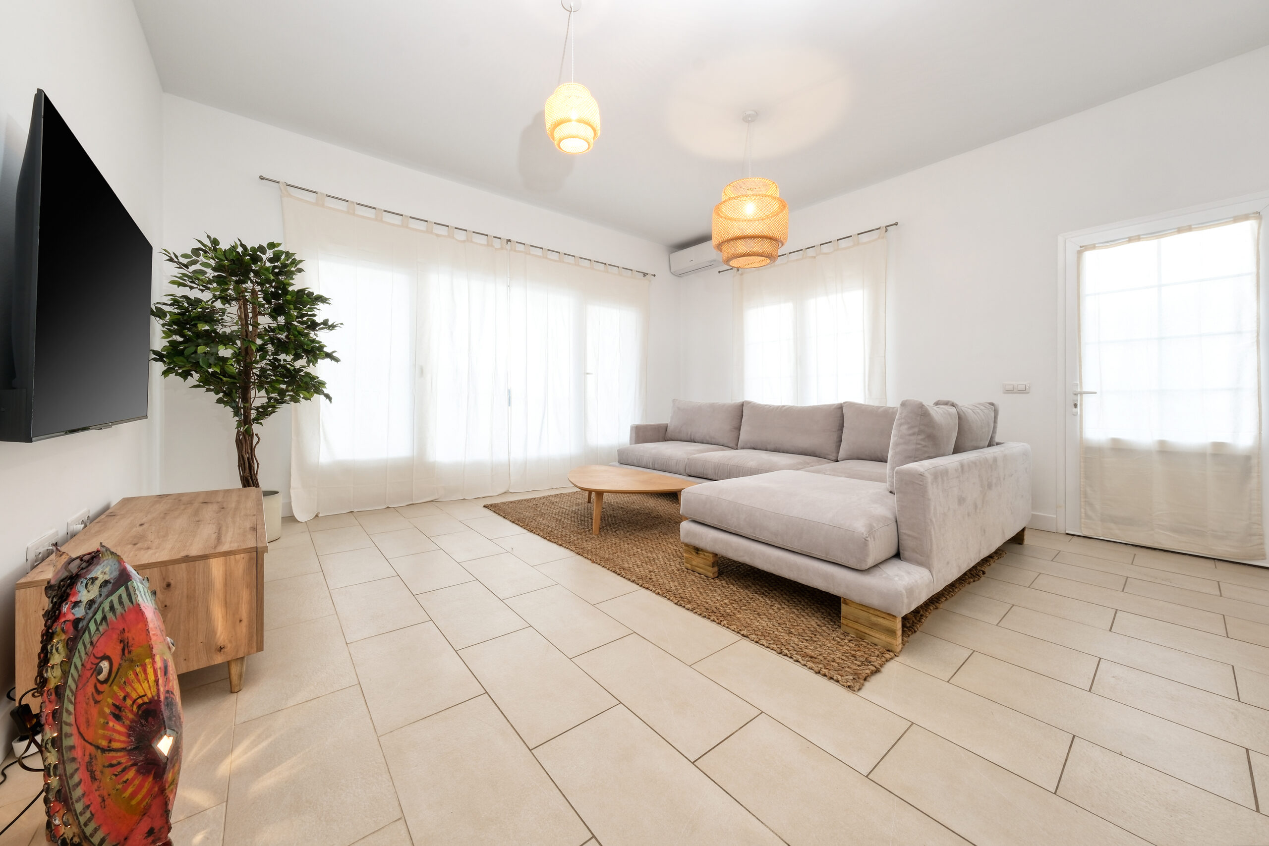 El salón es amplio y confortable, con un gran sofá, Smart TV con canales internacionales y aire acondicionado. La villa cuenta con conexión Wi-Fi de alta velocidad, ideal para quienes necesitan trabajar o conectarse en línea durante su estancia.