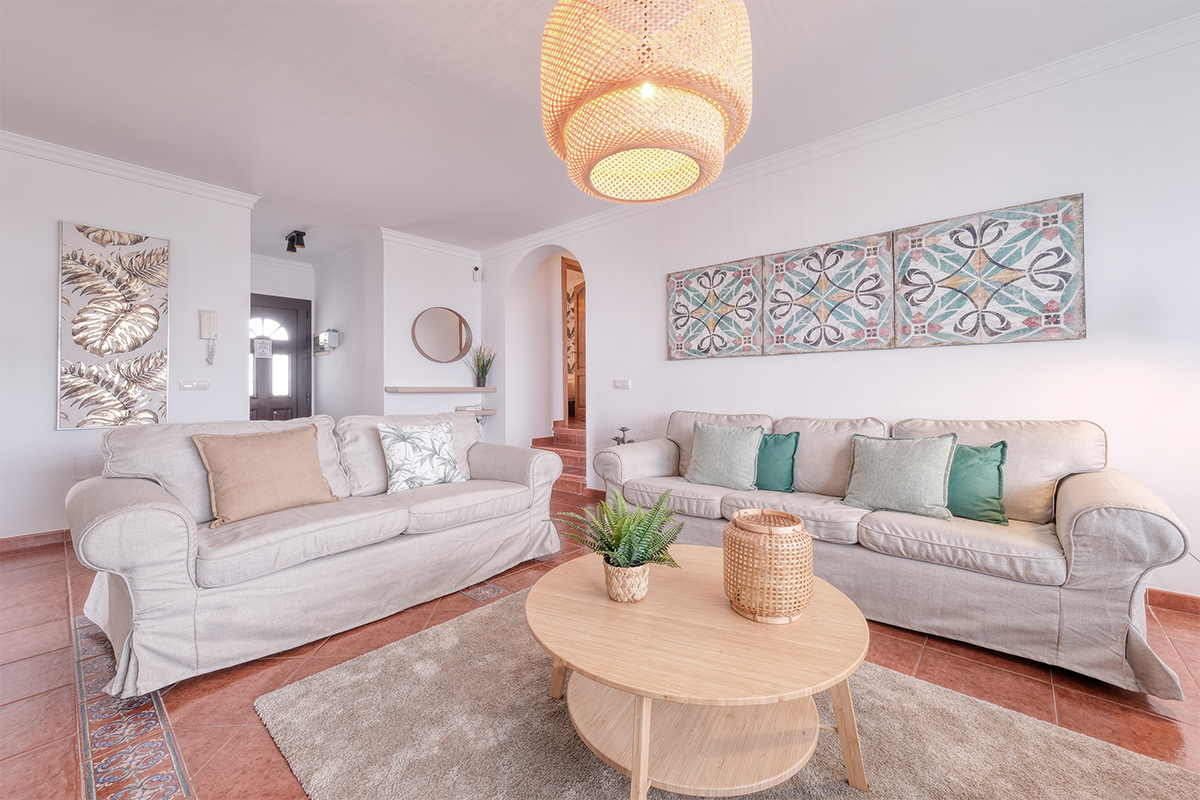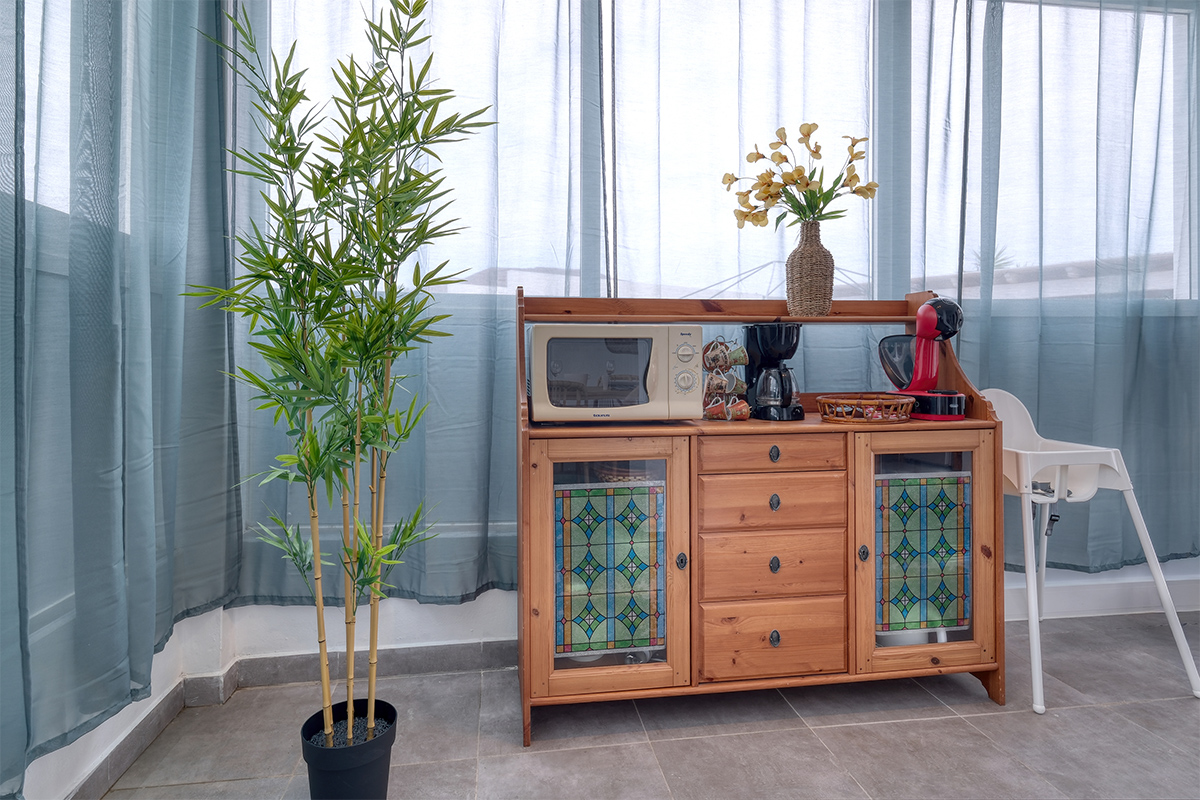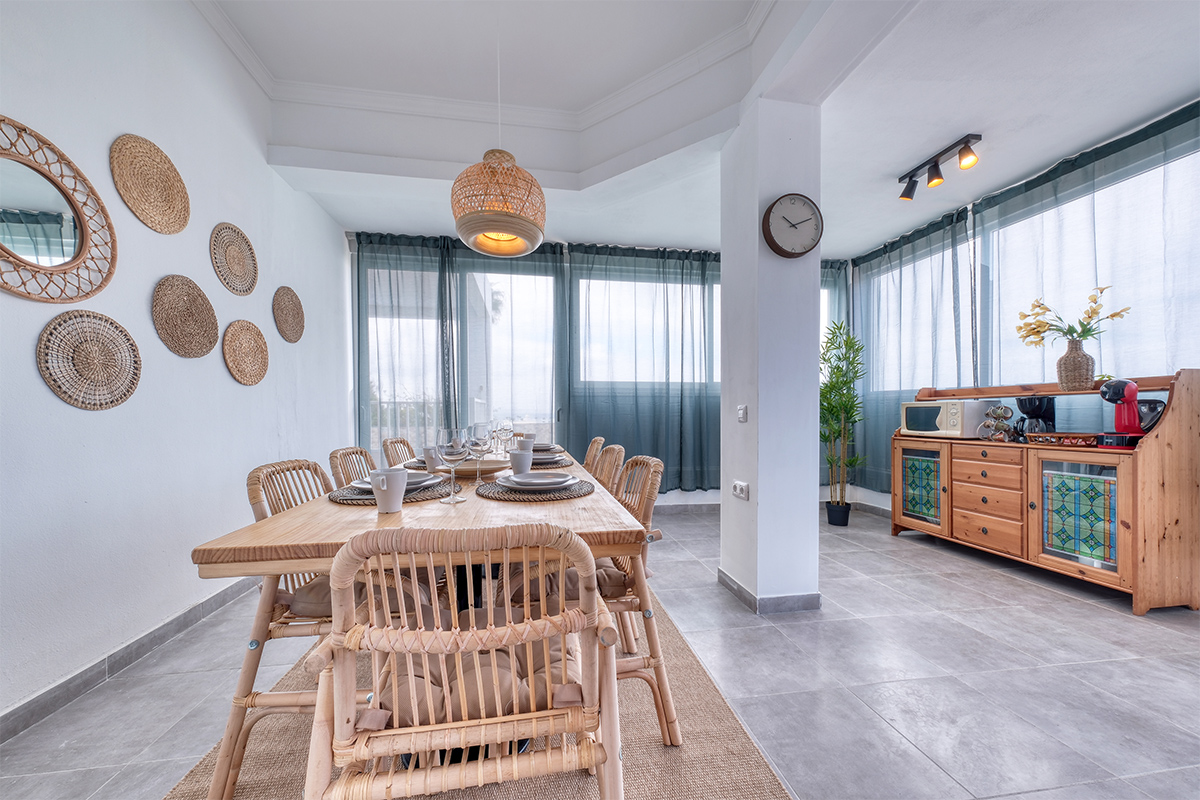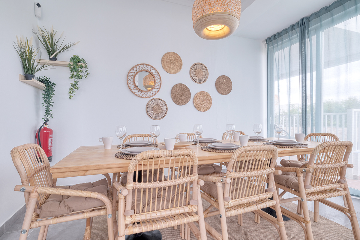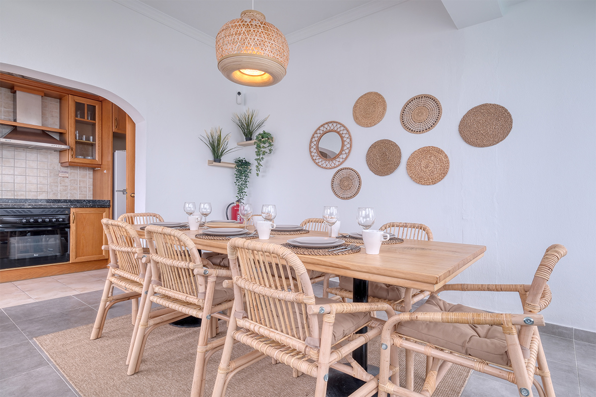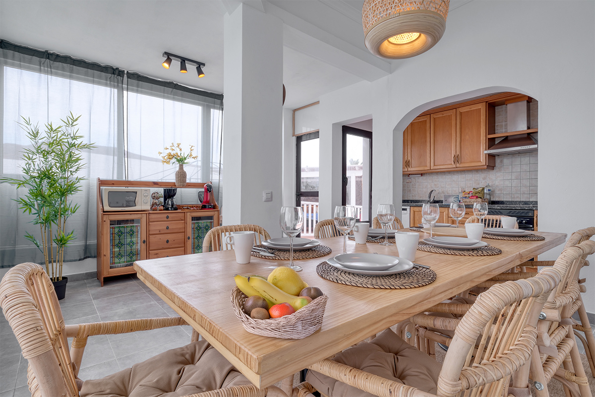 La villa dispone de una cocina totalmente equipada con vitrocerámica, nevera, congelador, horno, microondas, lavavajillas, cafetera, tostadora y todo el menaje necesario para cocinar con total comodidad durante la estancia. El salón-comedor es amplio, luminoso y acogedor, con acceso directo a la zona exterior, creando un espacio perfecto para compartir momentos en grupo. Además, la vivienda cuenta con wifi de alta velocidad y Smart TV con canales internacionales.