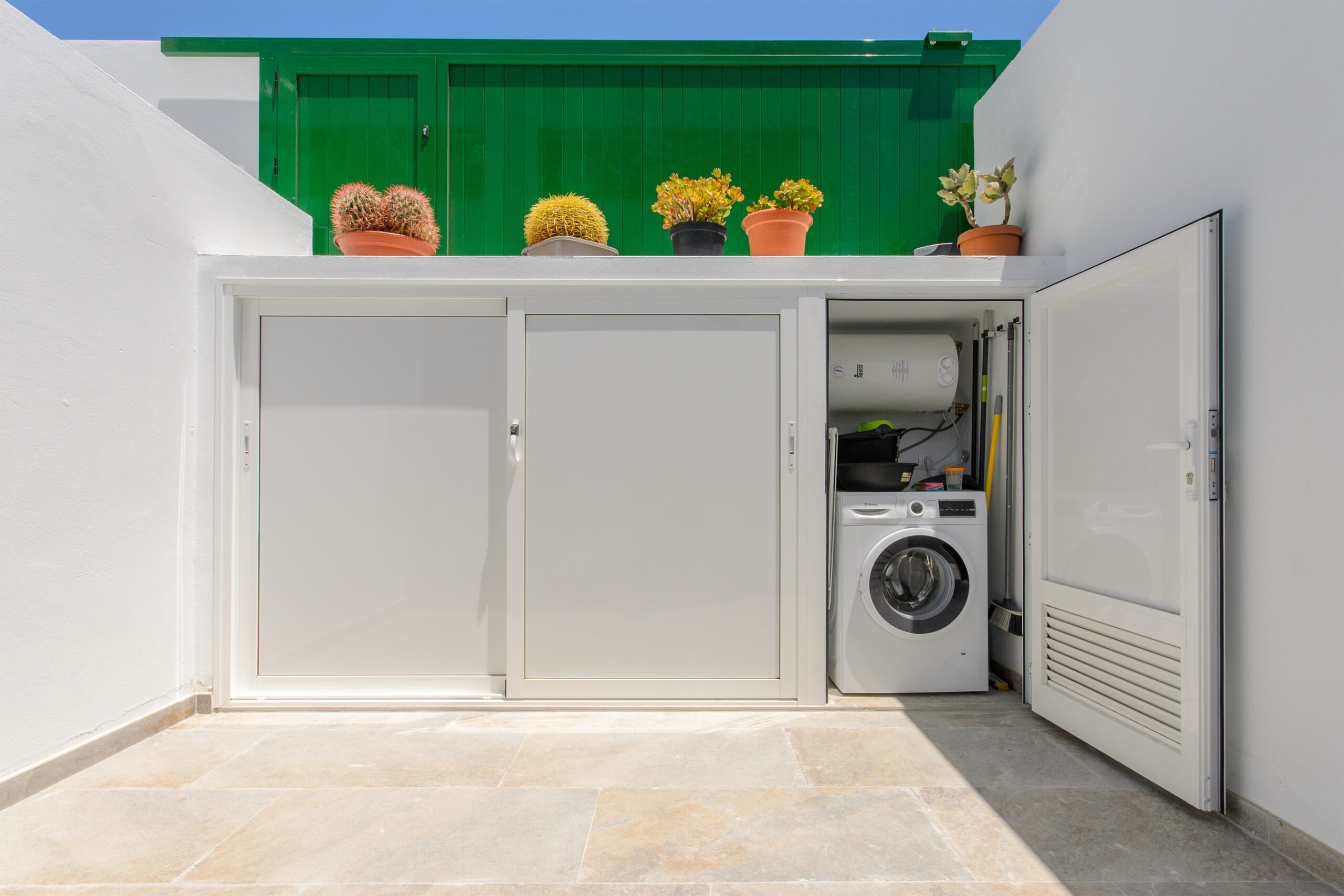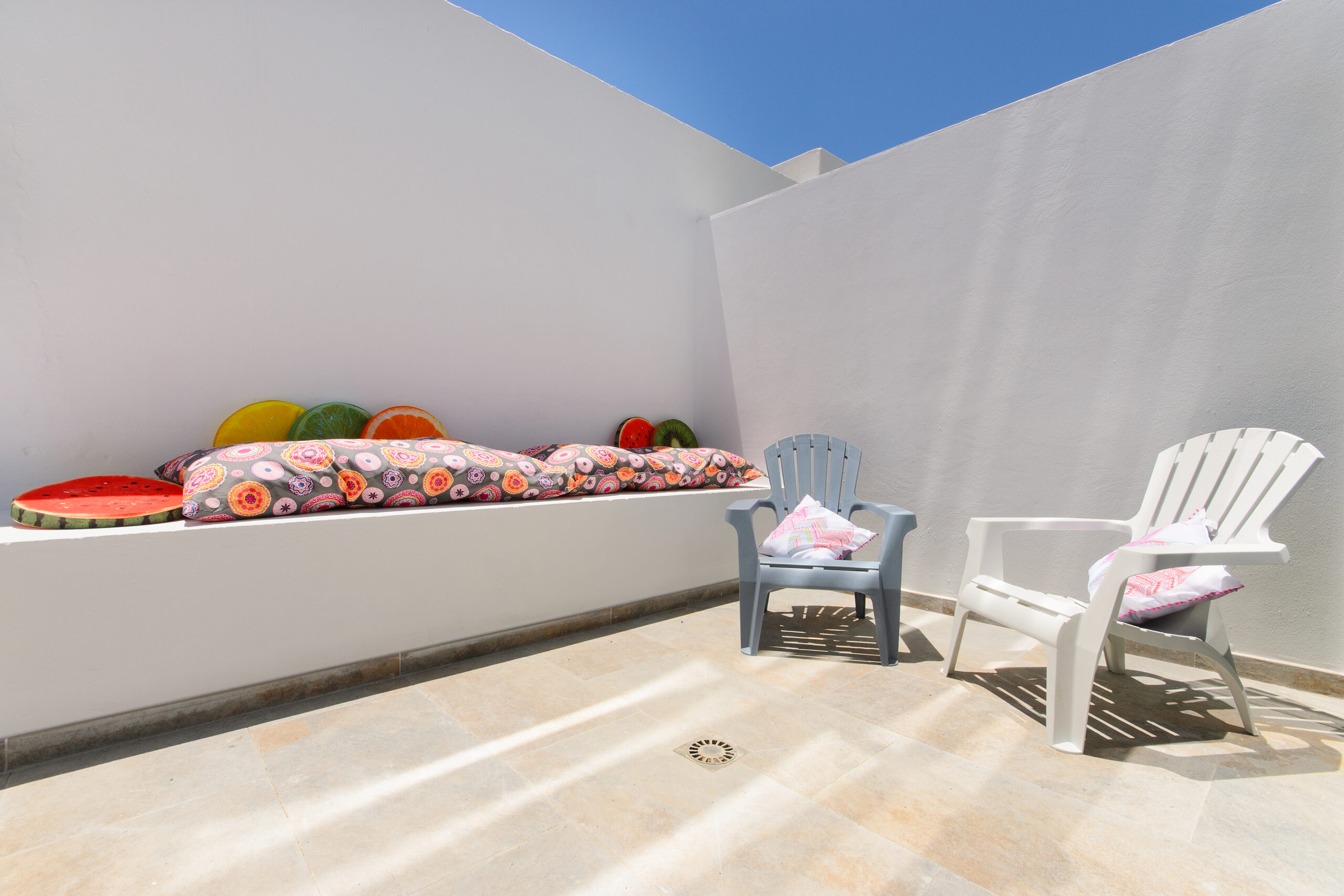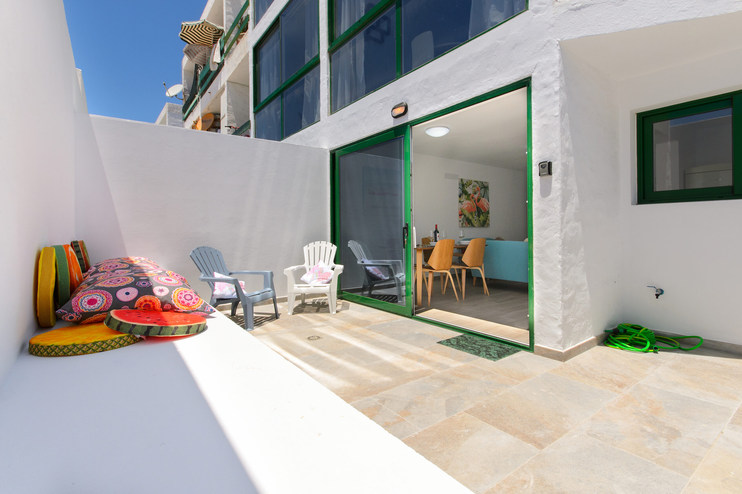 La zona exterior cuenta con dos soleadas terrazas, una por la parte de atrás - con zona chill out para relajarse y acceso directo al salón - y otra por la parte de la entrada principal, donde se encuentra la lavadora. Se puede aparcar gratis en la calle.