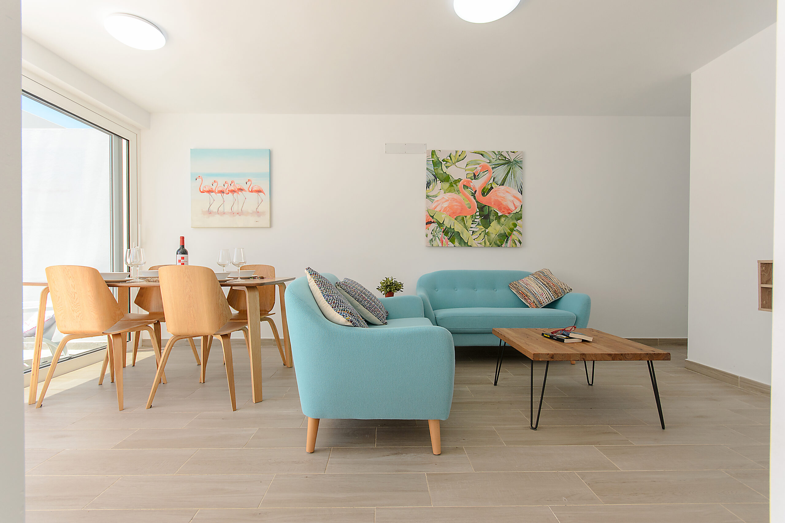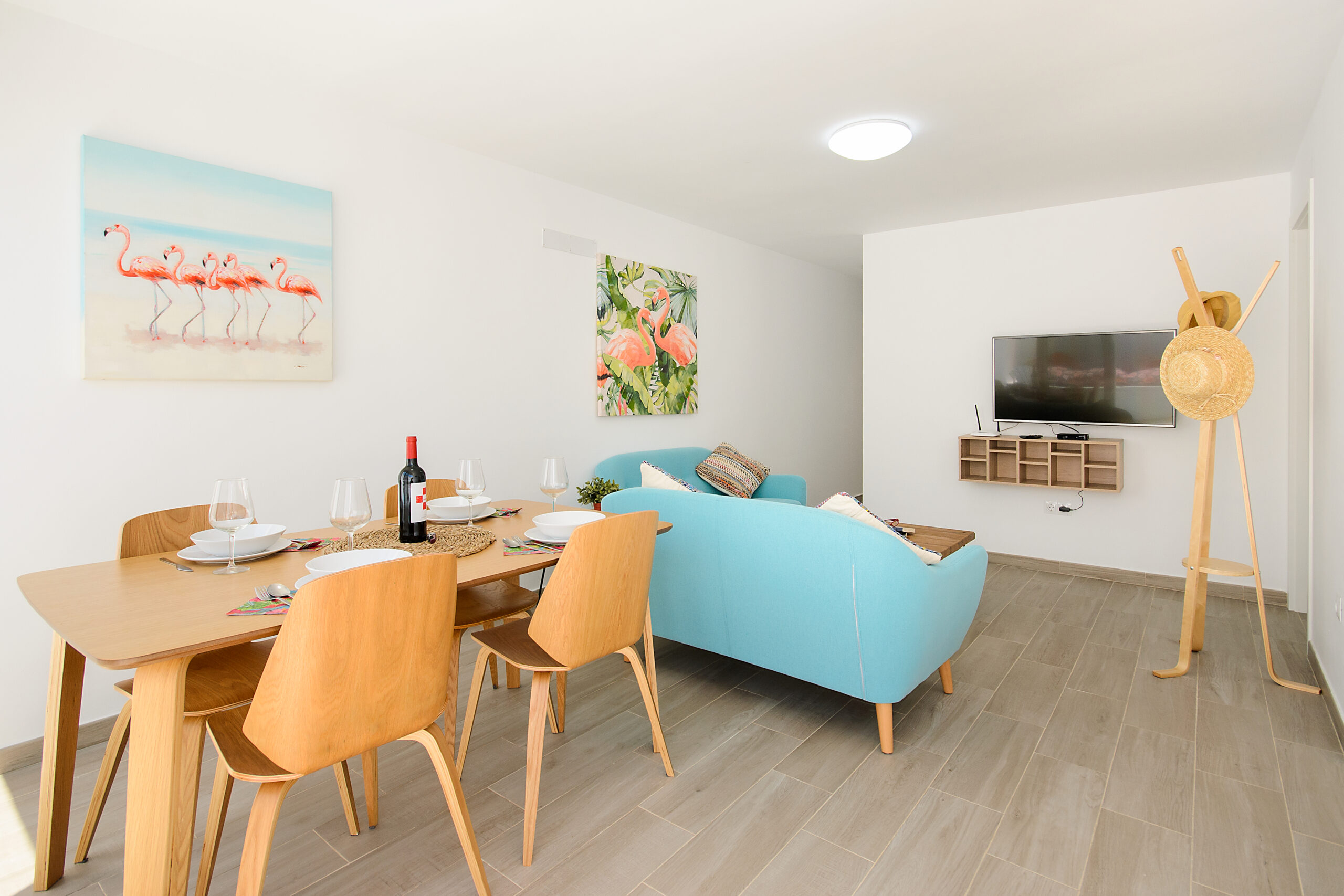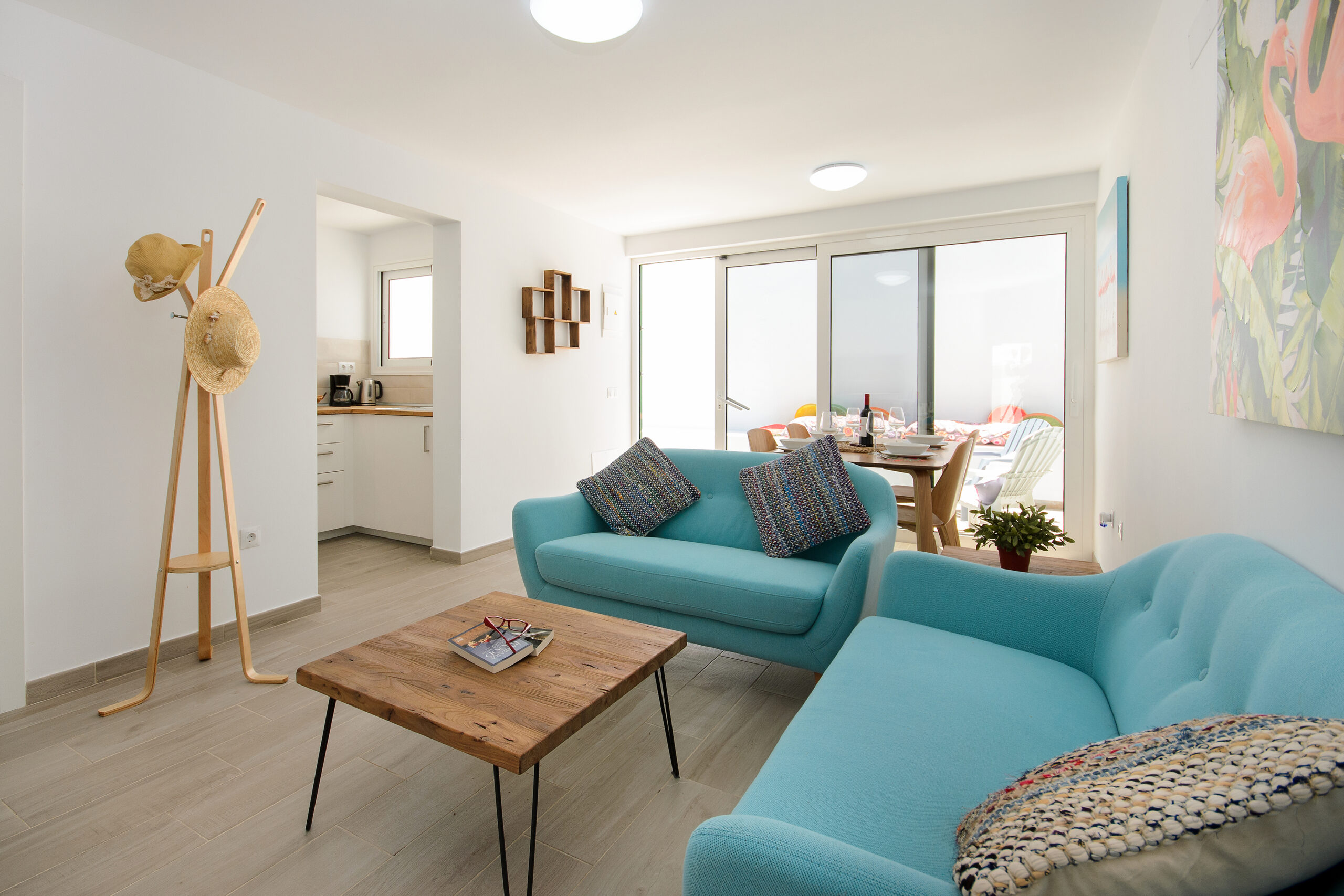 El bonito salón ofrece un cómodo sofá, aire acondicionado y bomba de calor, Smart TV con canales satélite y Internet gratis de alta velocidad con Fibra Óptica de 600MB. Además, cuenta con un espacio de comedor con una espaciosa mesa con sillas de madera.